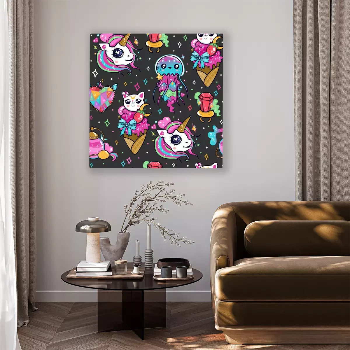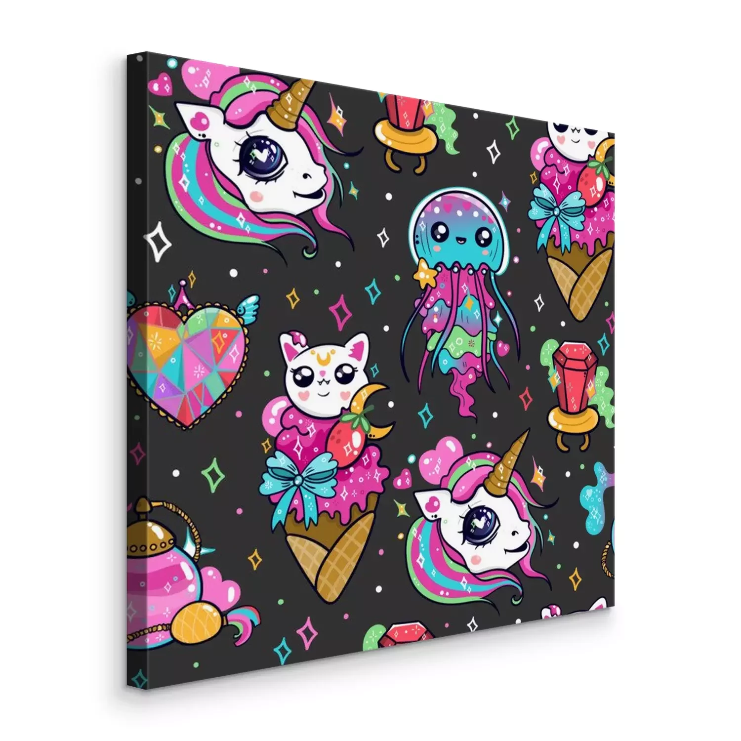 Canvas Various kawaii elements. Hand drawn colored vector seamless pattern. Black background