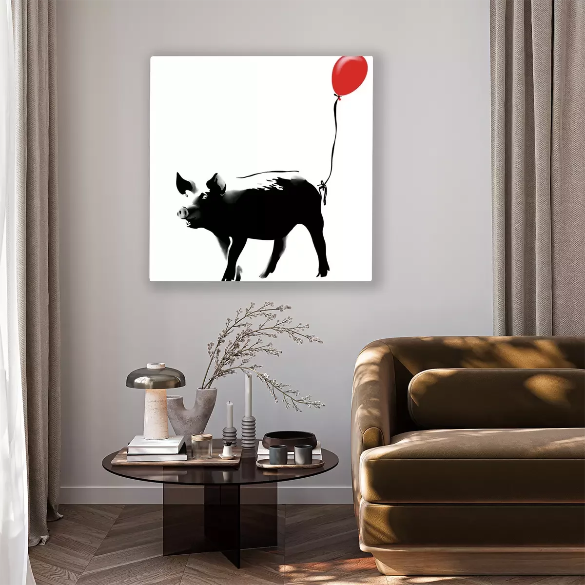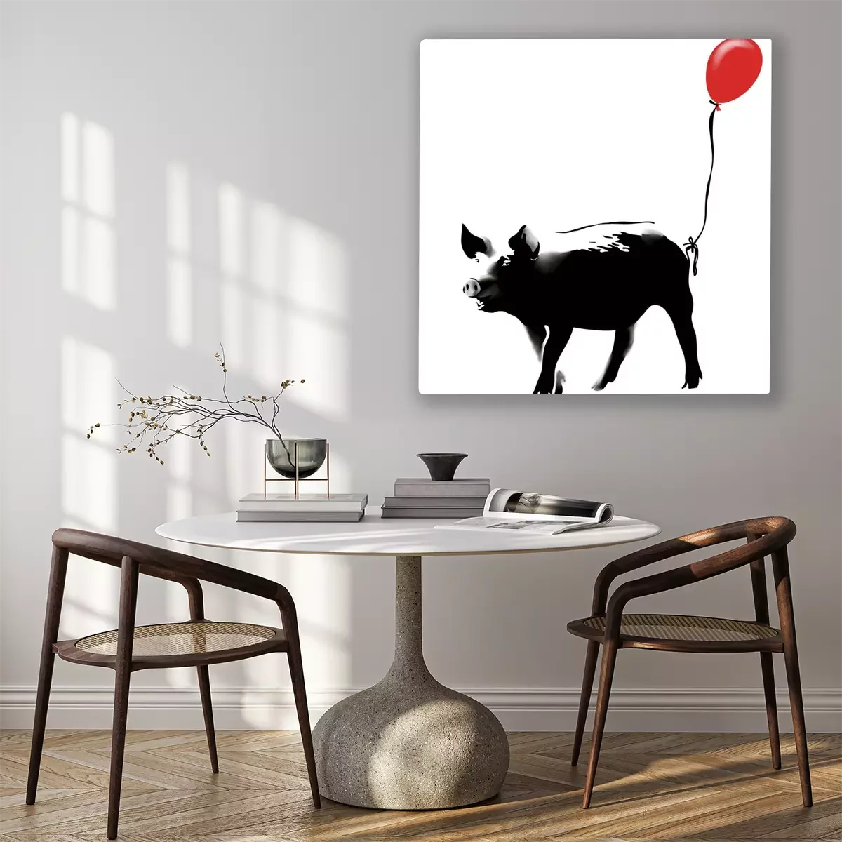 Canvas: Varken met rode ballon in Banksy stijl