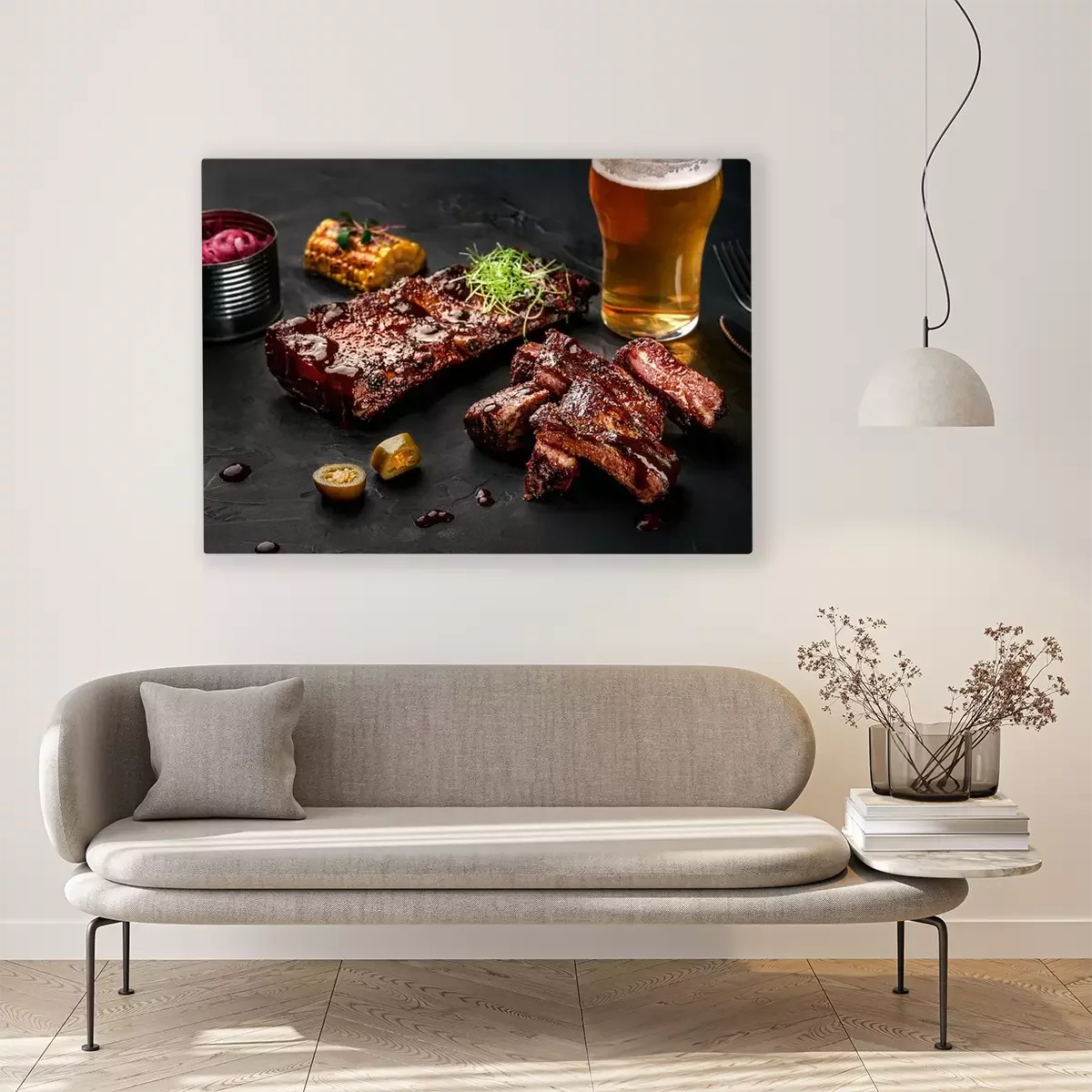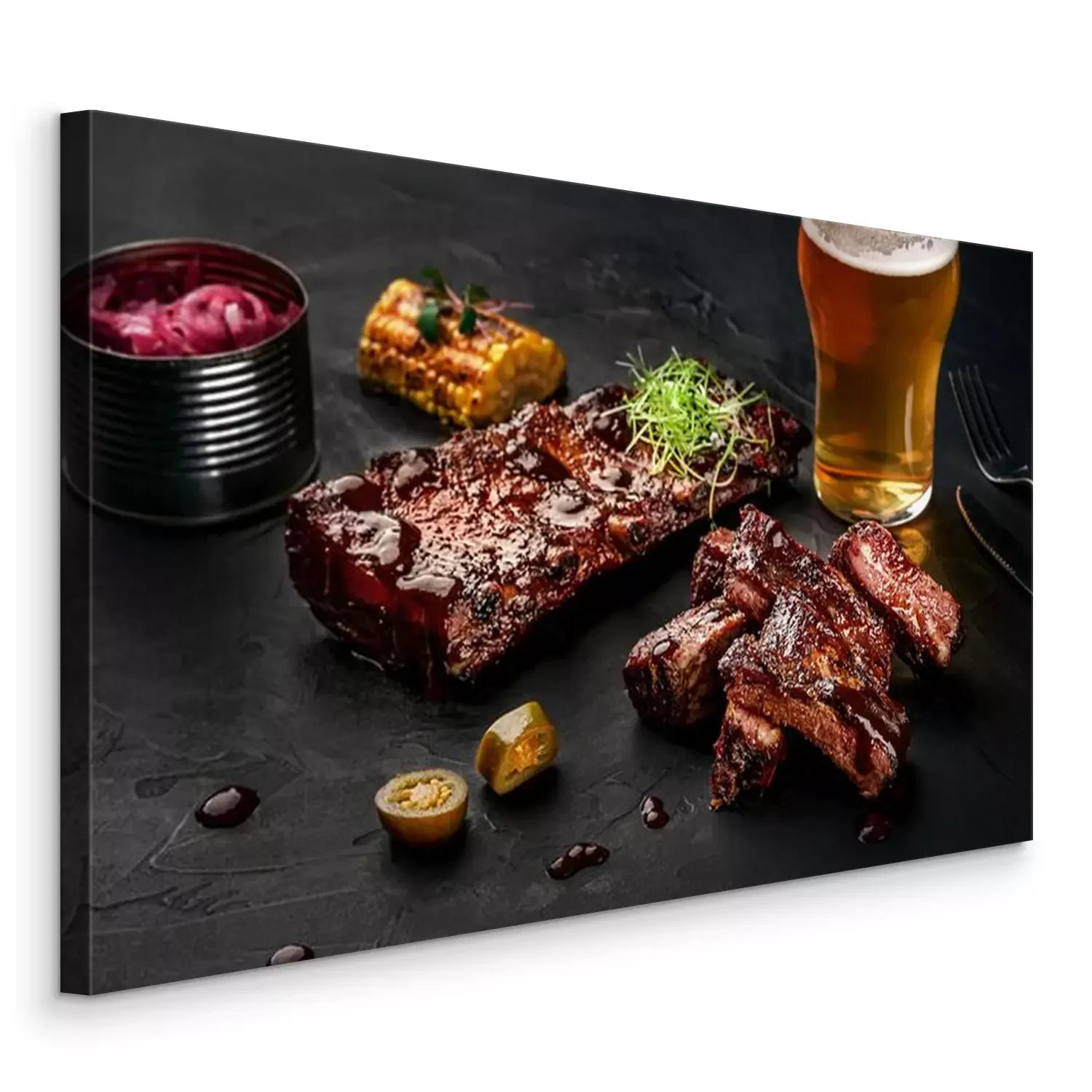 Canvas: Varkensvleesribben in barbecuesaus en een glas bier op een zwarte leischotel. Een grote snack aan bier op een donkere steenachtergrond. Bovenaanzicht met kopie ruimte