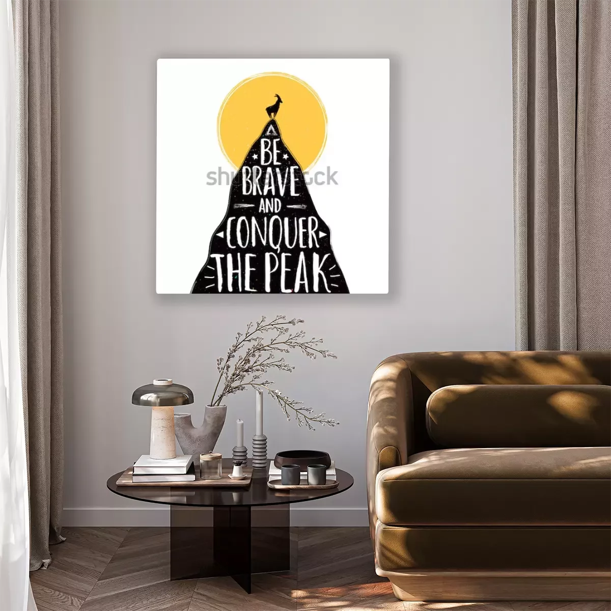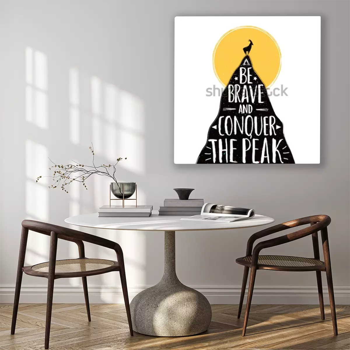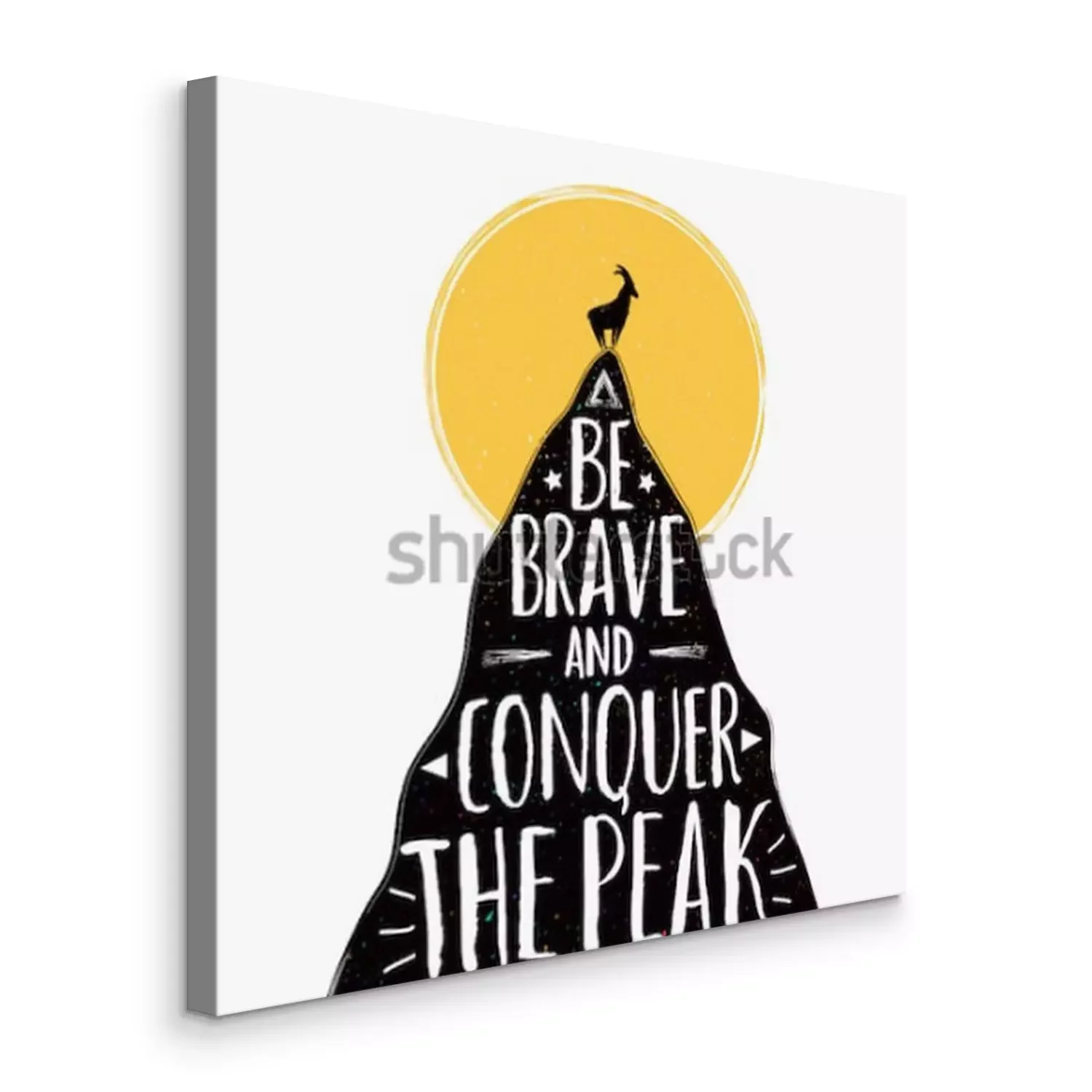 Canvas: Vector illustration with a goat on the top of mountain. Be brave and conquer the peak lettering quote. Inspirational and motivational typography poster with animal