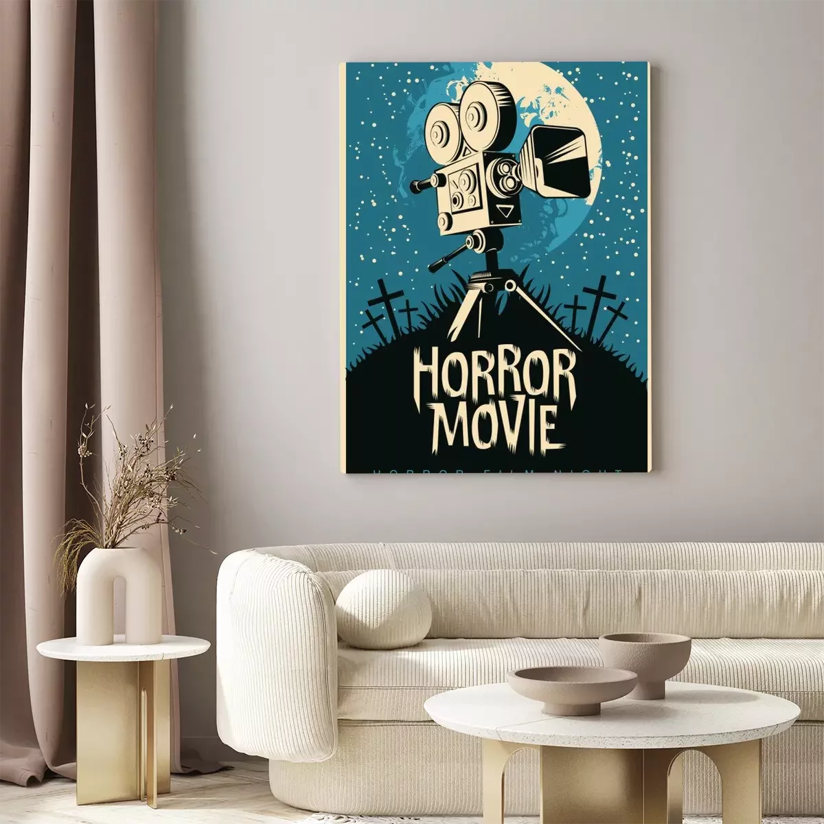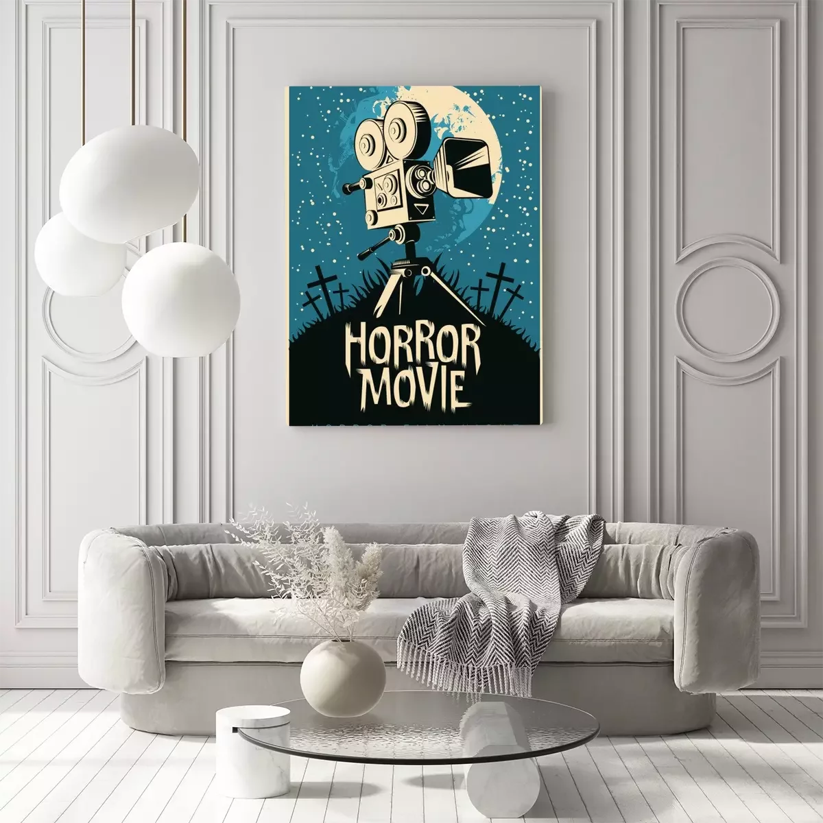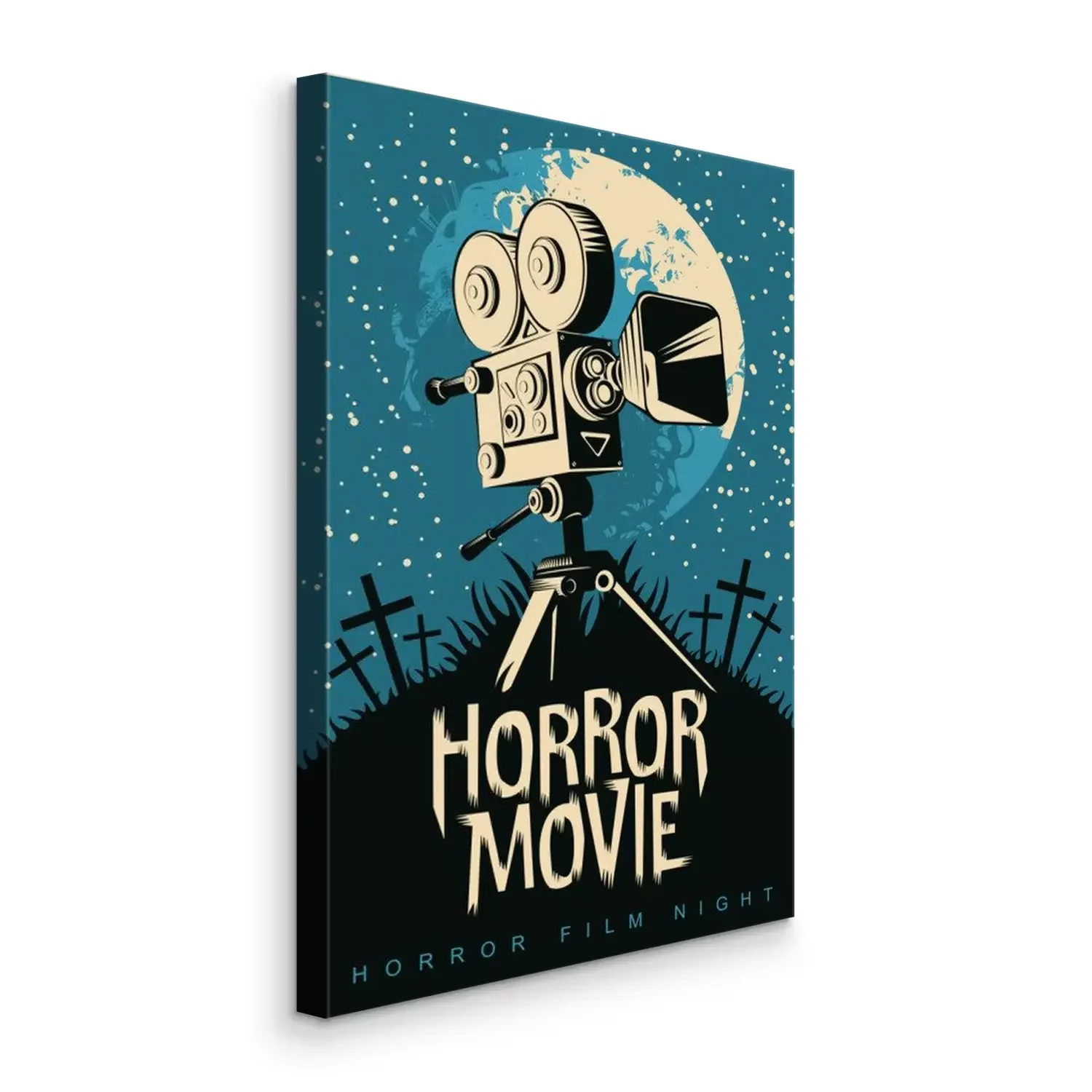 Canvas Vector poster for a festival of horror movie with an old film projector on a cemetery on a moonlit night. Scary cinema. Suitable for poster, flyer, billboard, web design, ticket, advertising