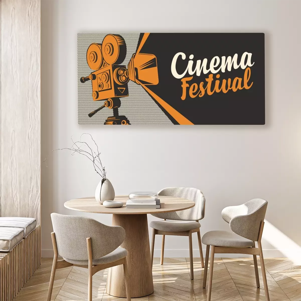 Canvas Vector poster for cinema festival with old fashioned movie projector or camera. Retro movie background with calligraphic inscription. Can be used for flyer, banner, poster, web page, background