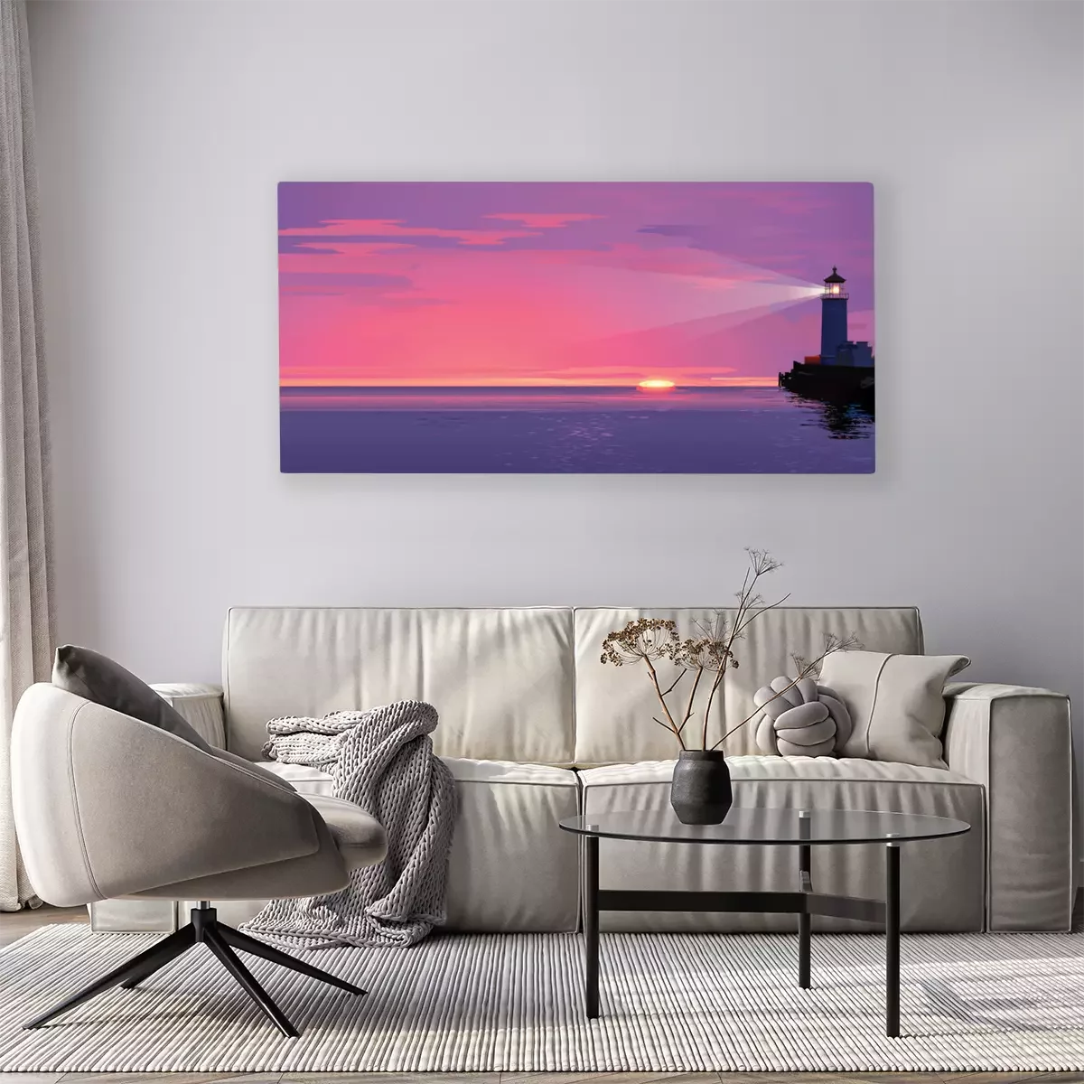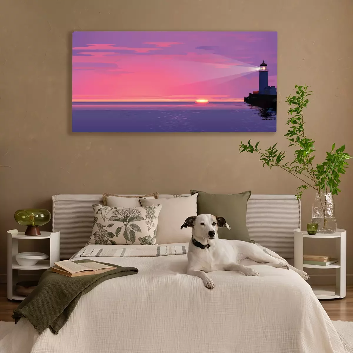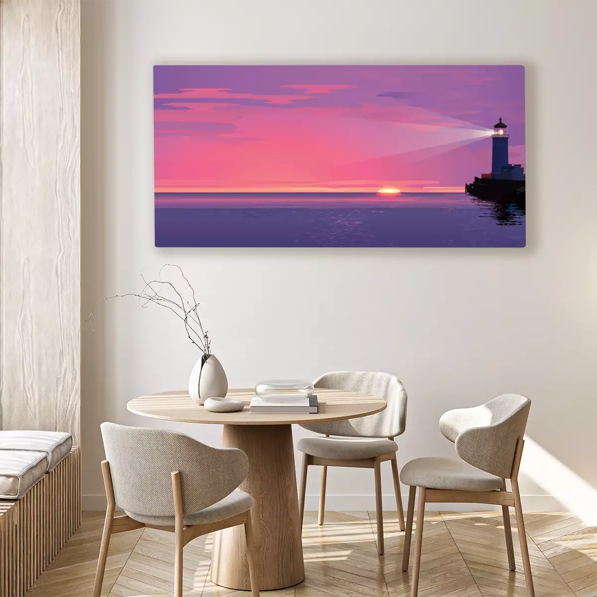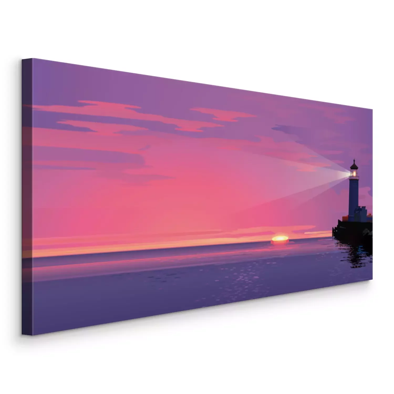 Canvas: Vector sea landscape with lighting lighthouse at sunset or sun rise. Design template in trendy style navigational and travel concept. Biblical Beacon.