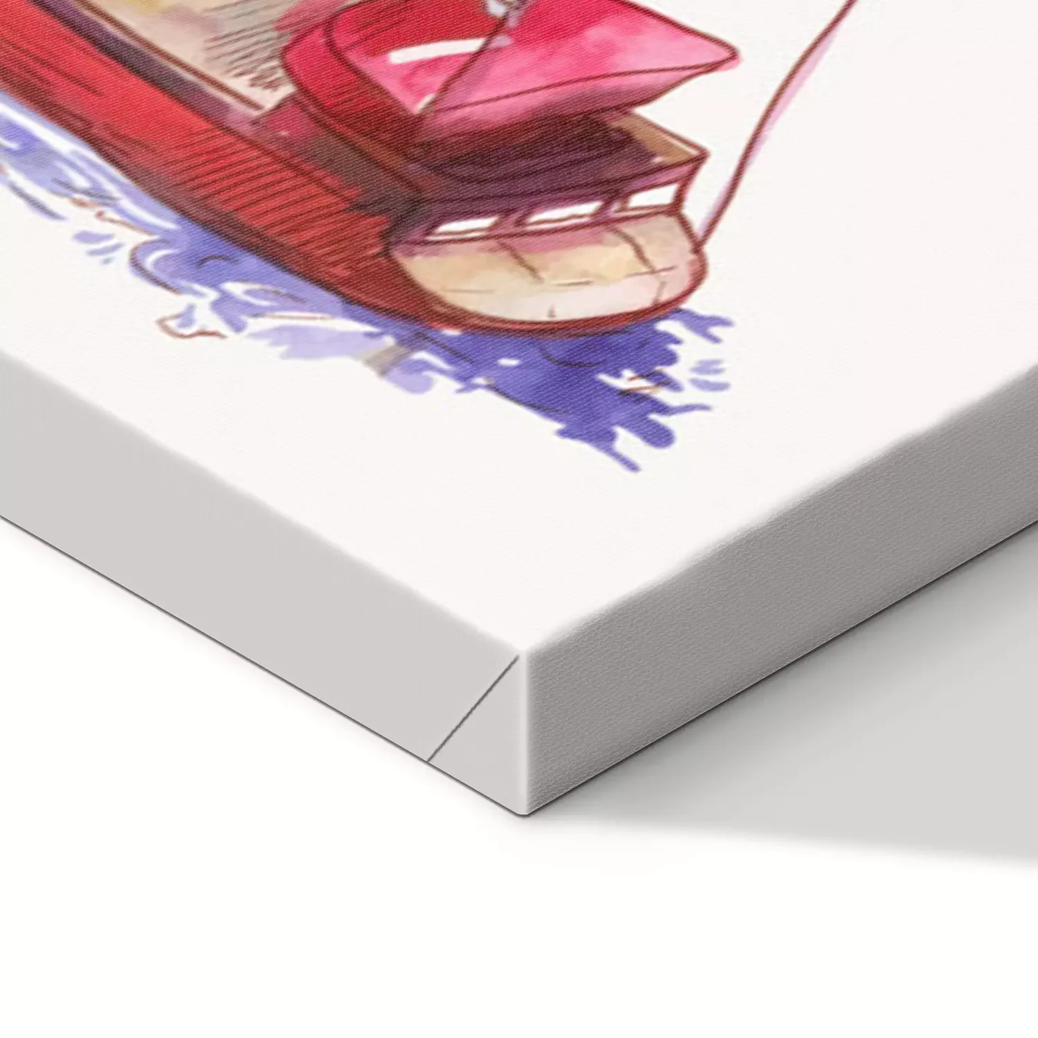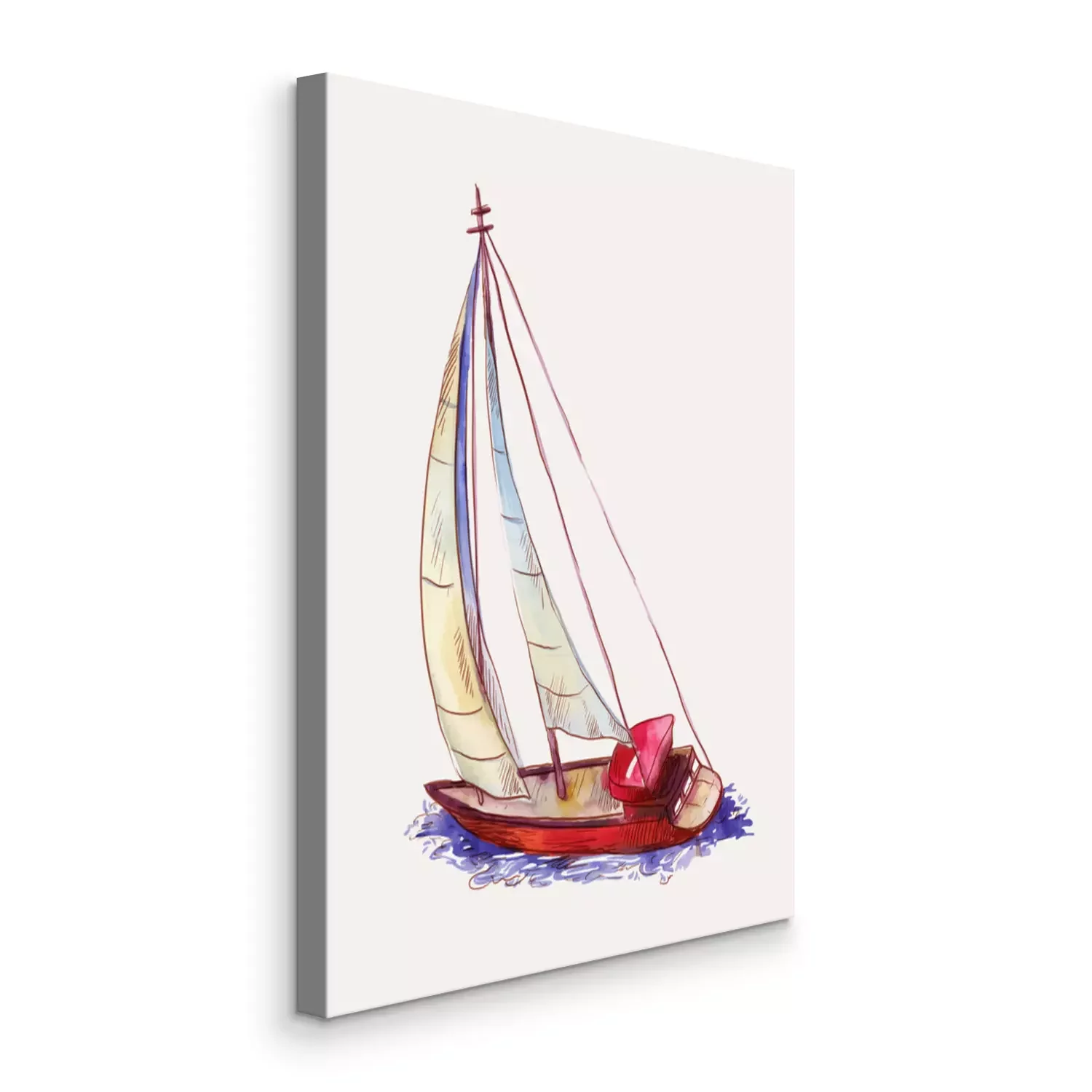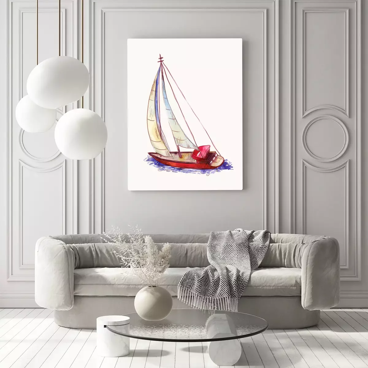 Canvas: Vector watercolor red sailboat isolated on white. Seascape scene in sketch style