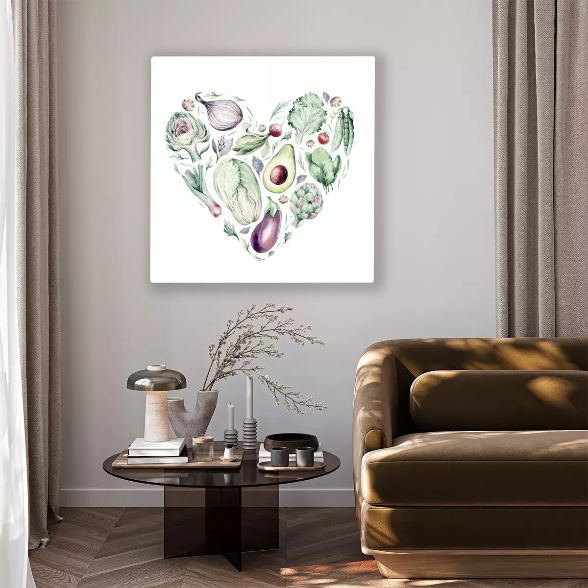 Canvas Vegetables healthy green organic set watercolor heart shape artichoke, broccoli, spinach, celery vitamin Cabbage, leek and onion illustration. Isolated lettuce and radish. sketch eggplant mushroom.