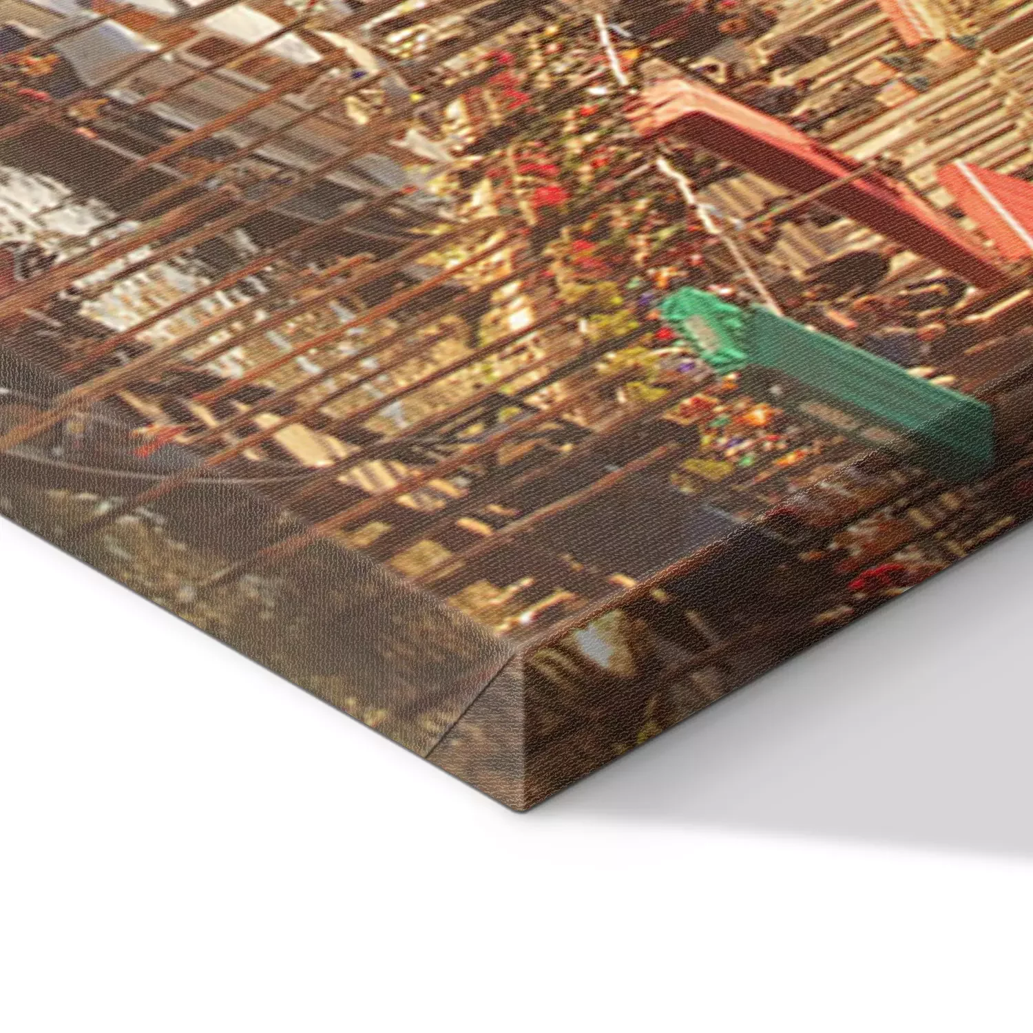 De print wordt aangebracht op hoogwaardig canvas dat op een schildersweefgetouw (spieraam) wordt gespannen. Omdat de print de zijranden bedekt, hoeft het ontwerp niet met een extra kader te worden omlijst. Wij raden ook composities aan die uit meerdere foto's bestaan en zo een coherente compositie vormen.