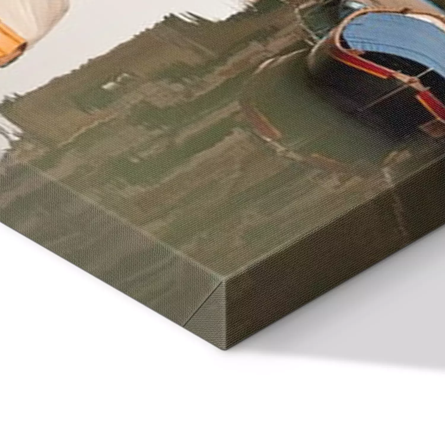De print wordt aangebracht op hoogwaardig canvas dat op een schildersweefgetouw (spieraam) wordt gespannen. Omdat de print de zijranden bedekt, hoeft het ontwerp niet met een extra kader te worden omlijst. Wij raden ook composities aan die uit meerdere foto's bestaan en zo een coherente compositie vormen.