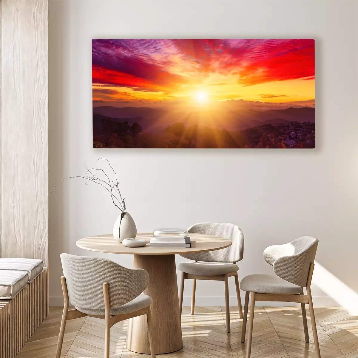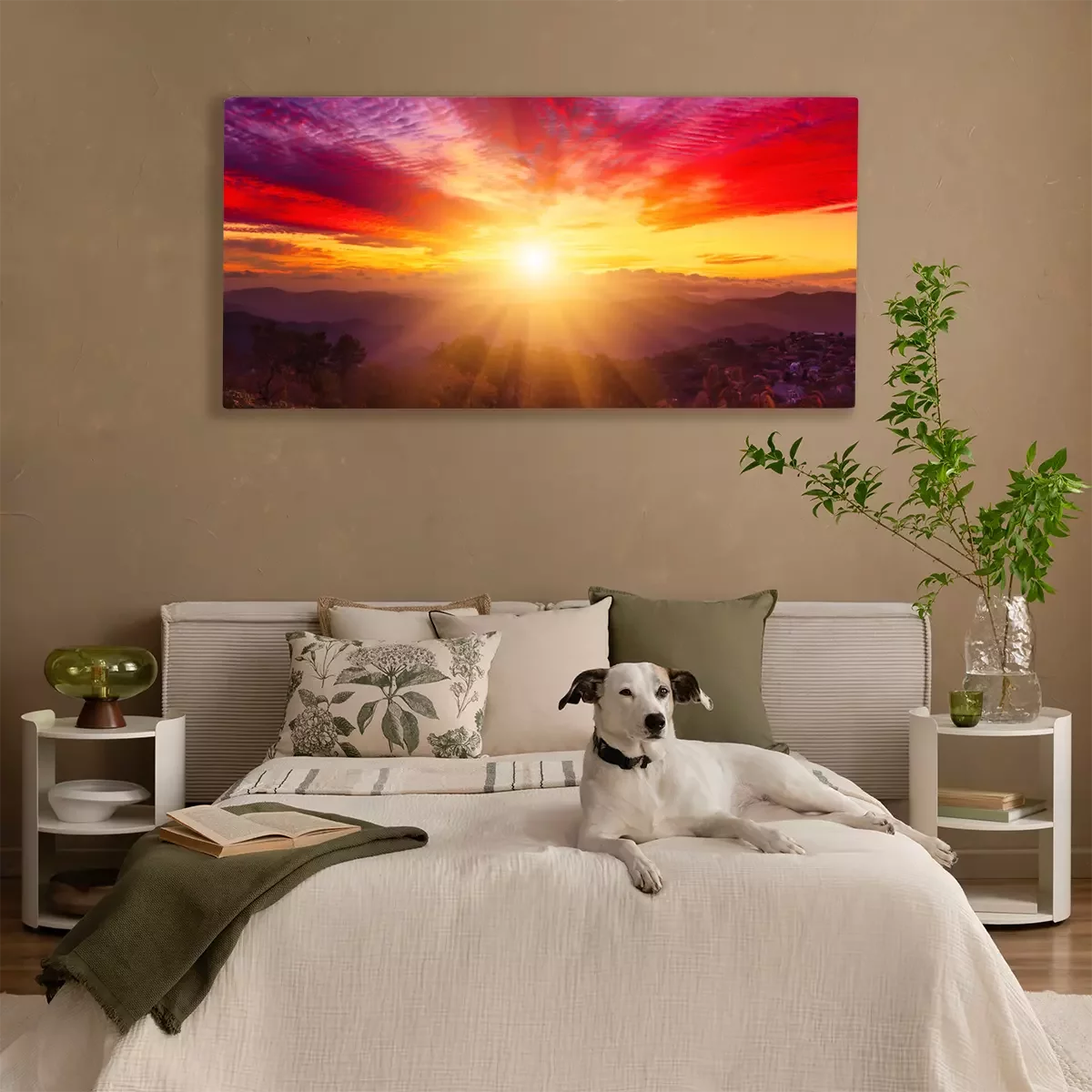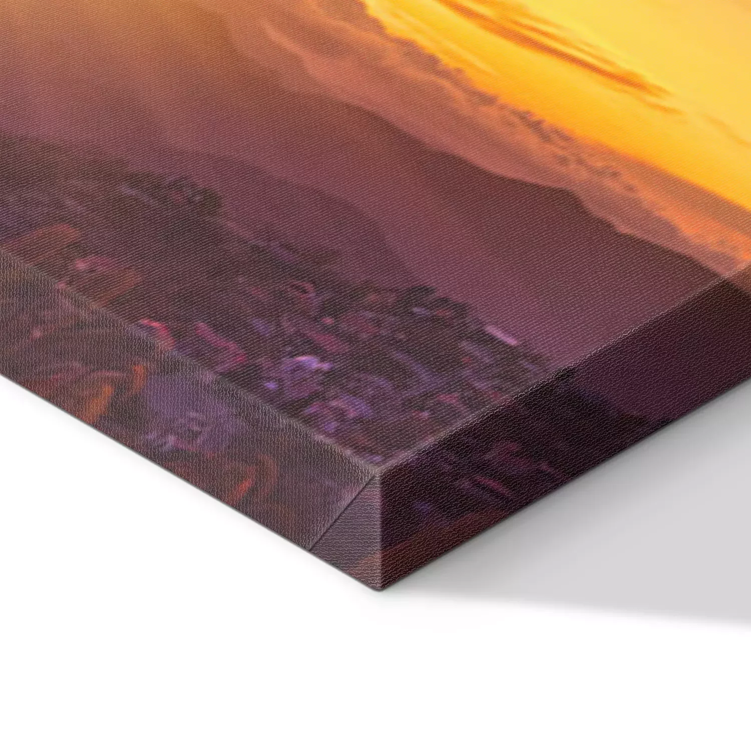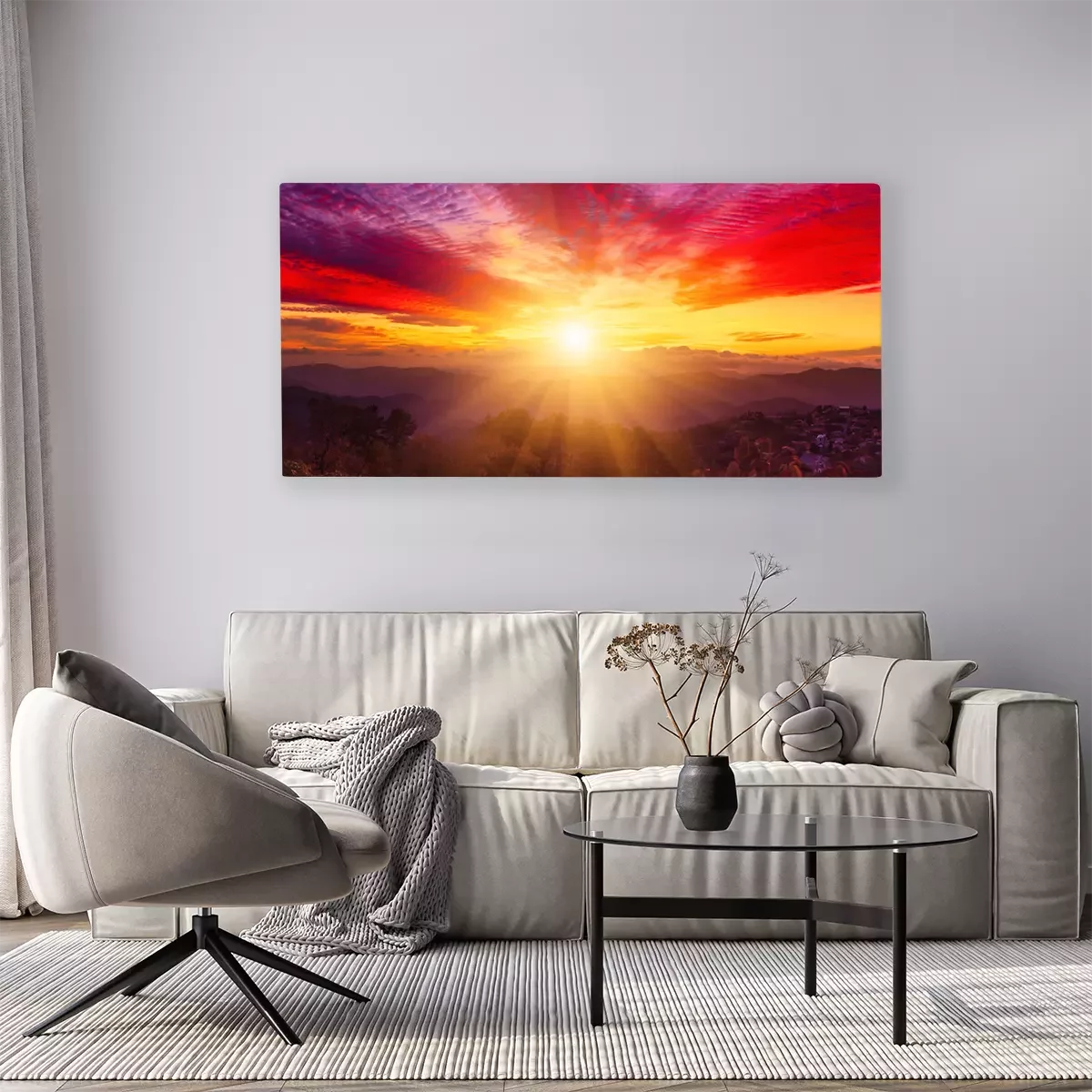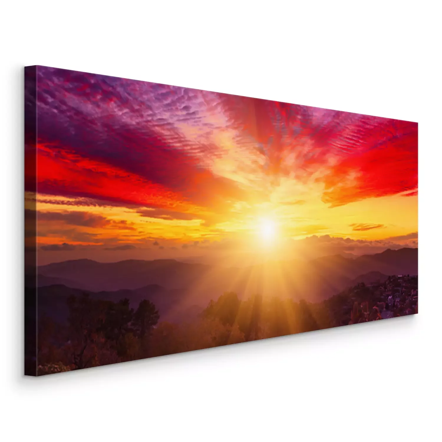 Canvas: Verbazend berglandschap met kleurrijke levendige zonsondergang op de heldere hemel, natuurlijke outdoor reizen achtergrond