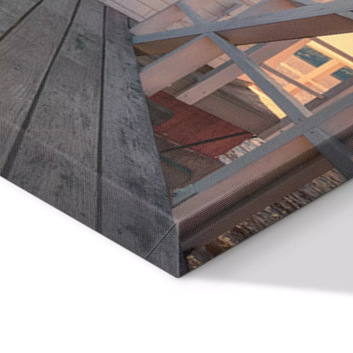 De print wordt aangebracht op hoogwaardig canvas dat op een schildersweefgetouw (spieraam) wordt gespannen. Omdat de print de zijranden bedekt, hoeft het ontwerp niet met een extra kader te worden omlijst. Wij raden ook composities aan die uit meerdere foto's bestaan en zo een coherente compositie vormen.