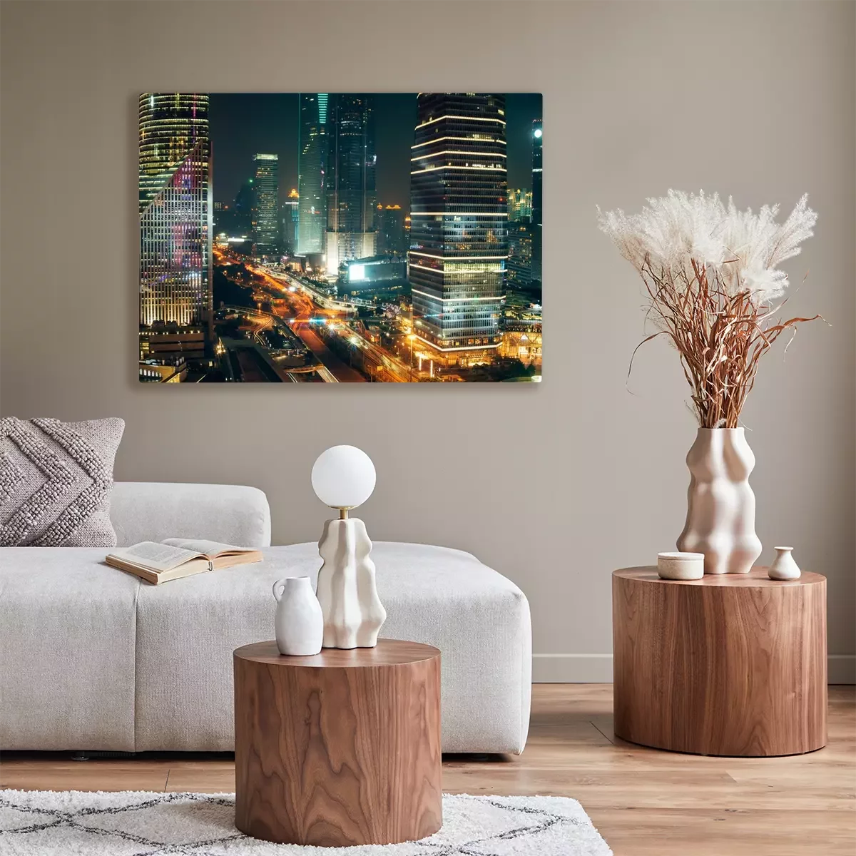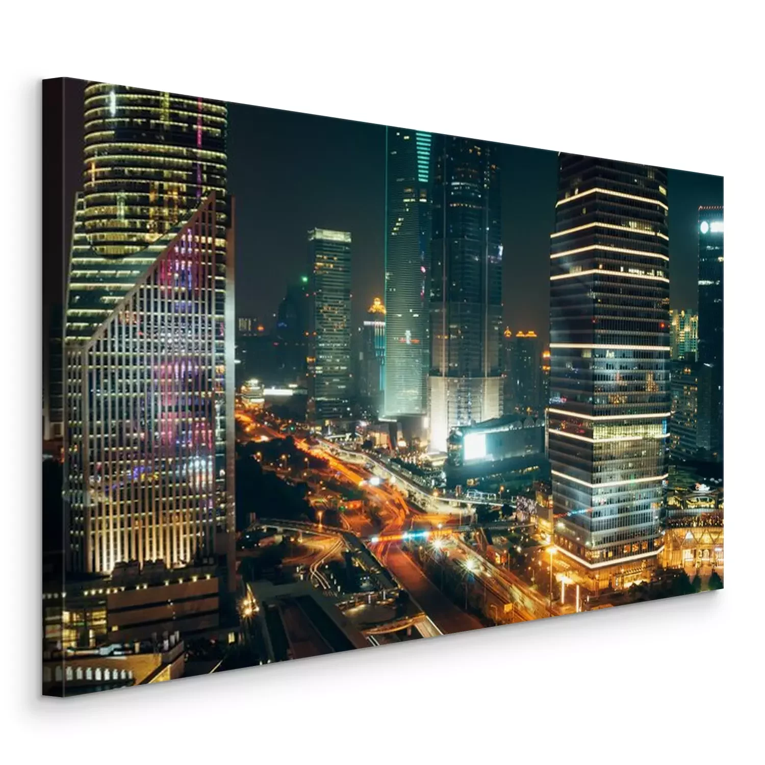 Canvas: Verkeerslichten, Wolkenkrabbers in Shanghai stad in bij nacht