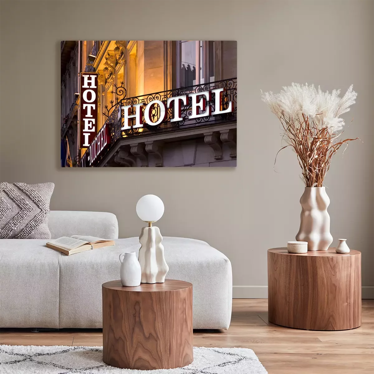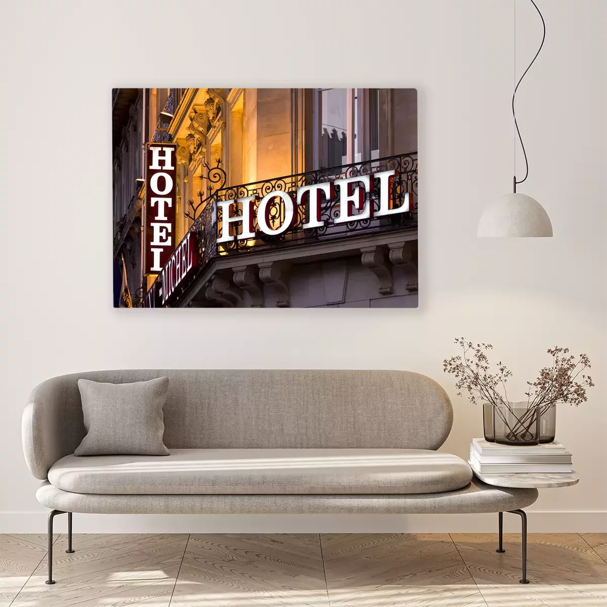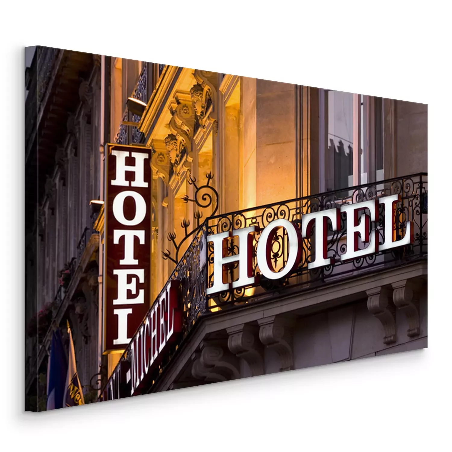 Canvas: Verlichte Parijse hotel teken genomen in de schemering
