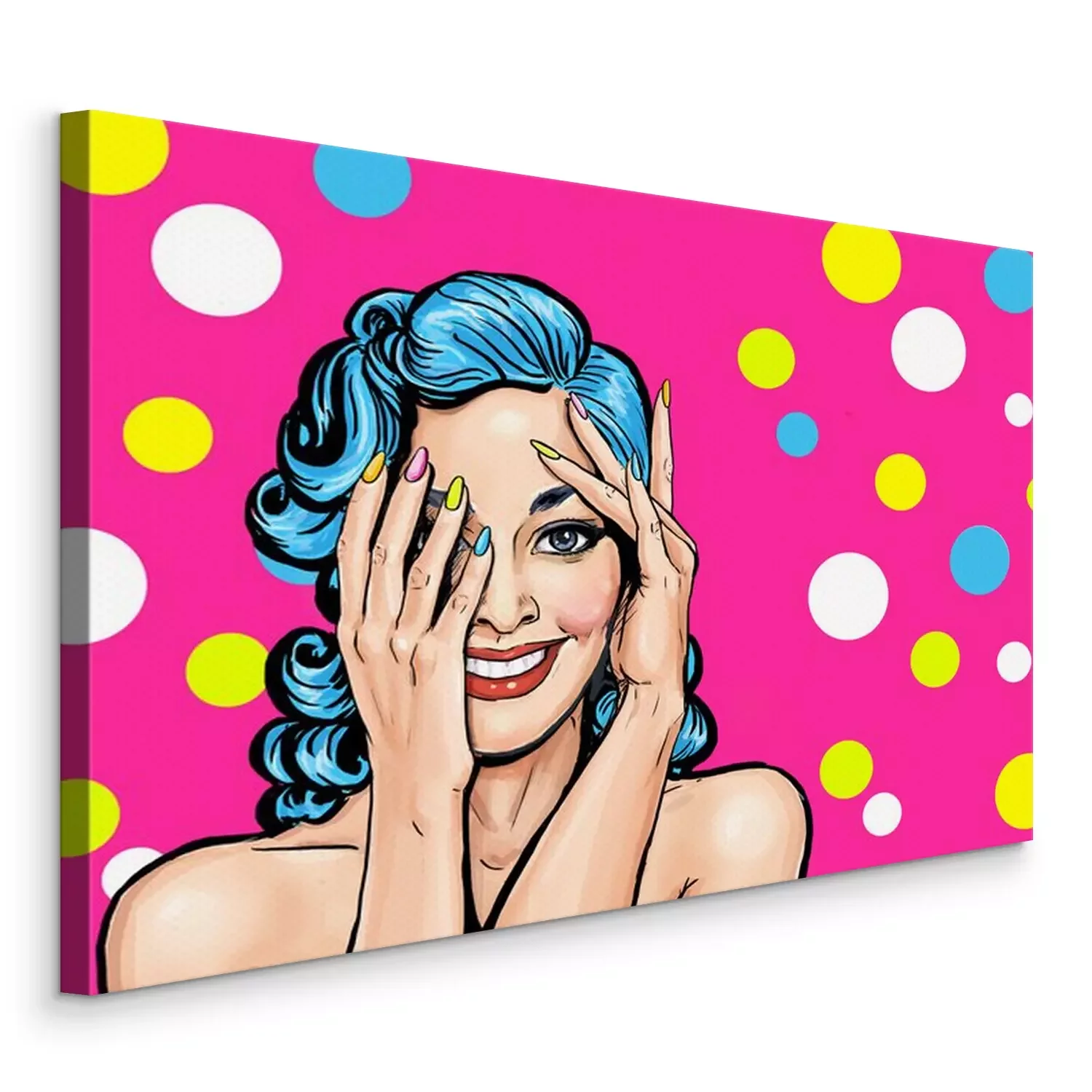 Canvas Verrast glimlachend meisje. Comic vrouw. Sexy meisje. Verbaasde vrouw. uitnodiging van de partij. Verjaardagskaart. Hollywood filmster. Comic vrouw. Sexy meisje. Lust, verleiding, geslacht, seksualite