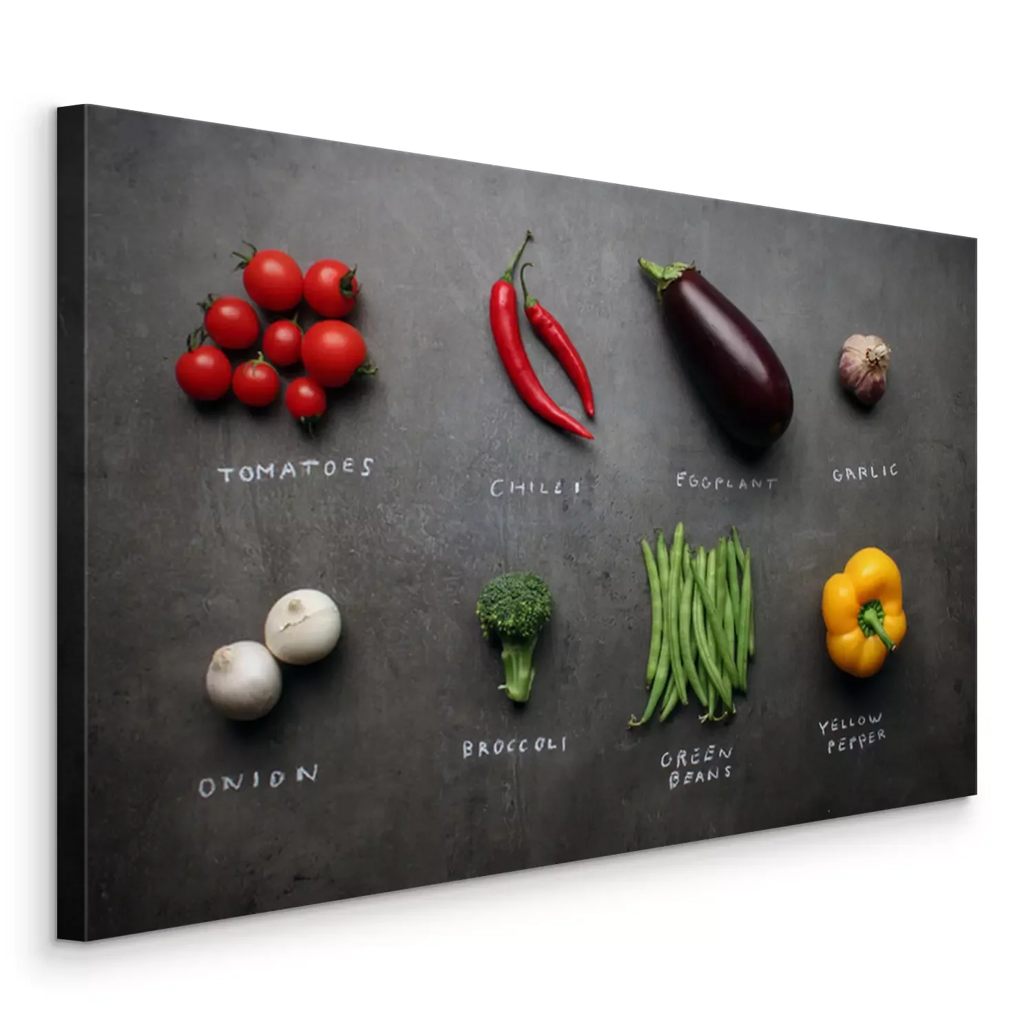 Canvas: Verse groenten met krijtachtige borden op grijze keukentafel
