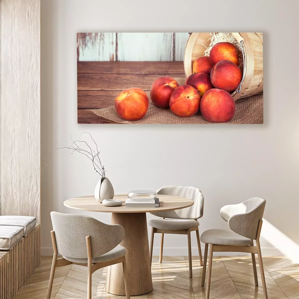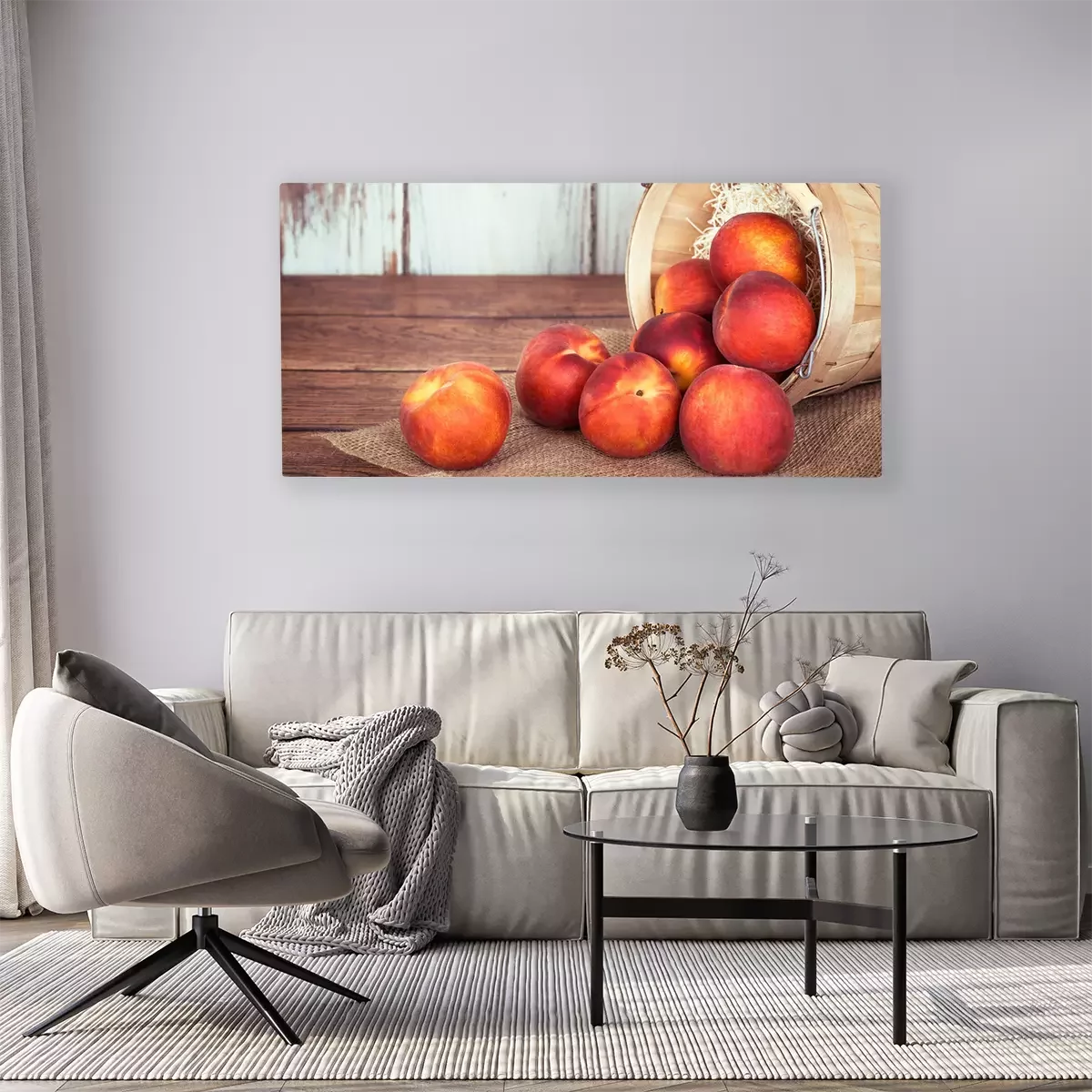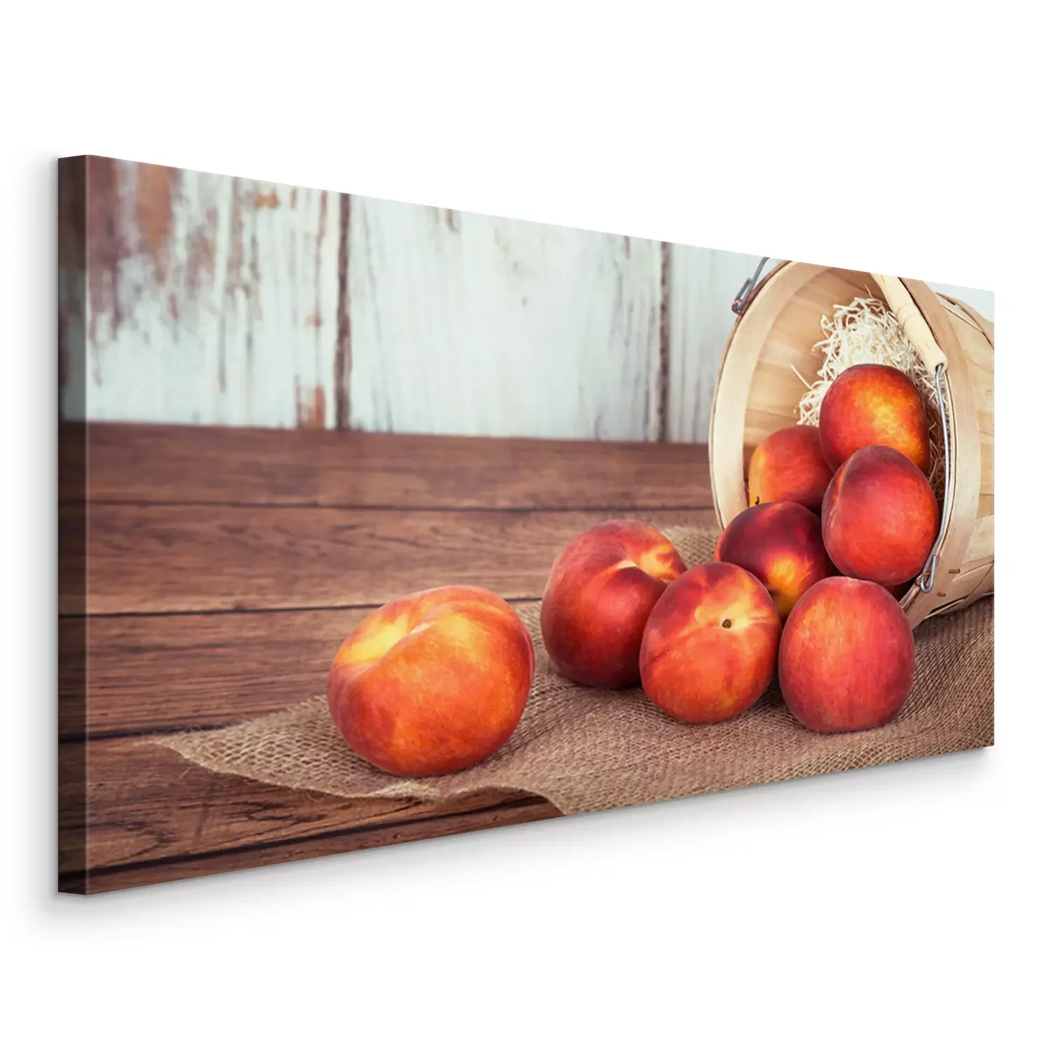 Canvas Verse perzik vruchten in een mand, rustieke houten achtergrond
