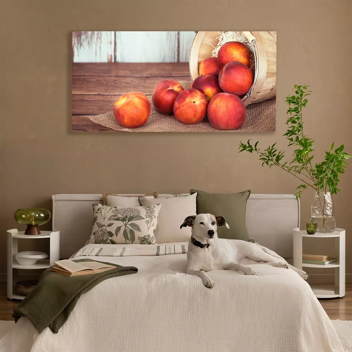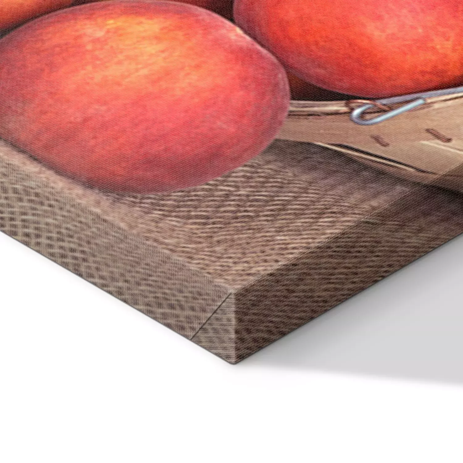 Canvas: Verse perzik vruchten in een mand, rustieke houten achtergrond