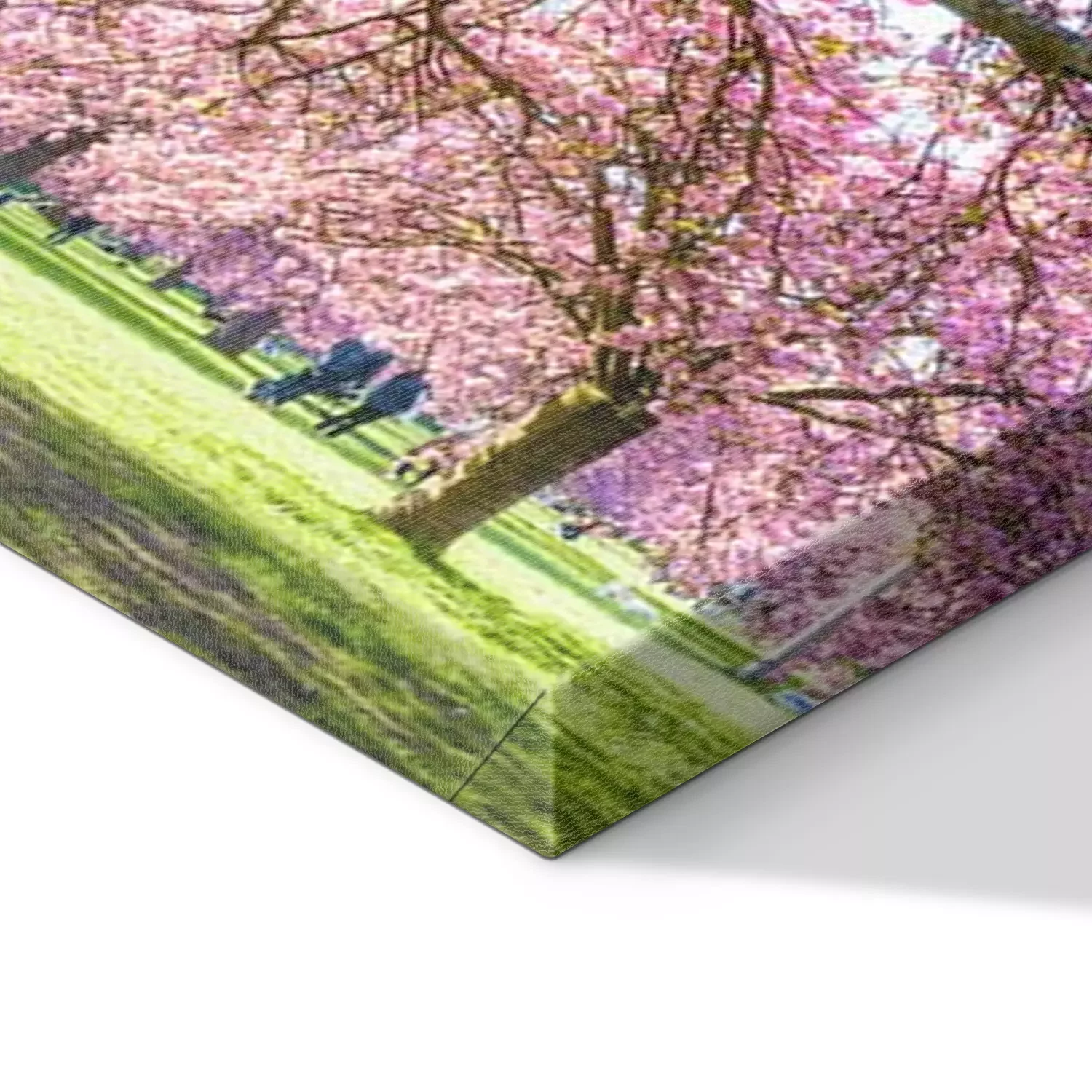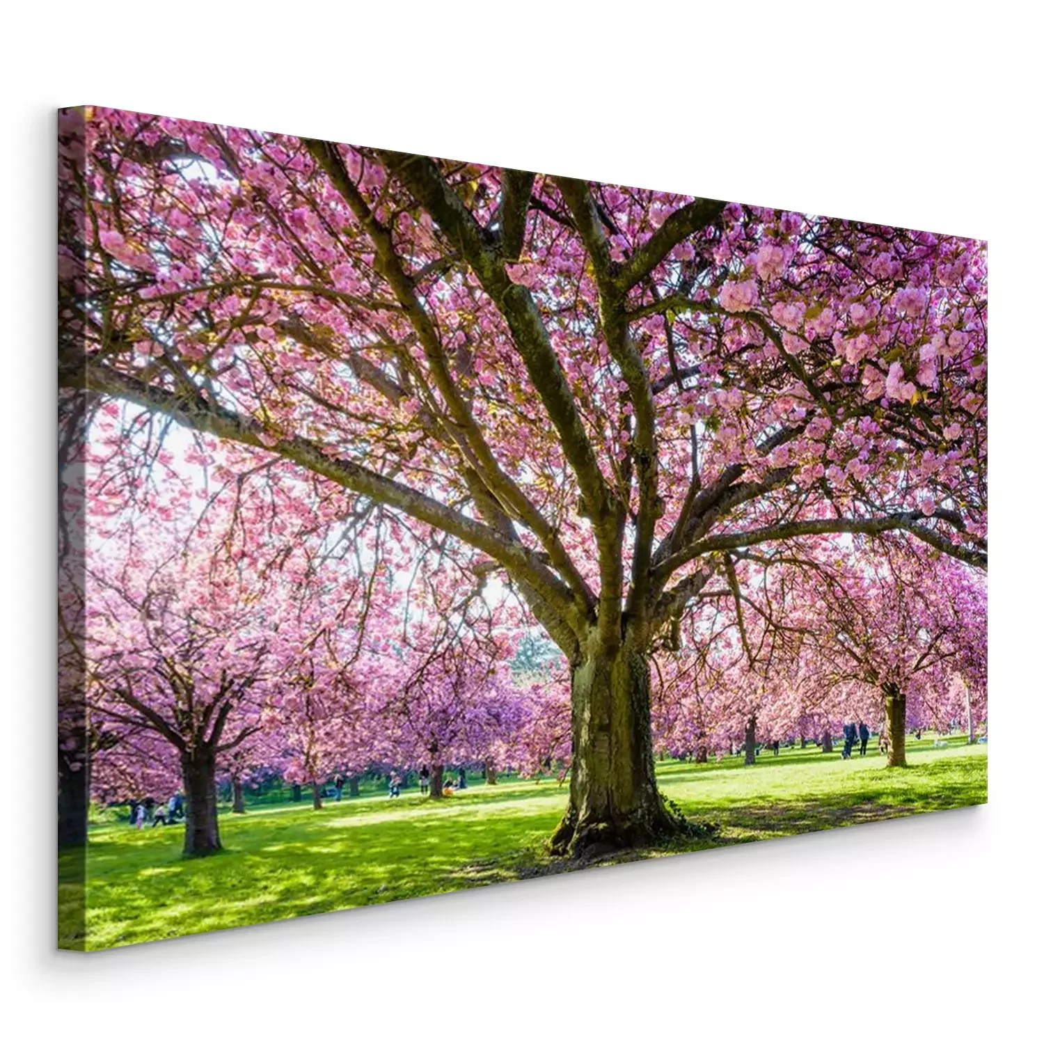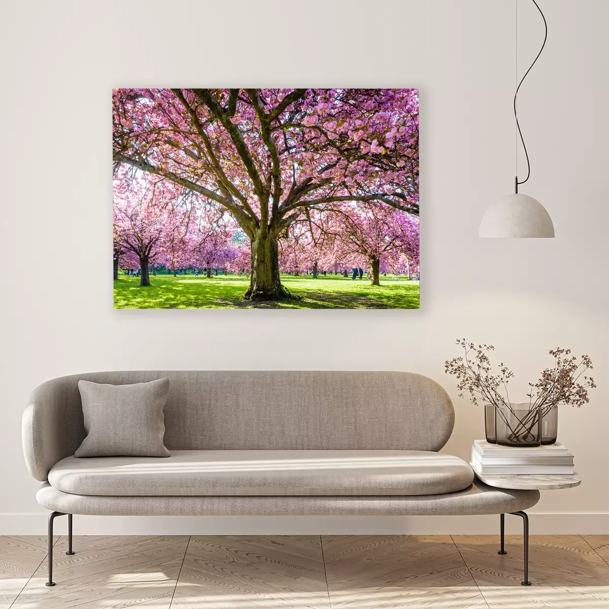 Canvas View from below of a blossoming Japanese cherry tree in a grassy meadow by a sunny spring afternoon, with branches laden with clusters of pink flowers.