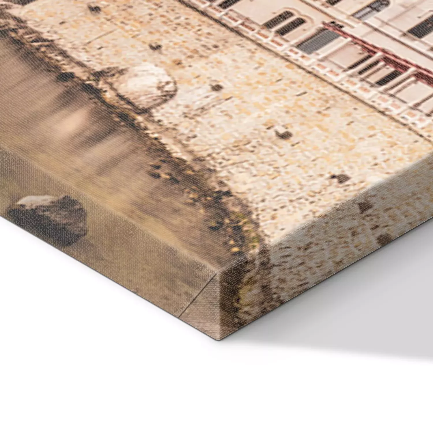 De print wordt aangebracht op hoogwaardig canvas dat op een schildersweefgetouw (spieraam) wordt gespannen. Omdat de print de zijranden bedekt, hoeft het ontwerp niet met een extra kader te worden omlijst. Wij raden ook composities aan die uit meerdere foto's bestaan en zo een coherente compositie vormen.
