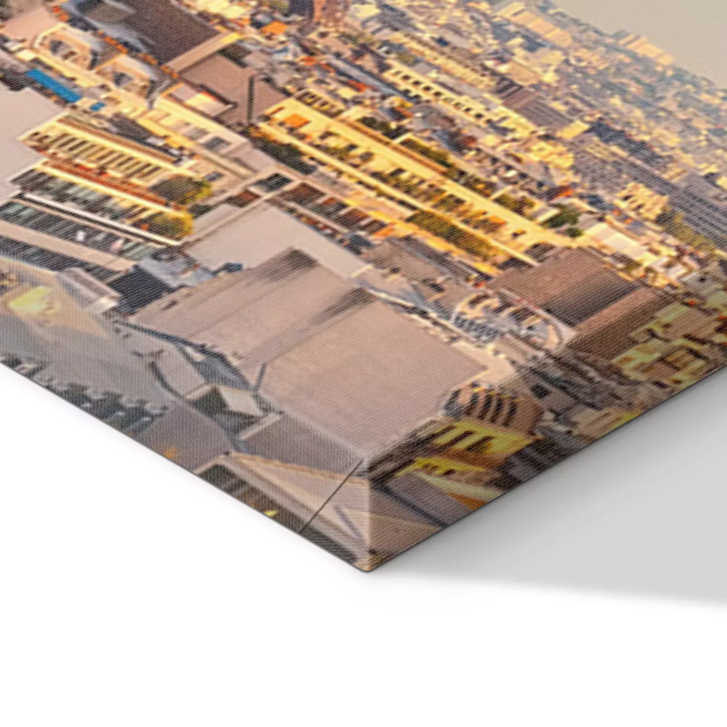 De print wordt aangebracht op hoogwaardig canvas dat op een schildersweefgetouw (spieraam) wordt gespannen. Omdat de print de zijranden bedekt, hoeft het ontwerp niet met een extra kader te worden omlijst. Wij raden ook composities aan die uit meerdere foto's bestaan en zo een coherente compositie vormen.