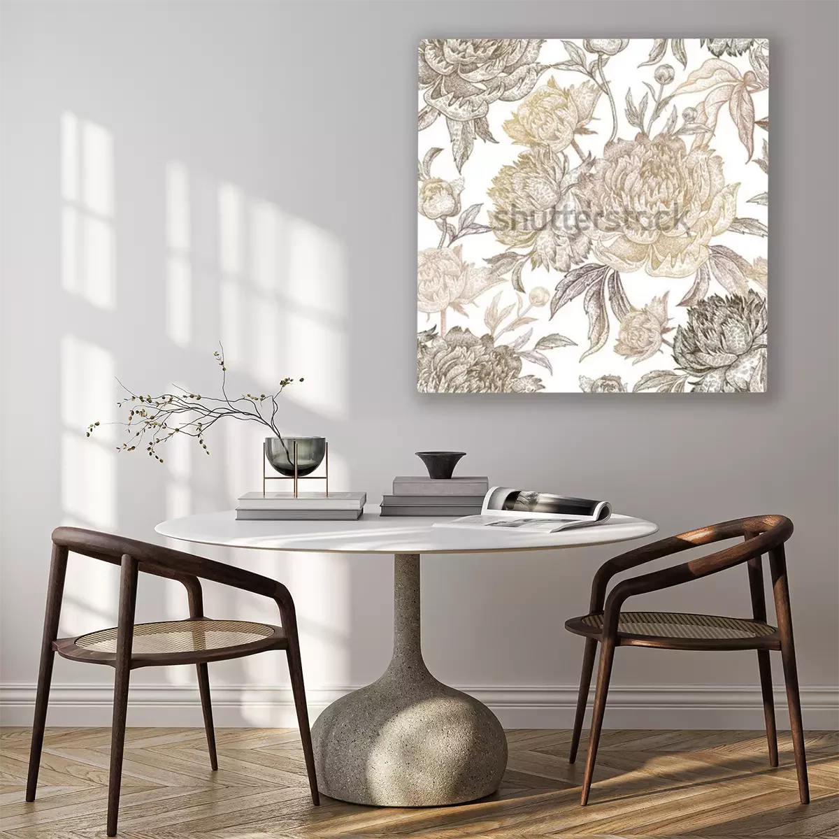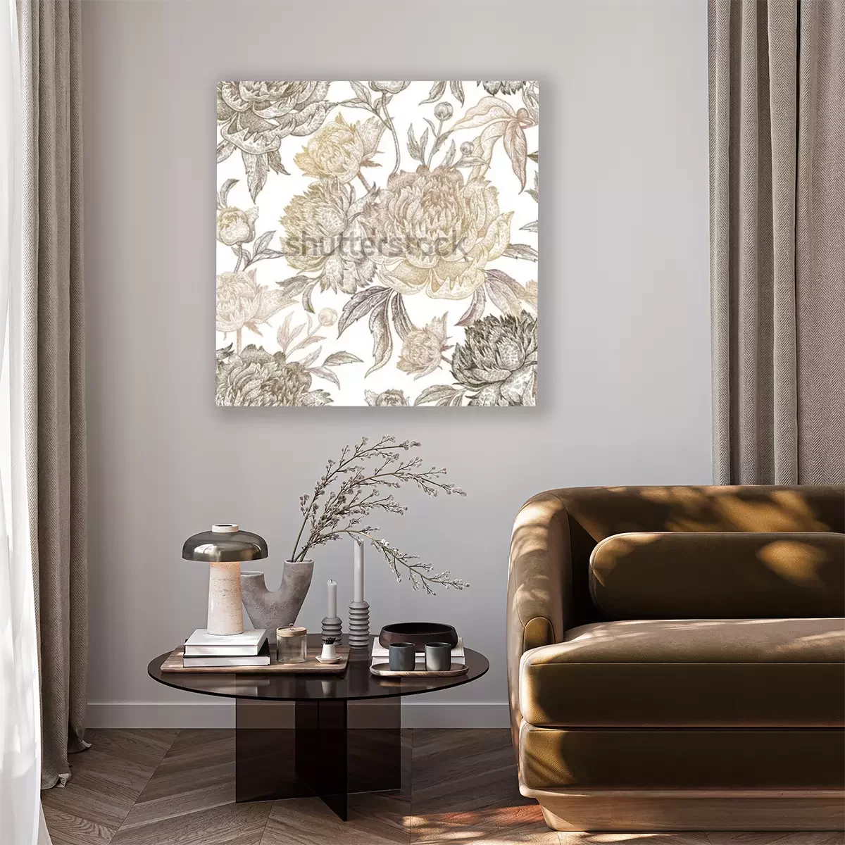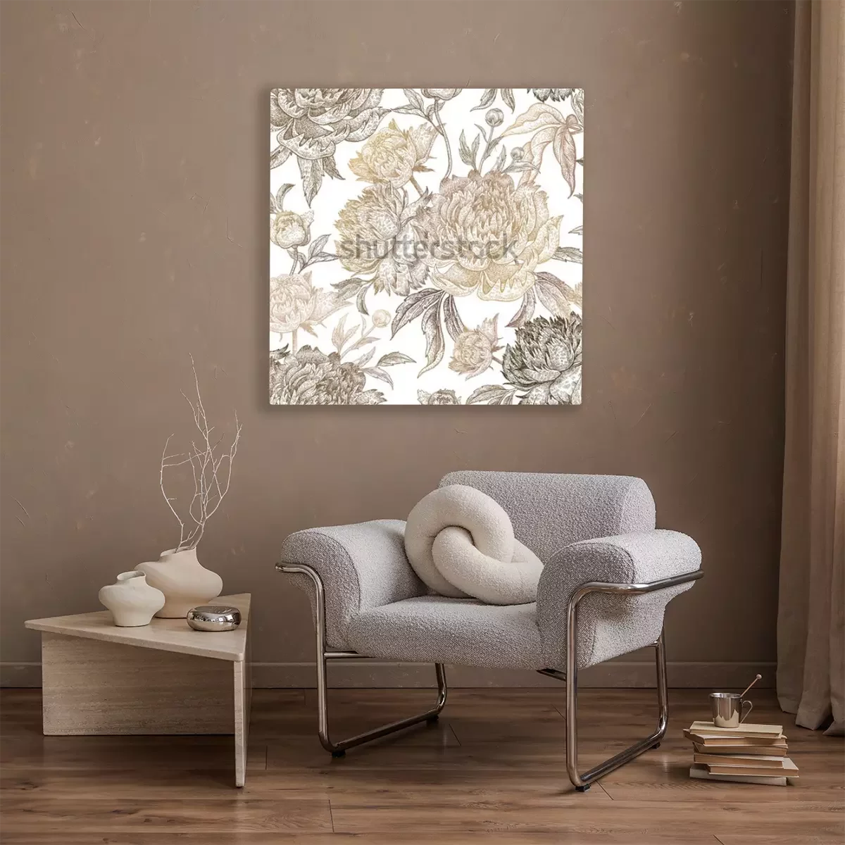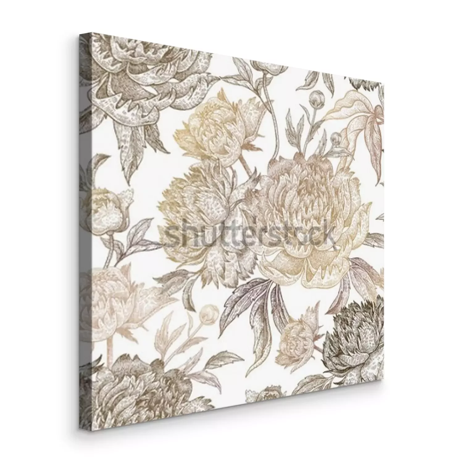 Canvas Vintage bloemen pioenrozen, takken, bladeren. Gouden folie op een witte achtergrond afdrukken. Naadloos patroon. Illustratie voor stoffen, telefoonhoes, papier, geschenkverpakkingen, textiel, interieu