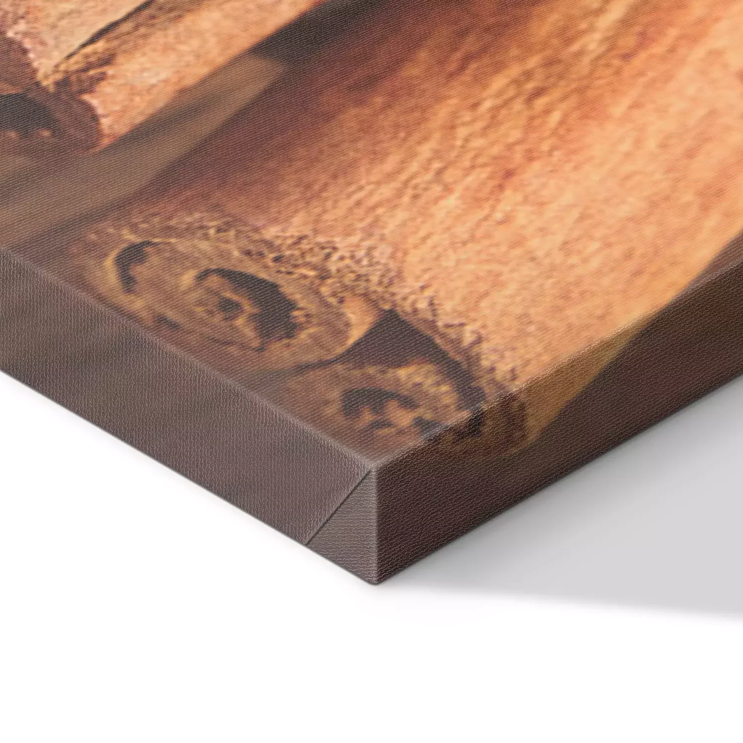 De print wordt aangebracht op hoogwaardig canvas dat op een schildersweefgetouw (spieraam) wordt gespannen. Omdat de print de zijranden bedekt, hoeft het ontwerp niet met een extra kader te worden omlijst. Wij raden ook composities aan die uit meerdere foto's bestaan en zo een coherente compositie vormen.