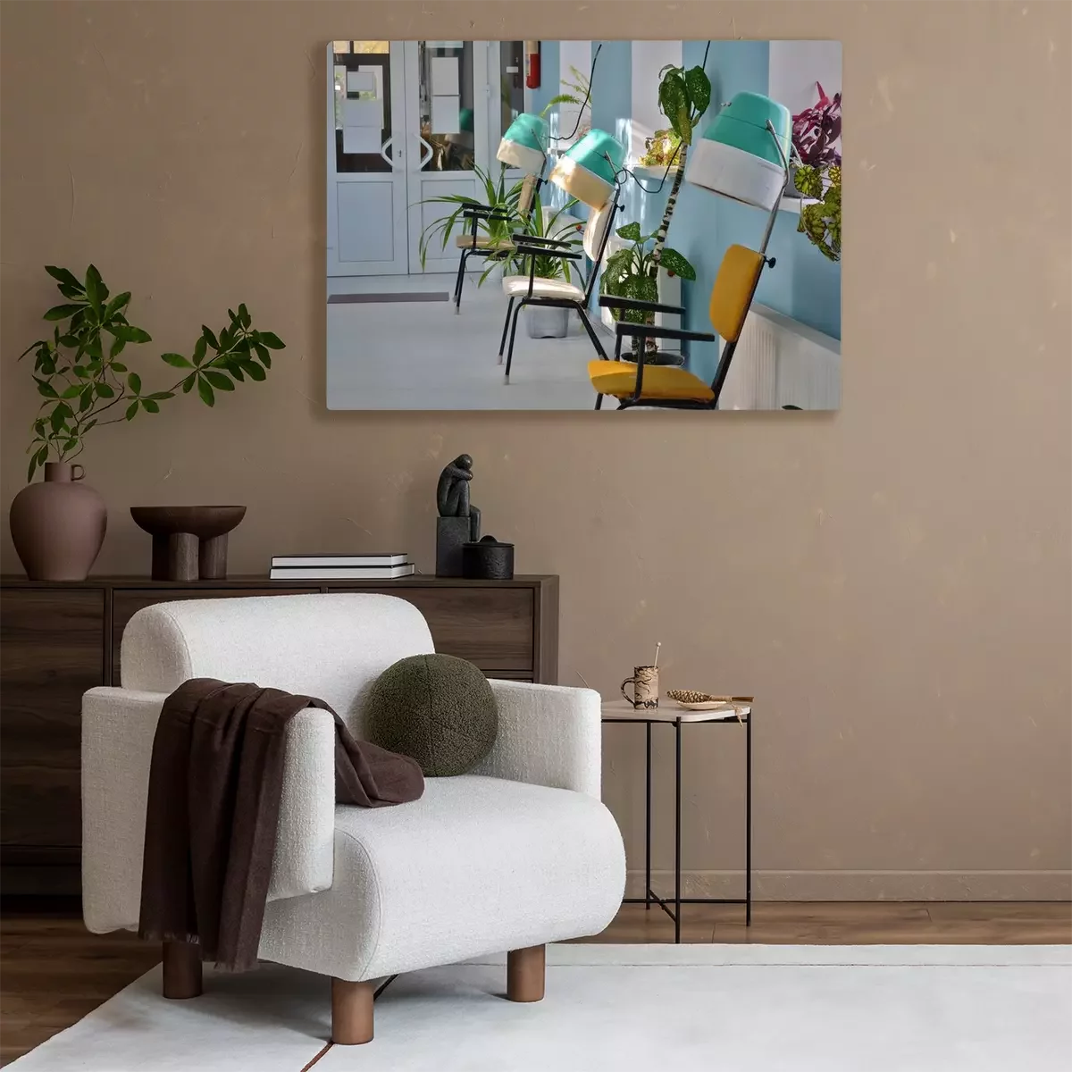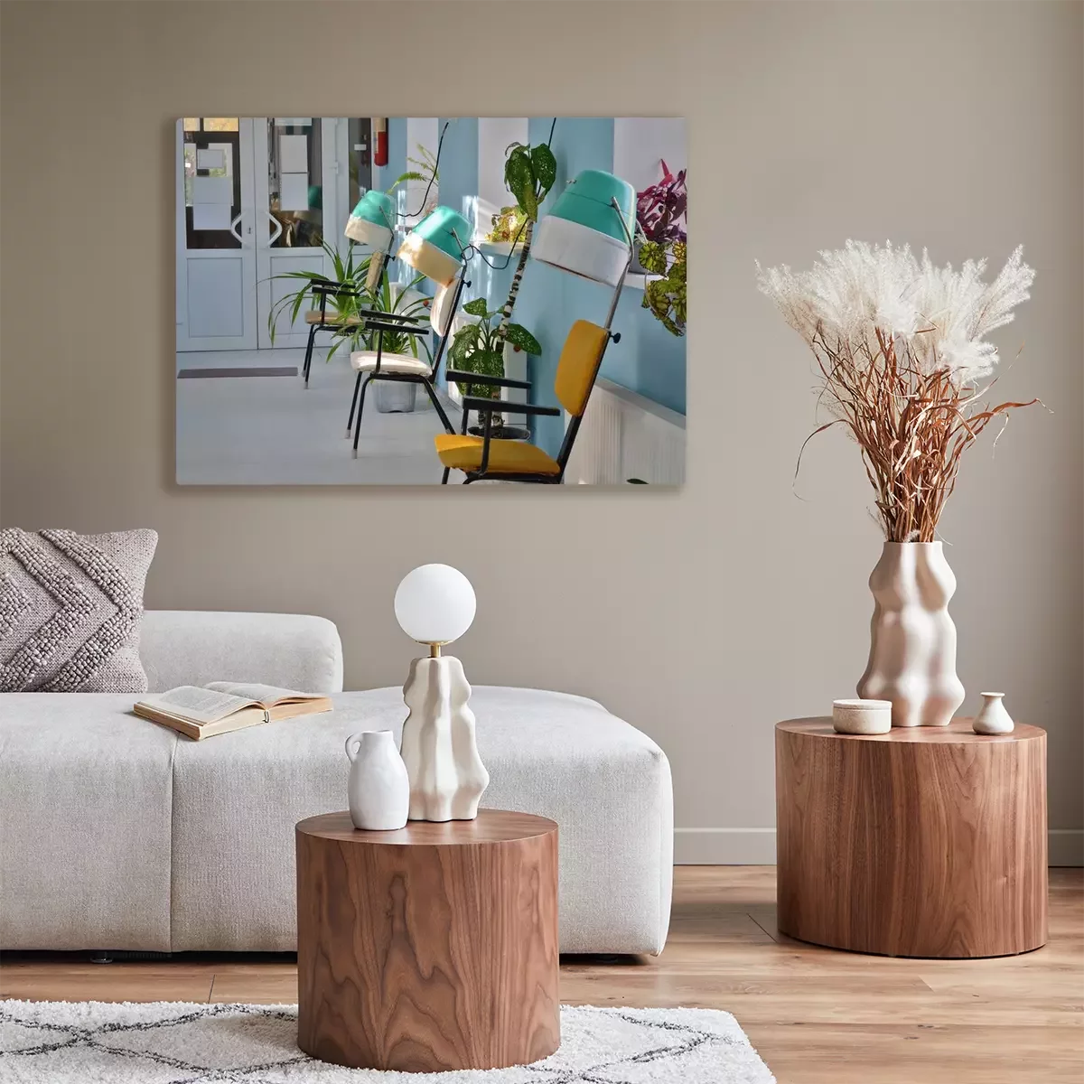 De print wordt aangebracht op hoogwaardig canvas dat op een schildersweefgetouw (spieraam) wordt gespannen. Omdat de print de zijranden bedekt, hoeft het ontwerp niet met een extra kader te worden omlijst. Wij raden ook composities aan die uit meerdere foto's bestaan en zo een coherente compositie vormen.