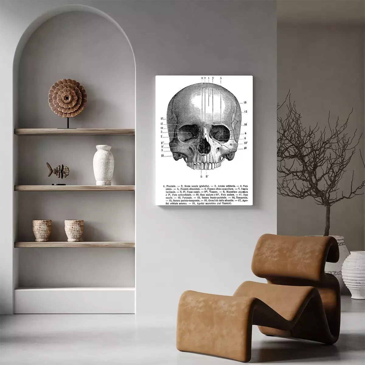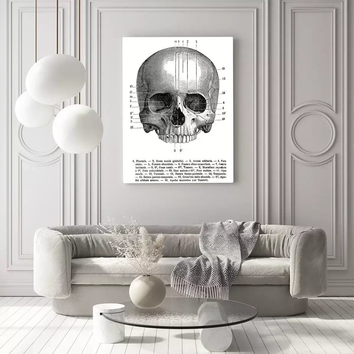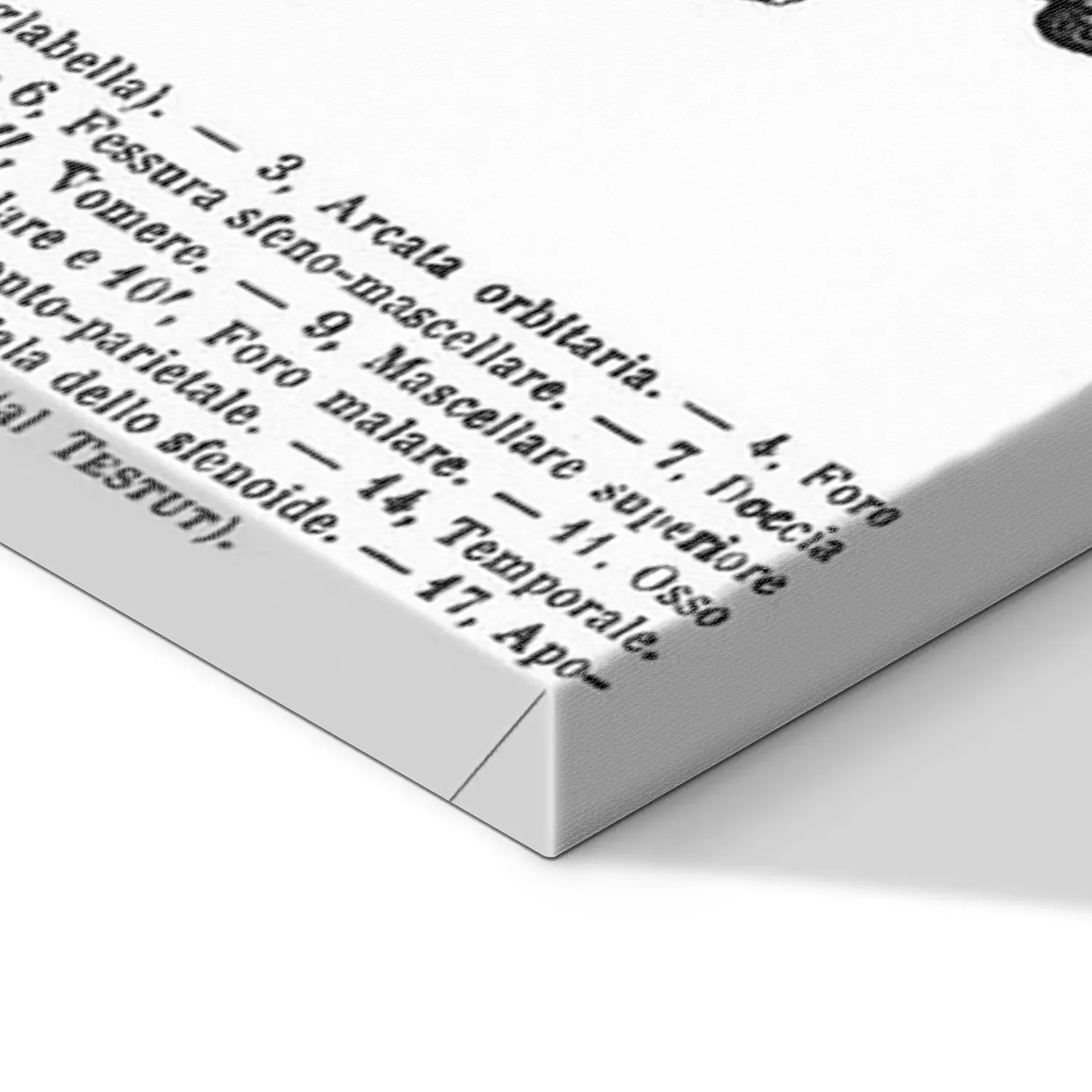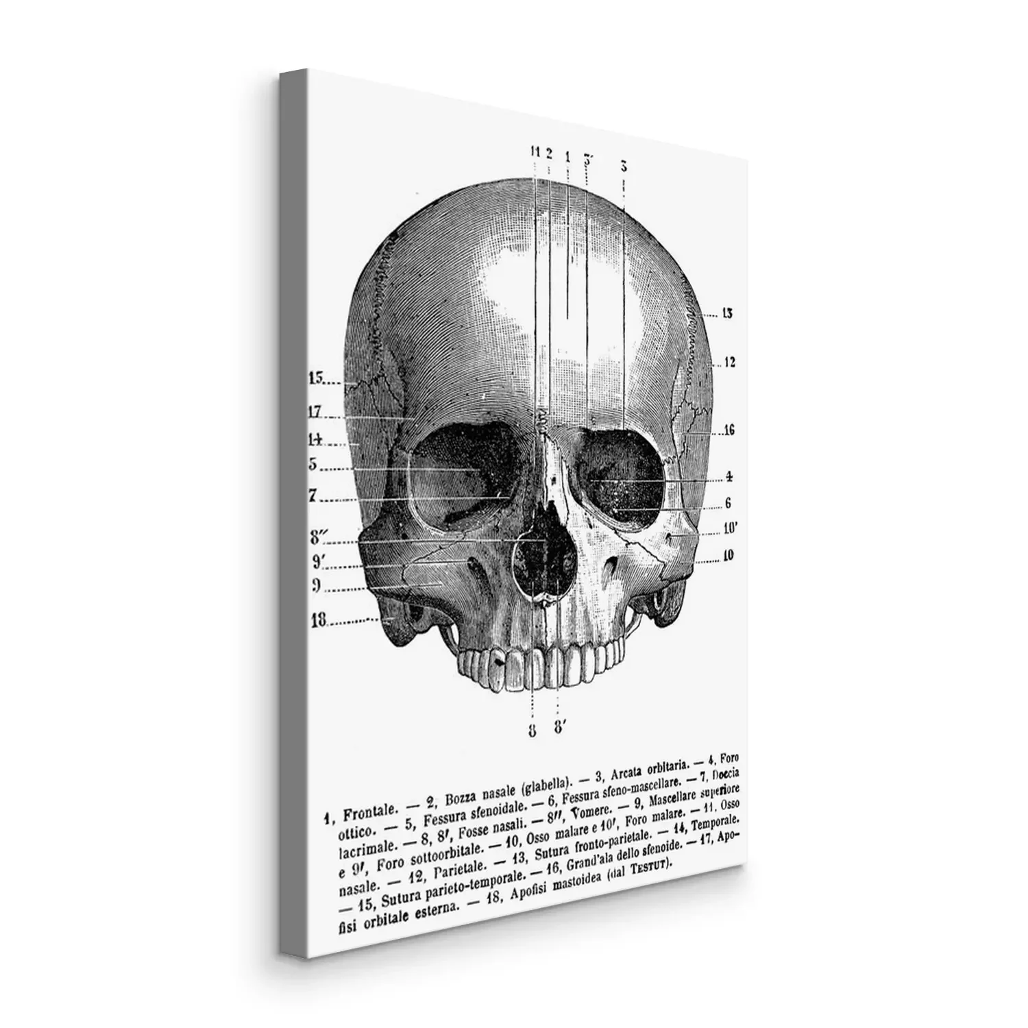 Canvas: Vintage illustratie van anatomie, menselijk schedel vooraanzicht, anatomische beschrijvingen in het Italiaans
