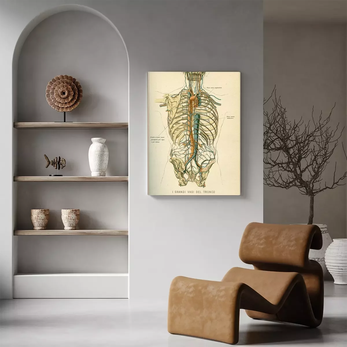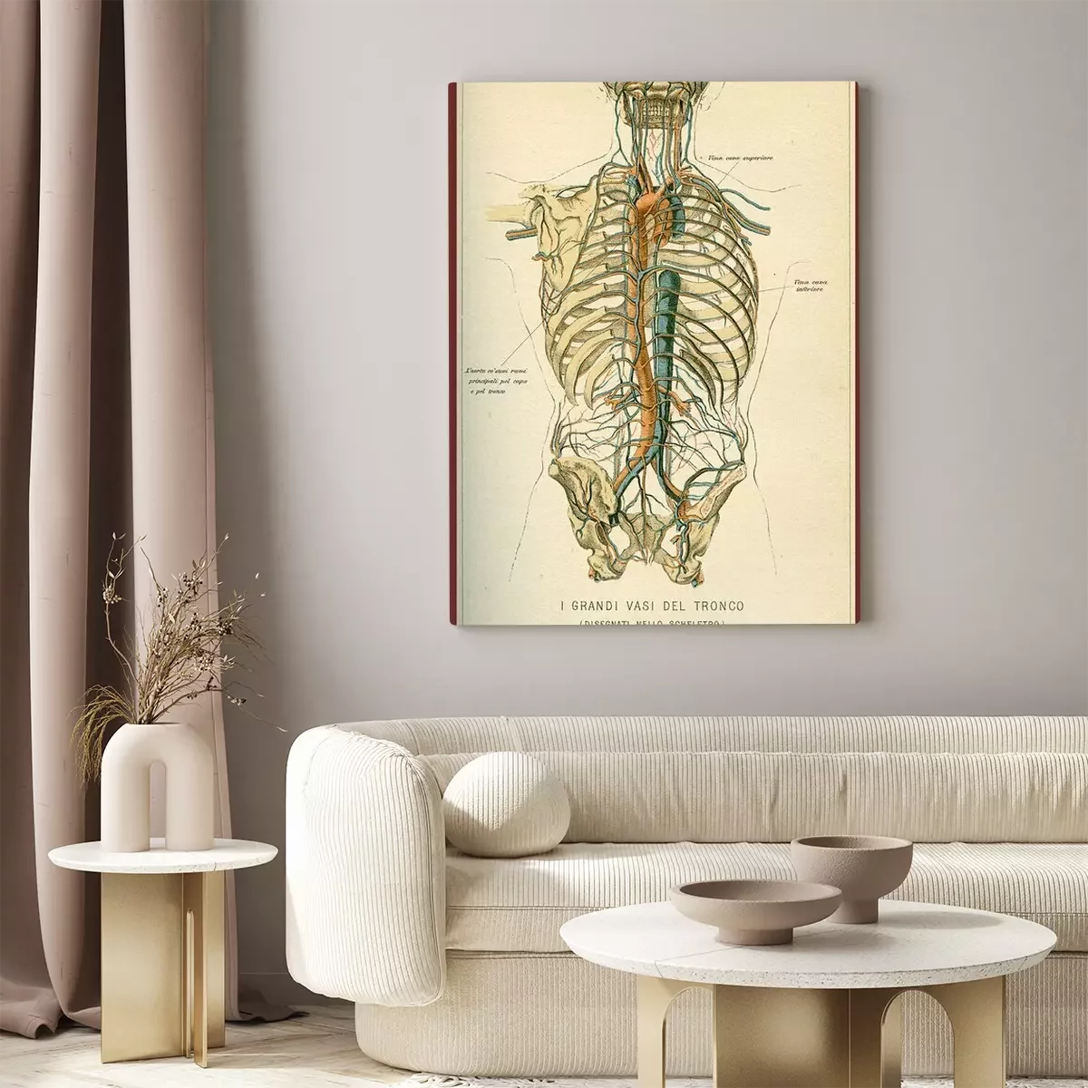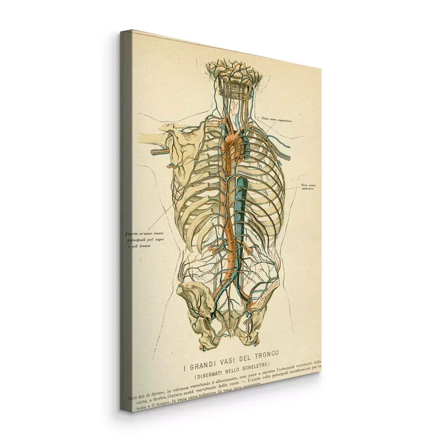 Canvas: Vintage kleurentabel van anatomie, buik grote bloedvaten met skelet, Italiaanse anatomische beschrijvingen