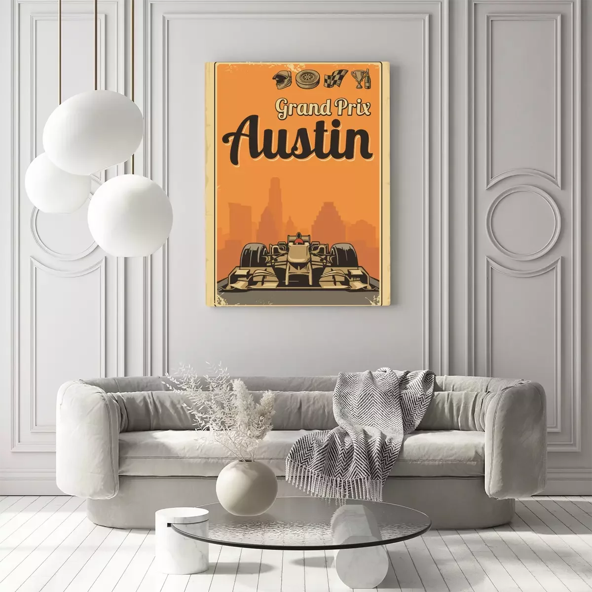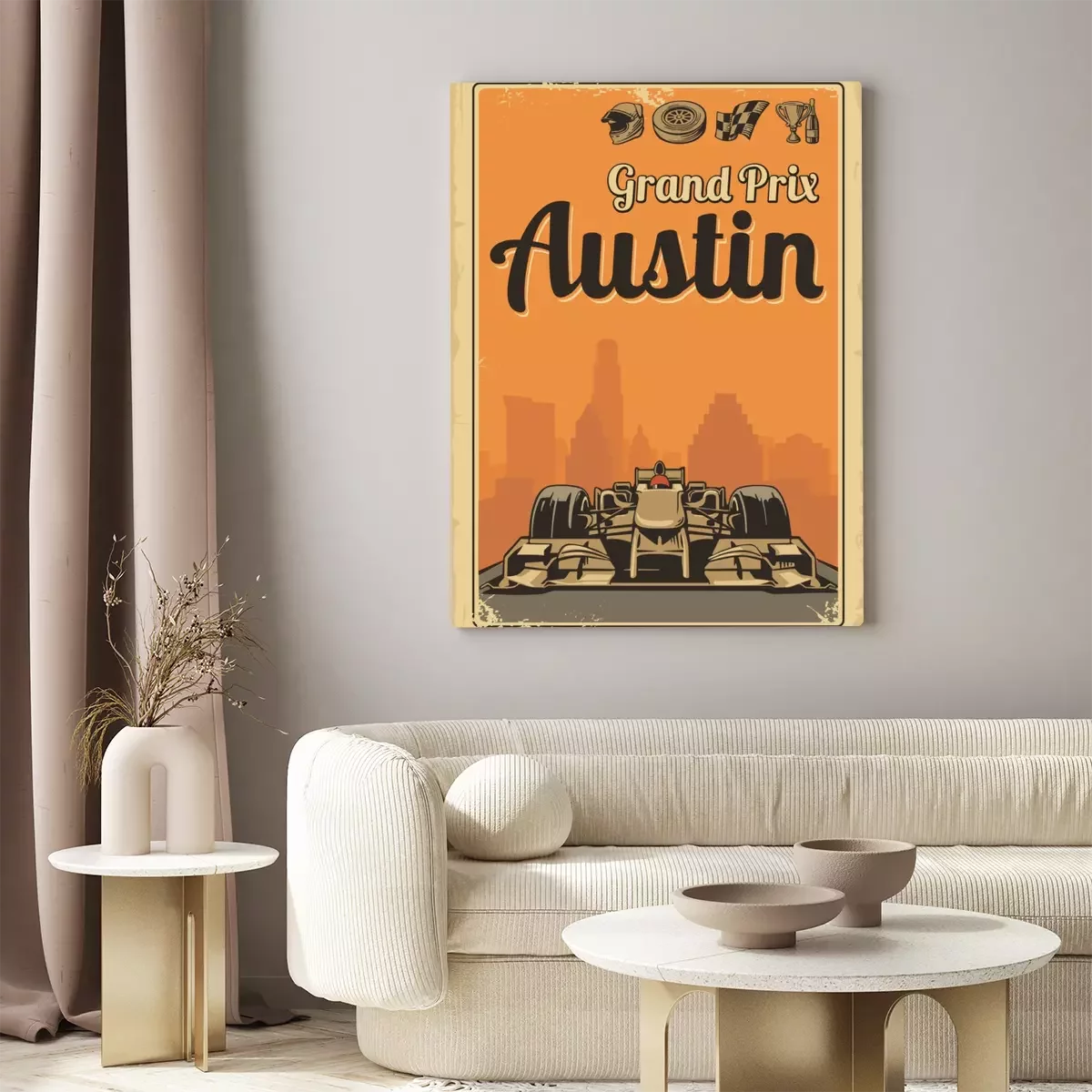 Canvas Vintage poster Grand Prix in Austin. Set symbolen F1 - racing sport auto, kop, helm, finishvlag, wiel, champagne. Vector illustratie voor poster, logo, web met oud papier textuur achtergrond