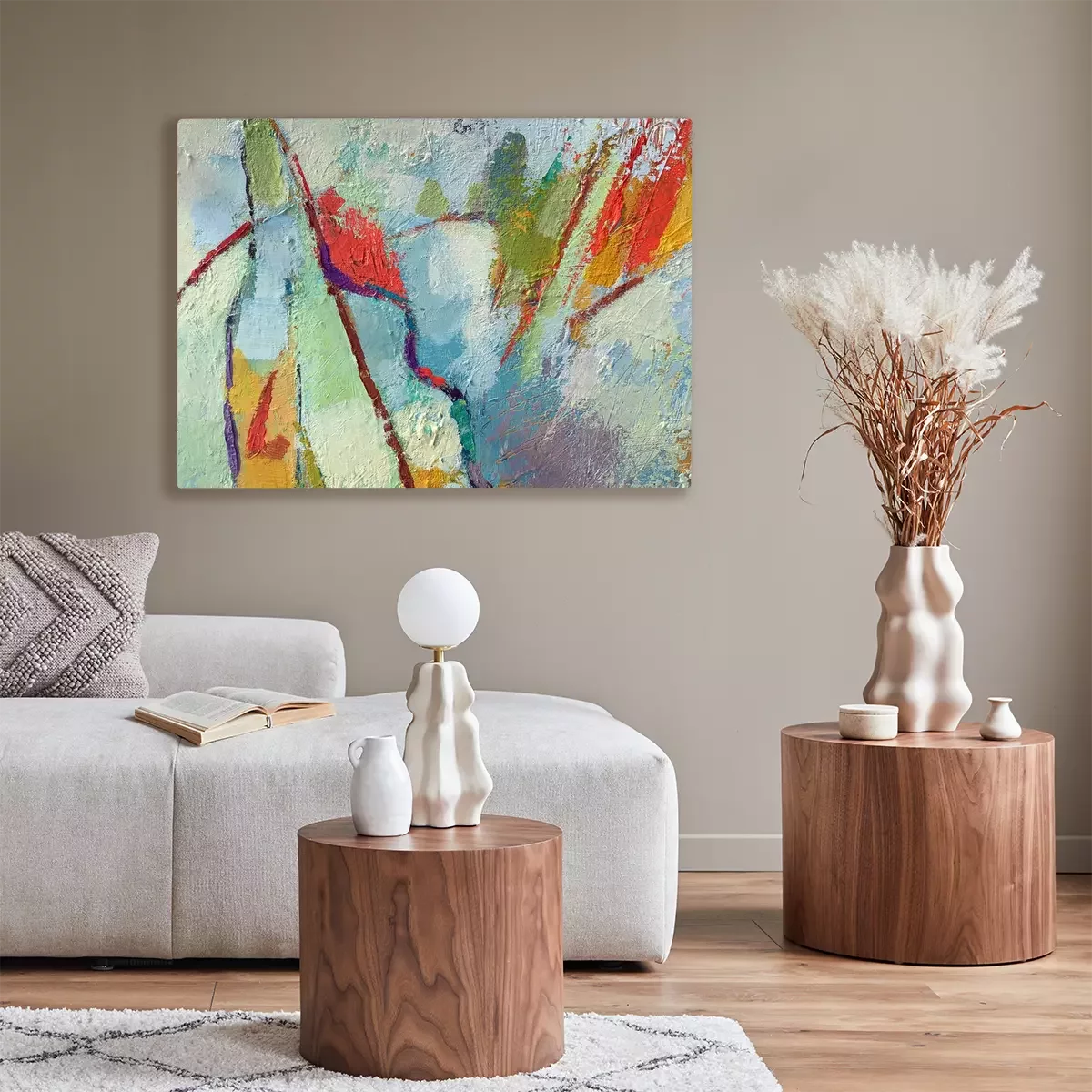 Canvas Vivid abstract minimalistic painting background with mixed paint texture. Artwork painting with red line and light blue blobs. Painting surface texture for art gallery advertising, banner design