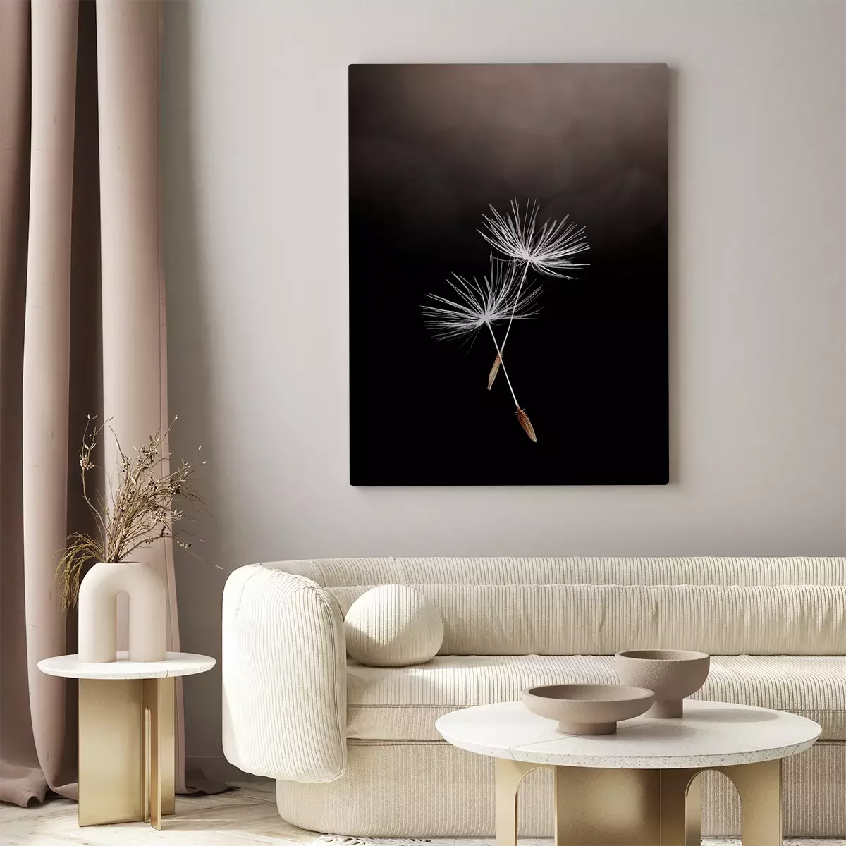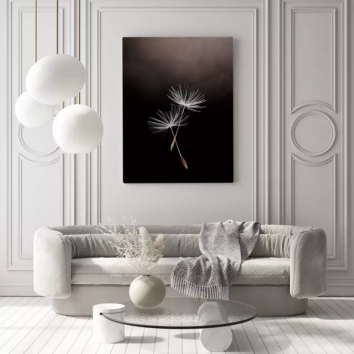 Vliegende paardenbloemzaden op een donkere achtergrond