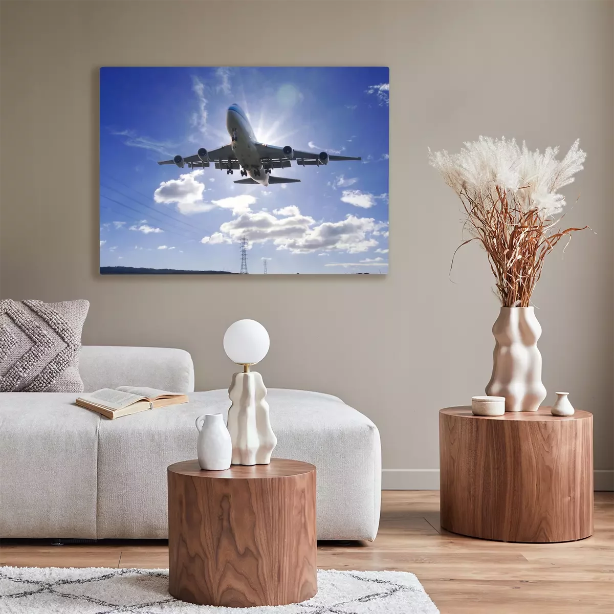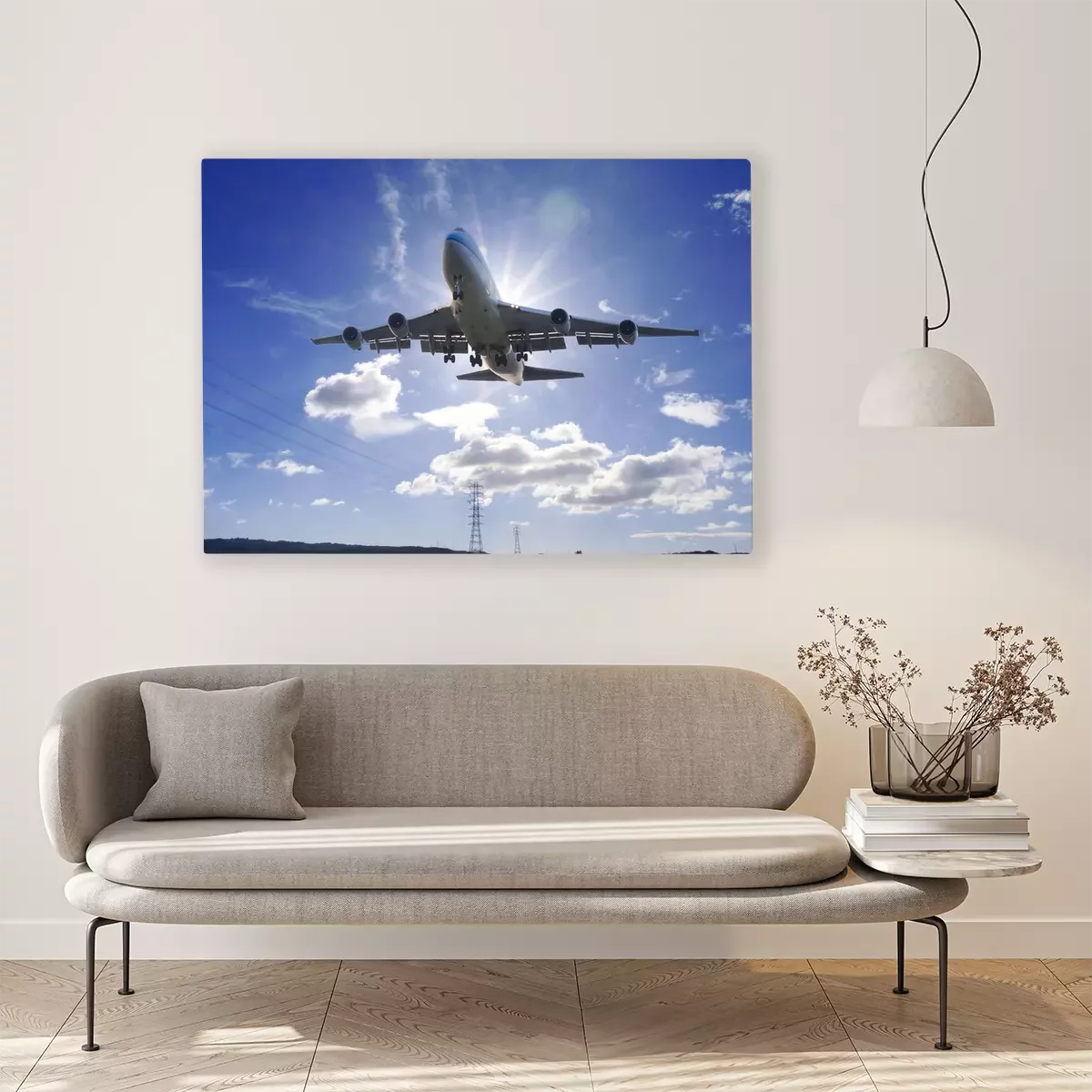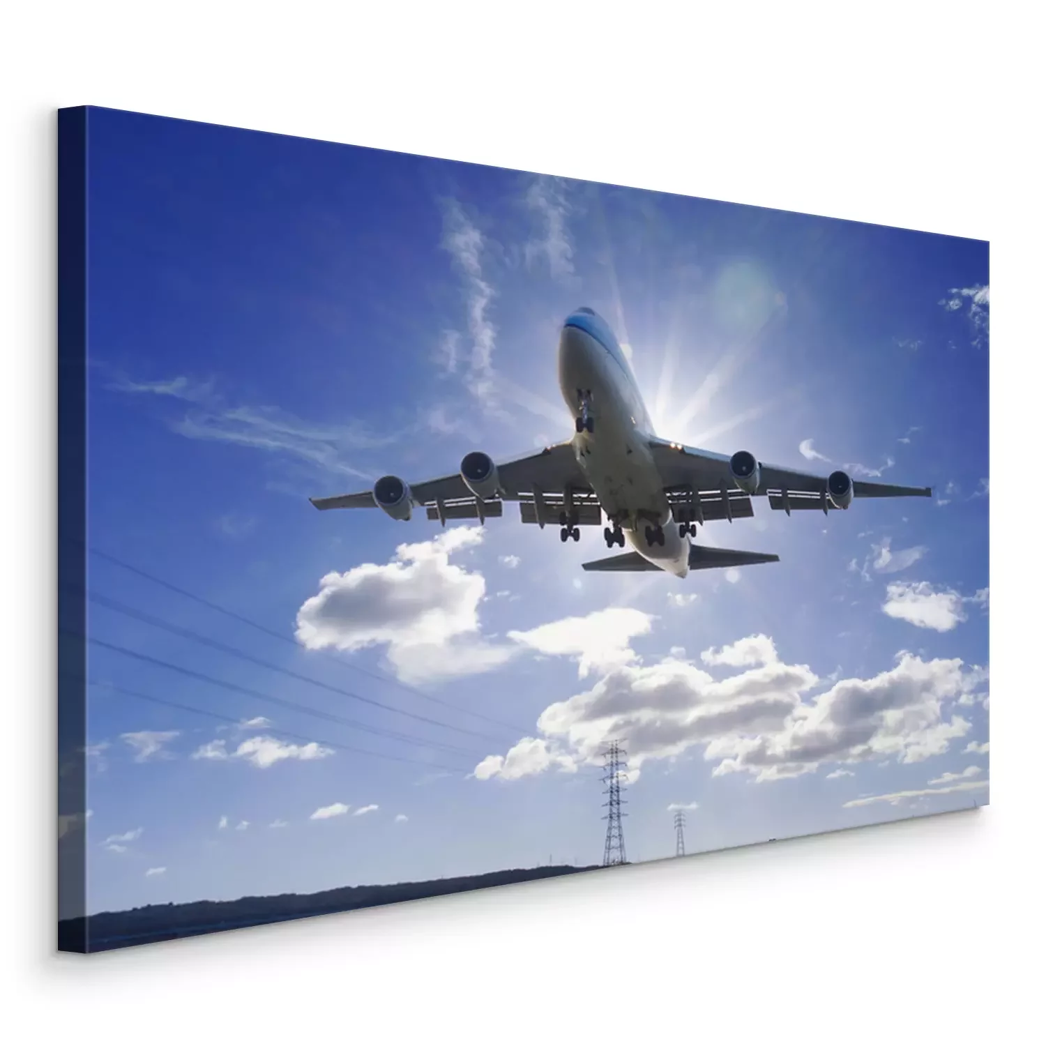 Canvas Vliegtuig opstijgen onder zonlicht in de luchthaven