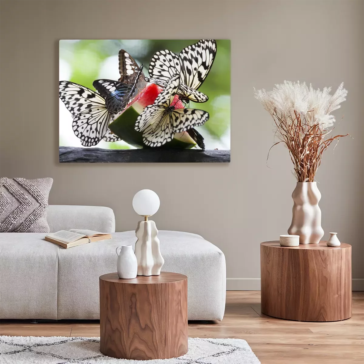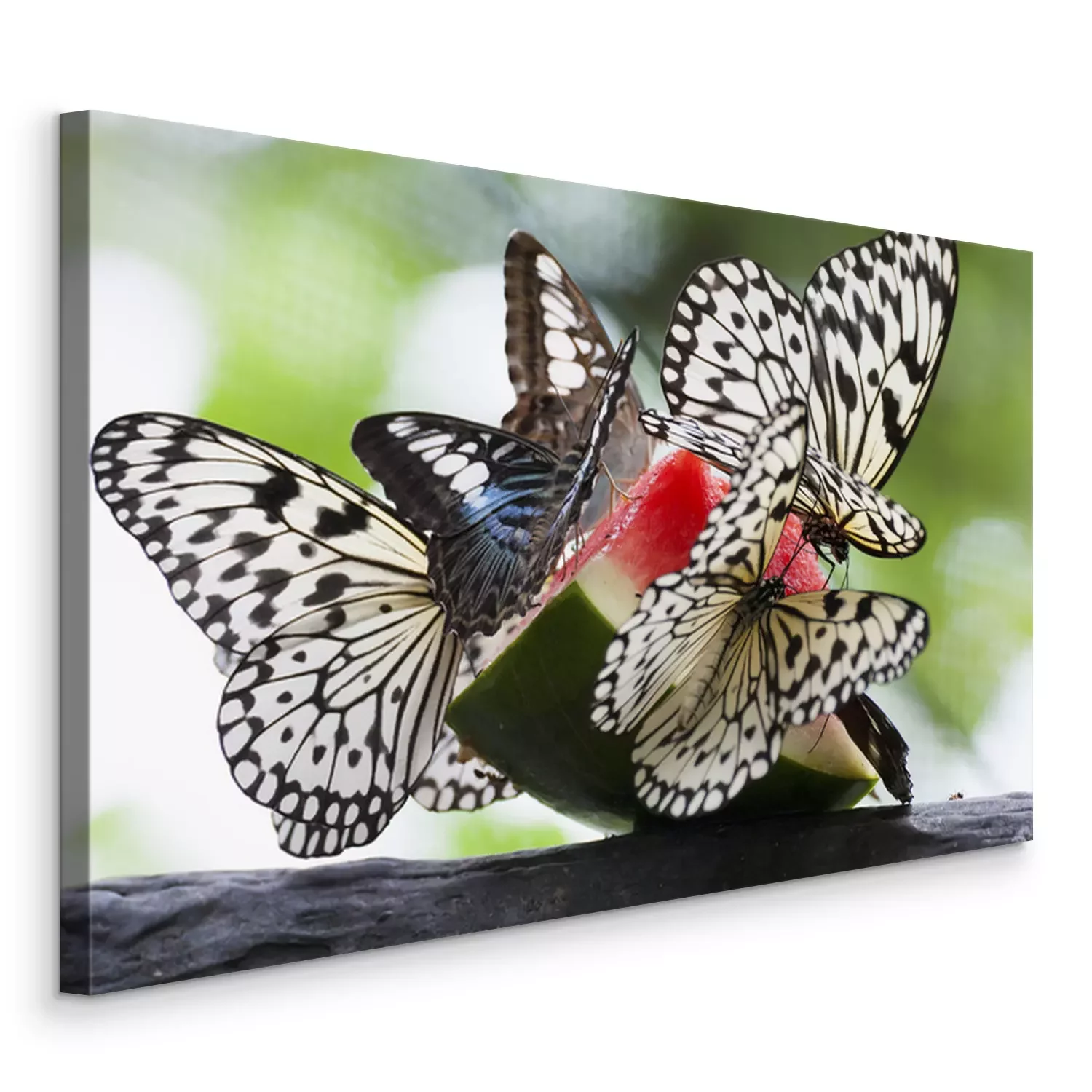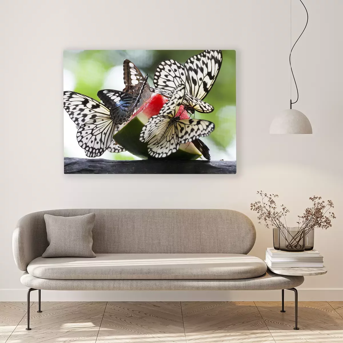 De print wordt aangebracht op hoogwaardig canvas dat op een schildersweefgetouw (spieraam) wordt gespannen. Omdat de print de zijranden bedekt, hoeft het ontwerp niet met een extra kader te worden omlijst. Wij raden ook composities aan die uit meerdere foto's bestaan en zo een coherente compositie vormen.