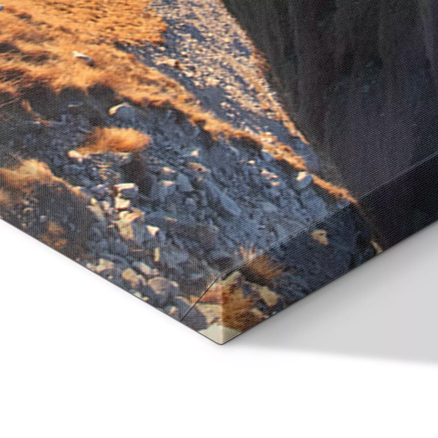 De print wordt aangebracht op hoogwaardig canvas dat op een schildersweefgetouw (spieraam) wordt gespannen. Omdat de print de zijranden bedekt, hoeft het ontwerp niet met een extra kader te worden omlijst. Wij raden ook composities aan die uit meerdere foto's bestaan en zo een coherente compositie vormen.