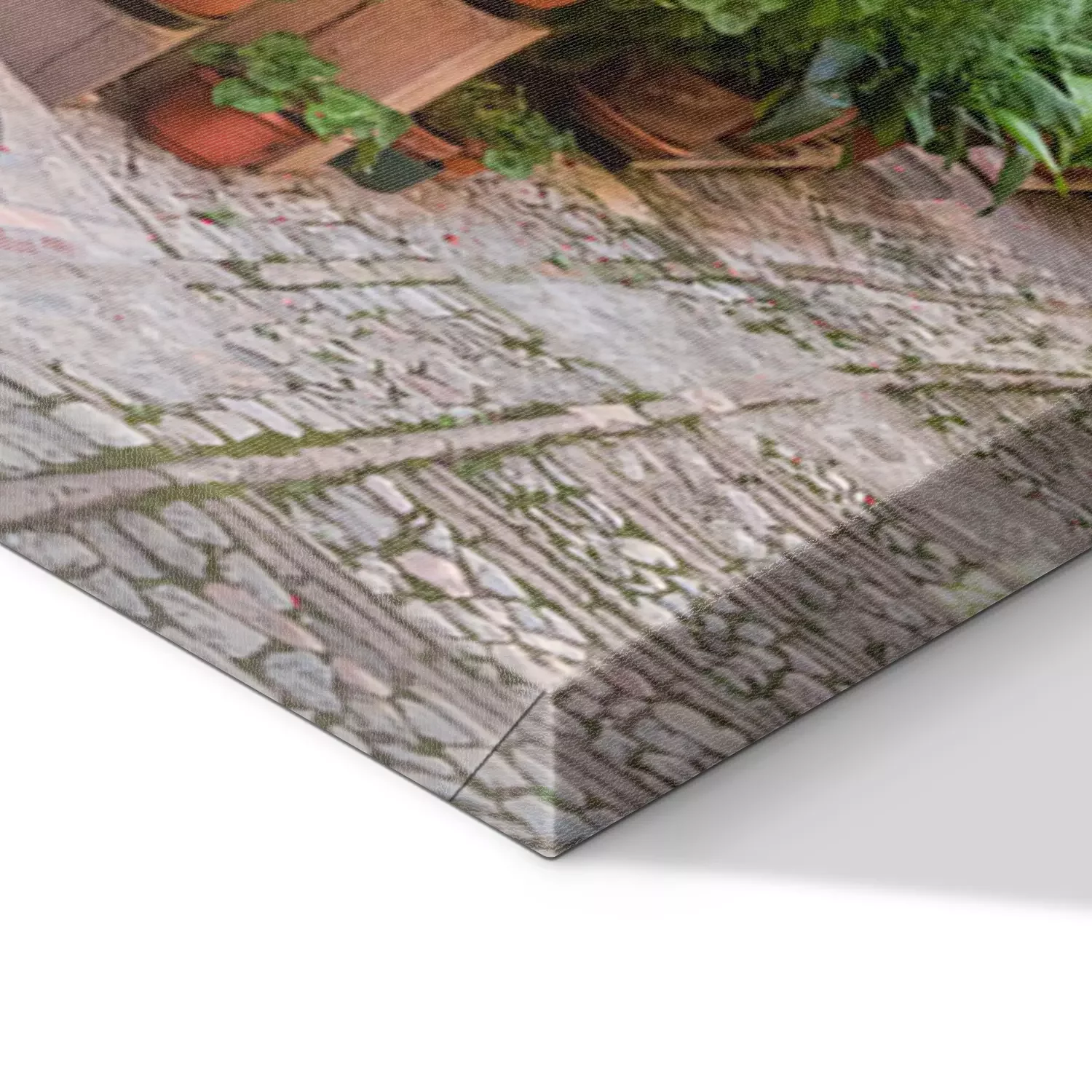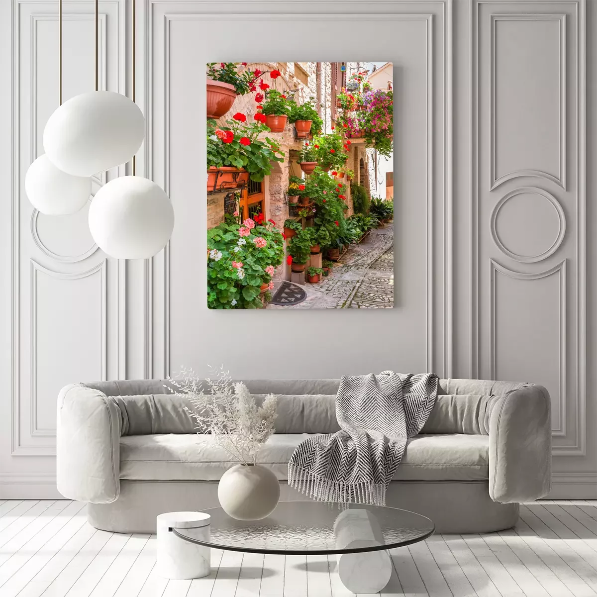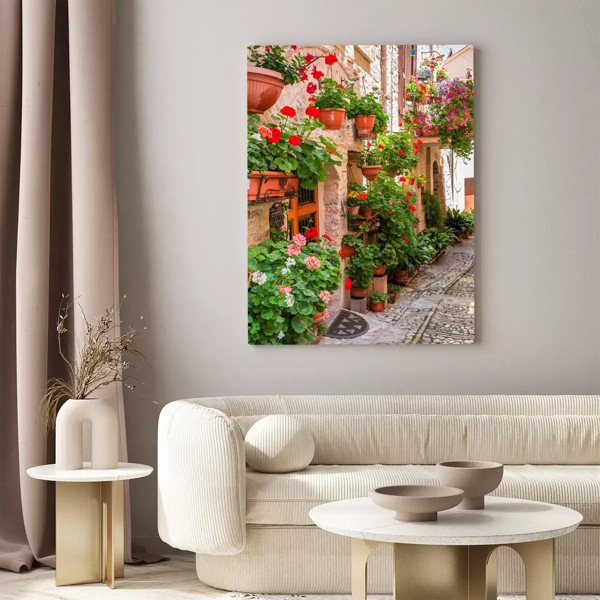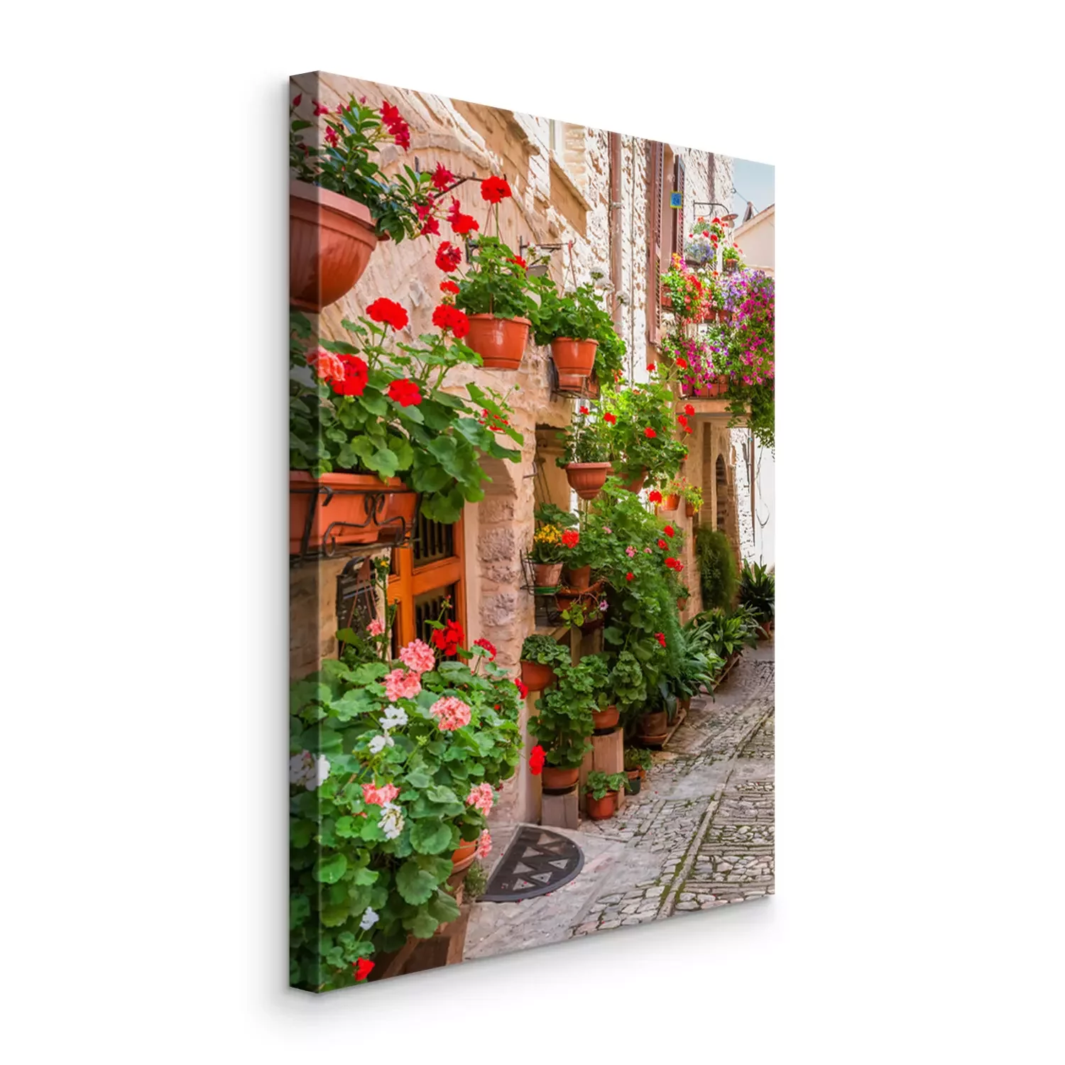 Canvas: Vol bloemen portiek in kleine stad in Italië, Umbrië