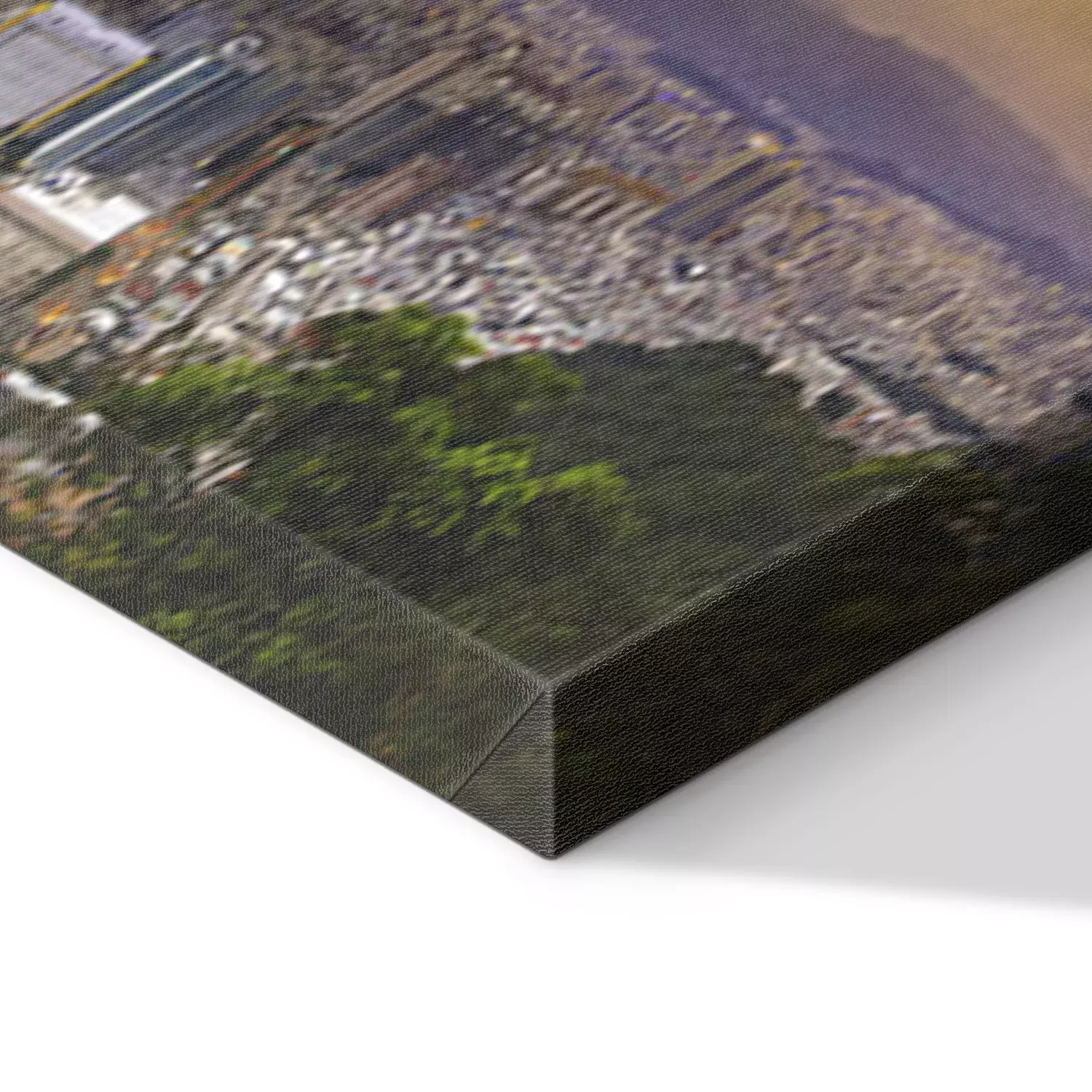 De print wordt aangebracht op hoogwaardig canvas dat op een schildersweefgetouw (spieraam) wordt gespannen. Omdat de print de zijranden bedekt, hoeft het ontwerp niet met een extra kader te worden omlijst. Wij raden ook composities aan die uit meerdere foto's bestaan en zo een coherente compositie vormen.
