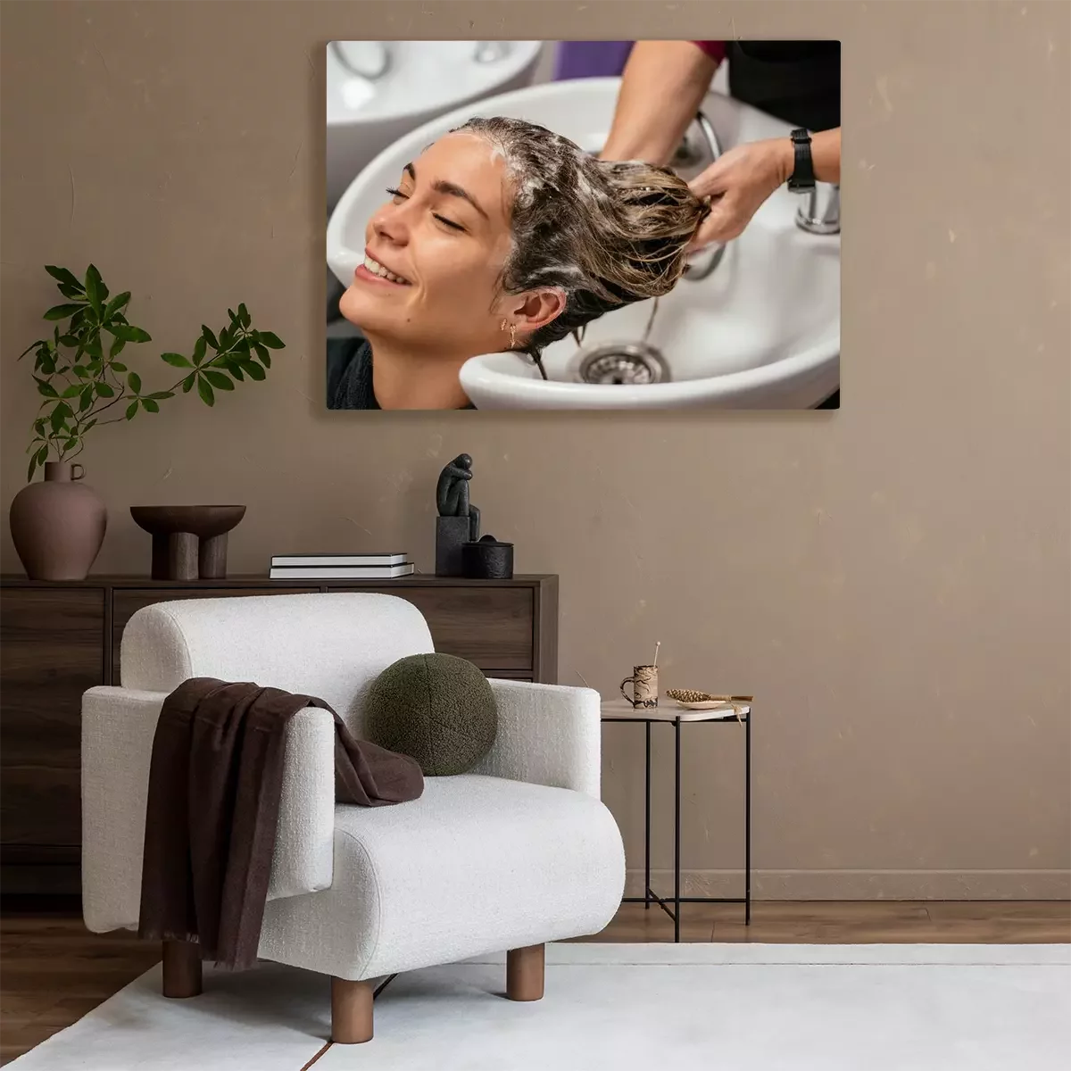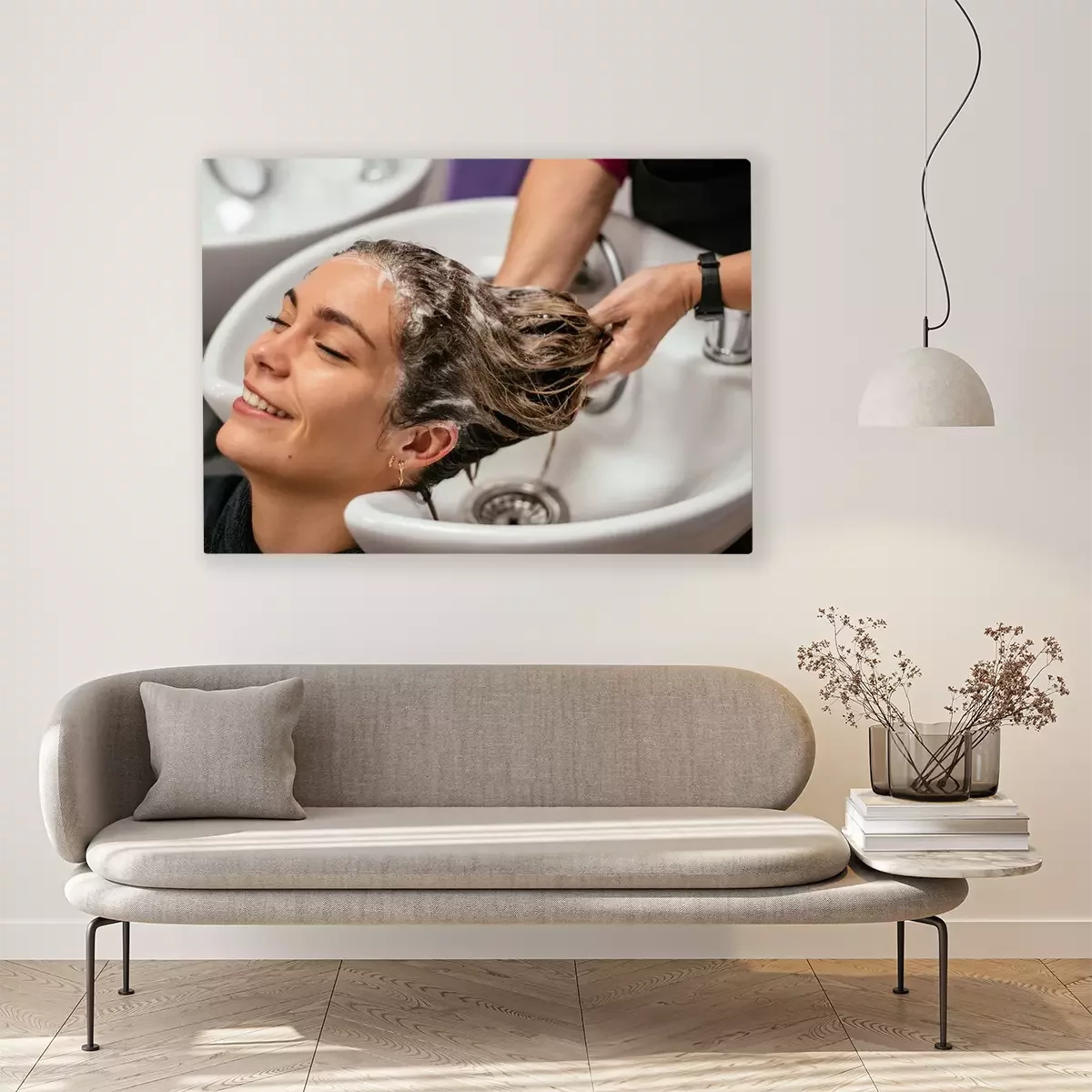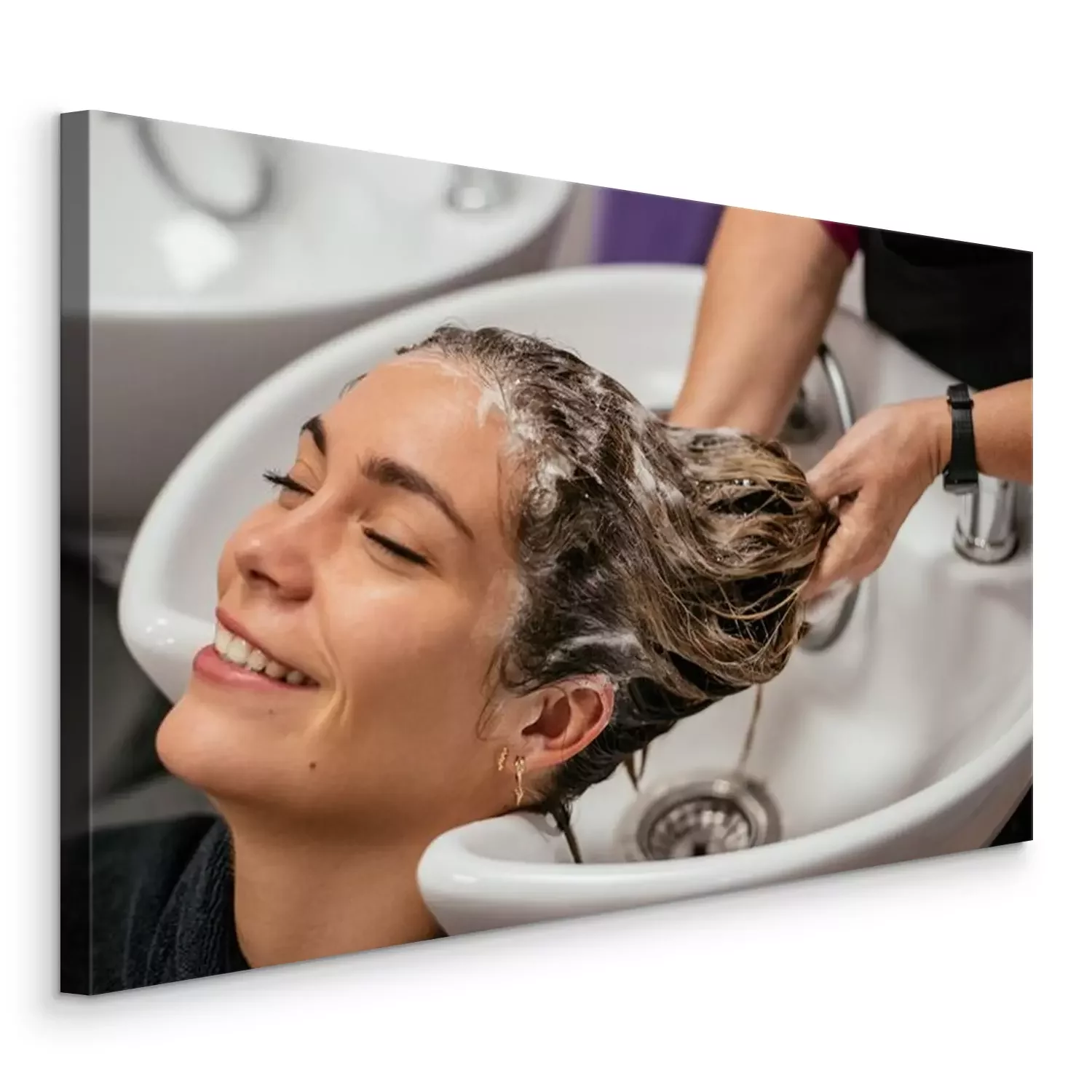 Canvas: Vrouw die haar haar heeft dat in een salon wordt gewassen