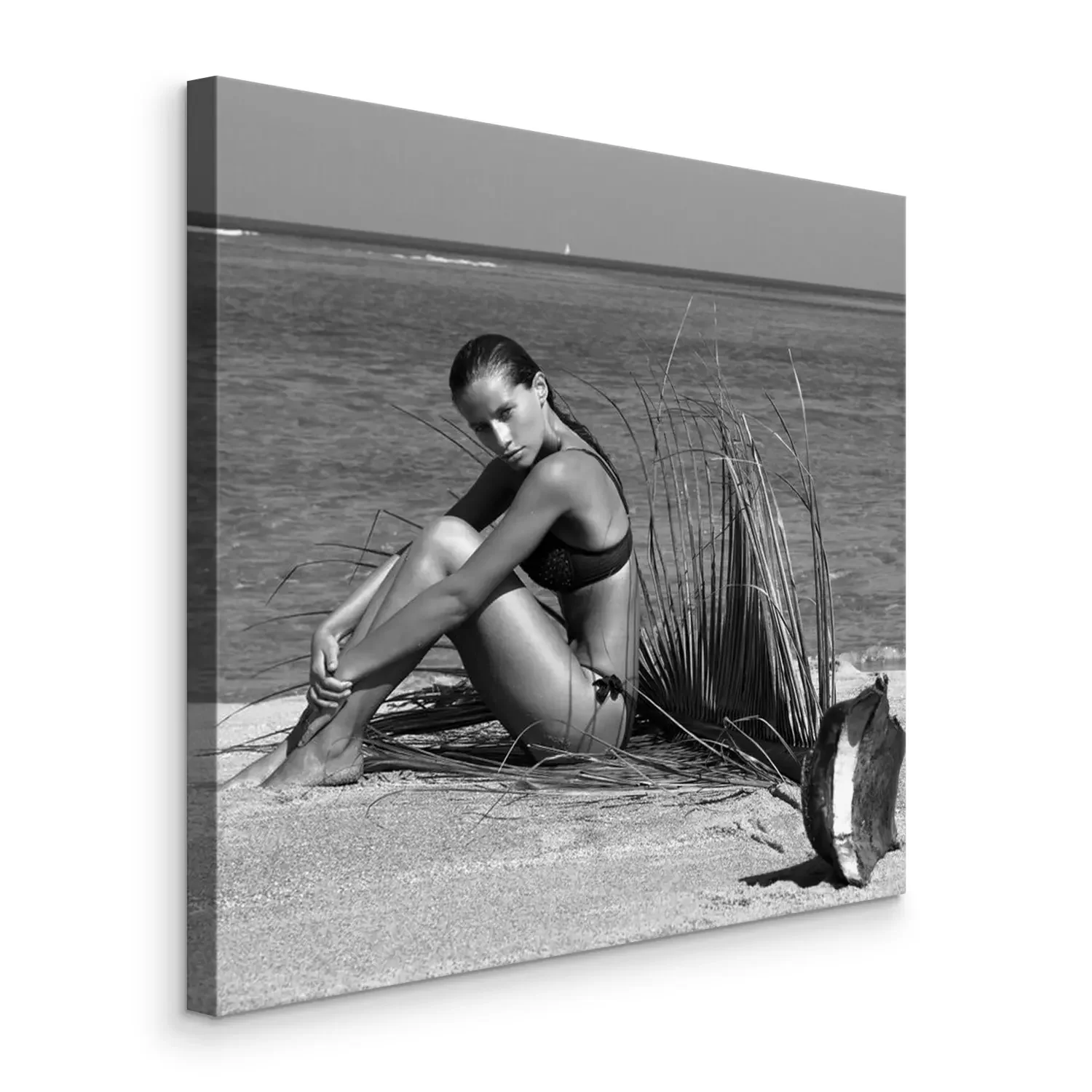 Canvas Vrouw in bikini met palmtak op het strand in de buurt van de zee te genieten van zon. Lang nat haar. Volume krullend kapsel. Tropen. Hete zomerdag. Sexy meisje. Vakantie. Foto van het eiland Phuket. T
