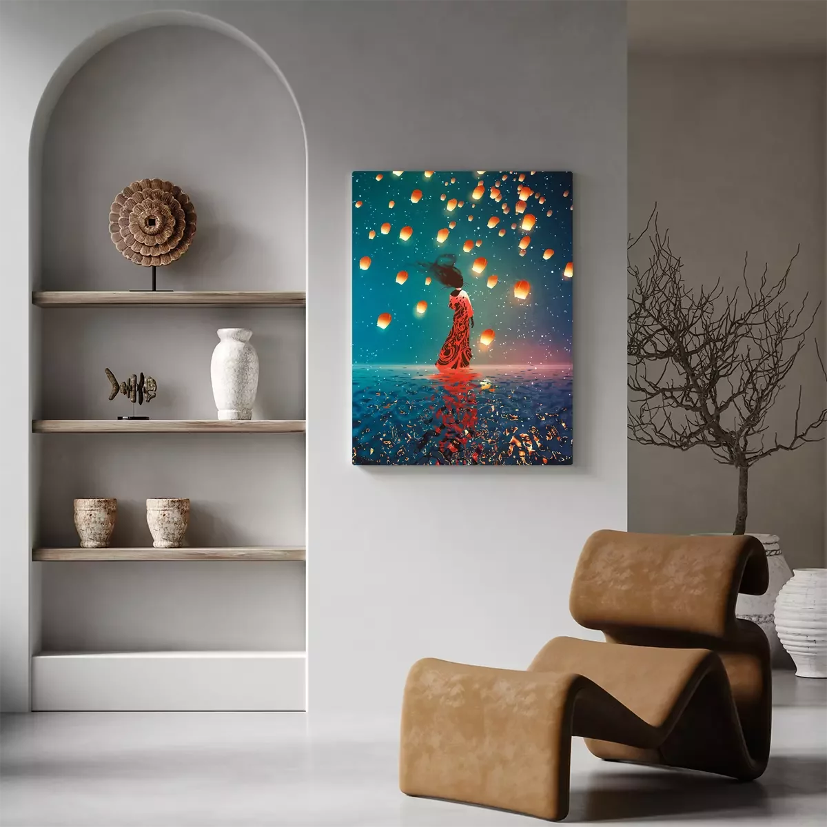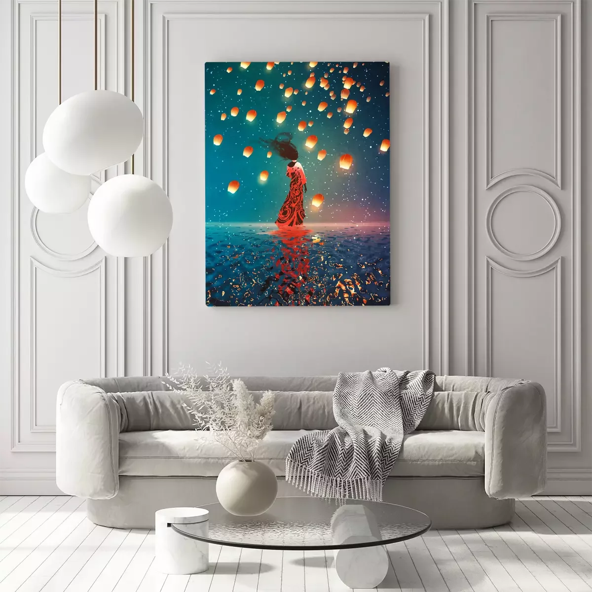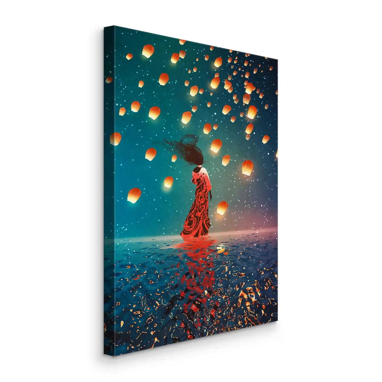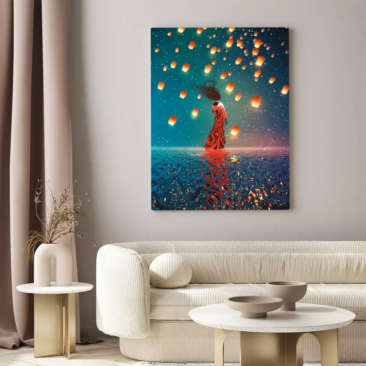 Canvas: vrouw in kleding die zich op het water tegen de lantaarns drijvend in een nachtelijke hemel, illustratie painting