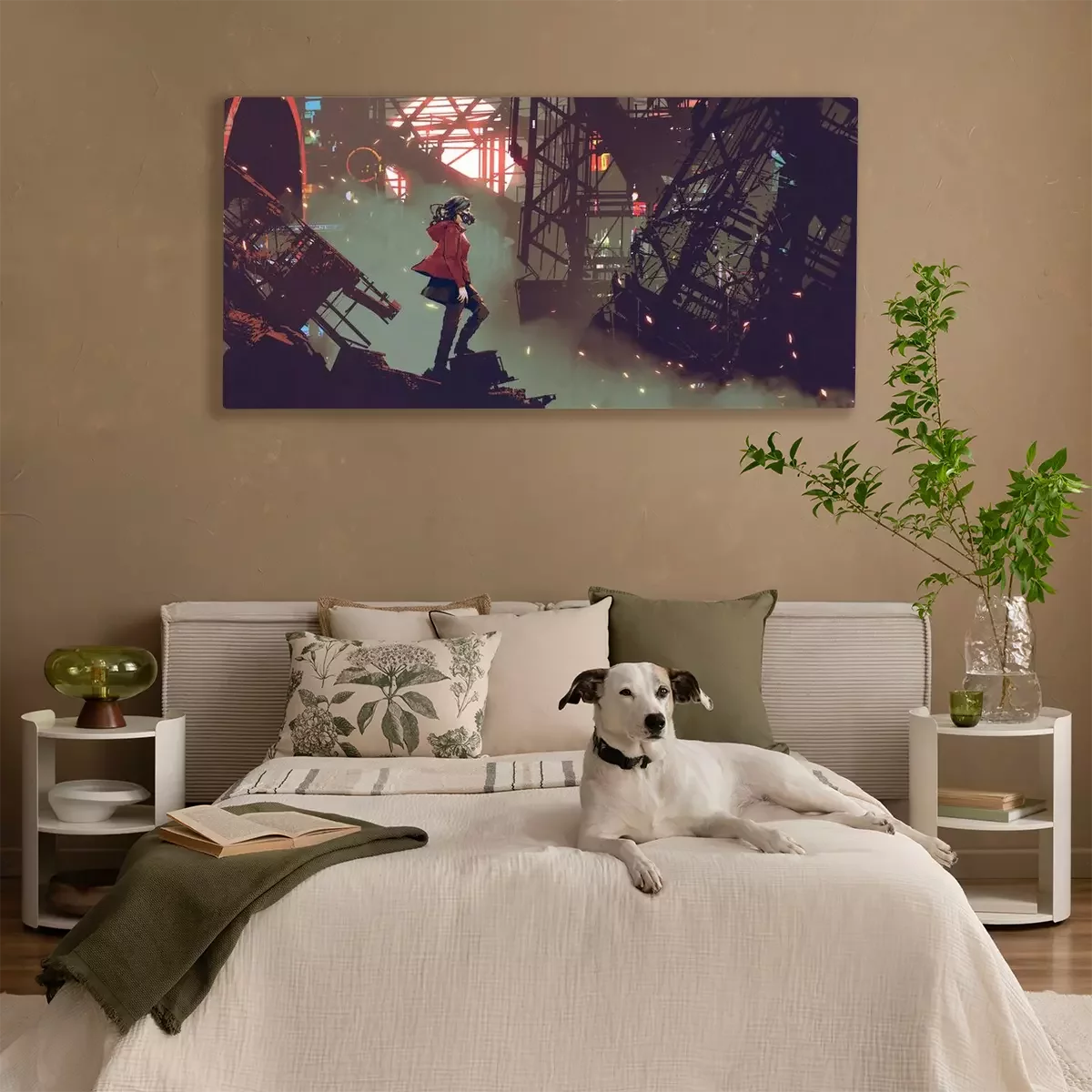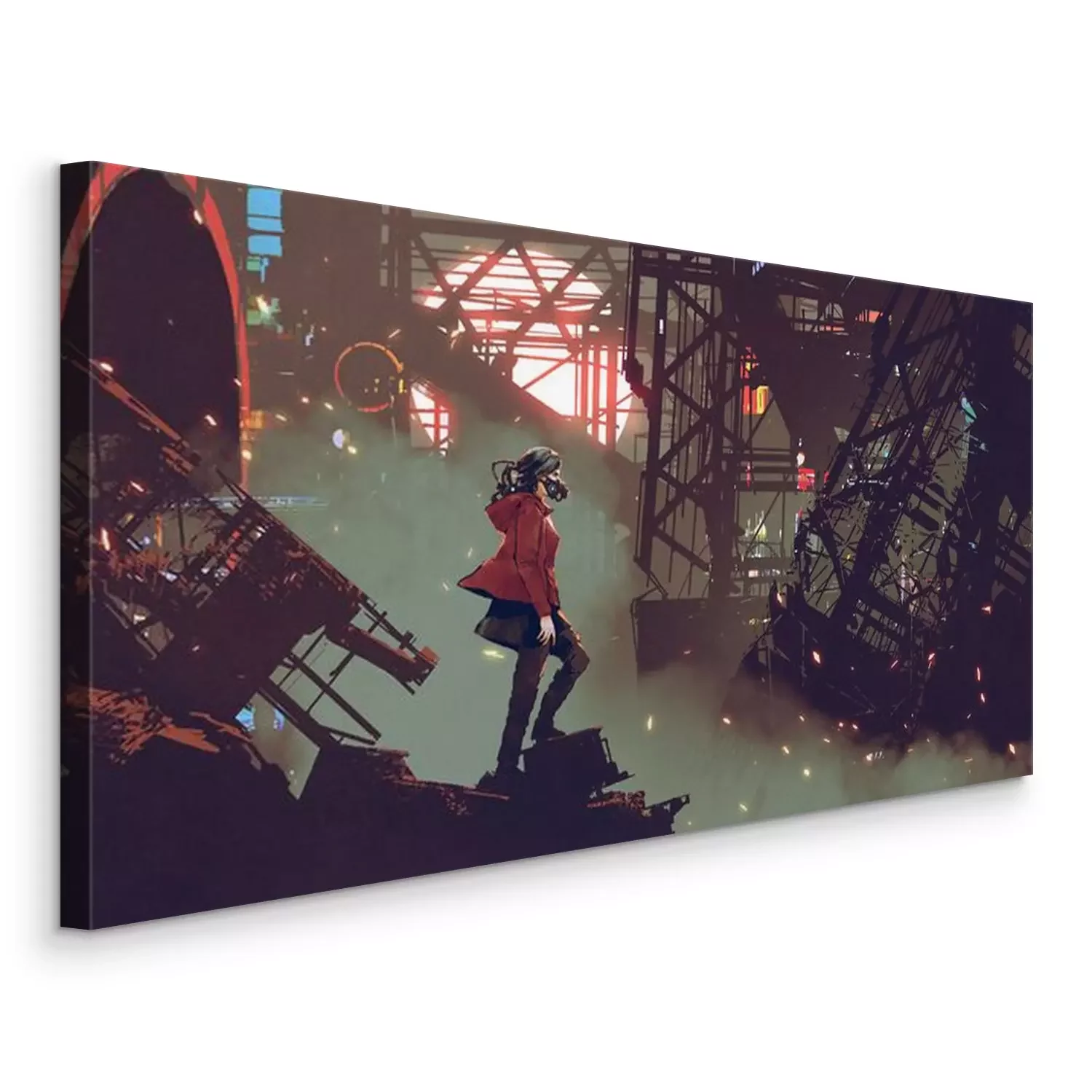 Canvas: vrouw met futuristisch masker die zich in de cyberpunkstad bevinden, digitale kunststijl, illustratie het schilderen