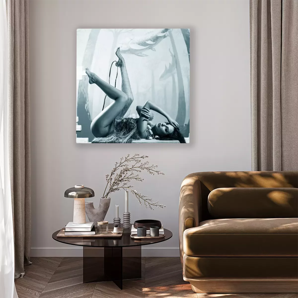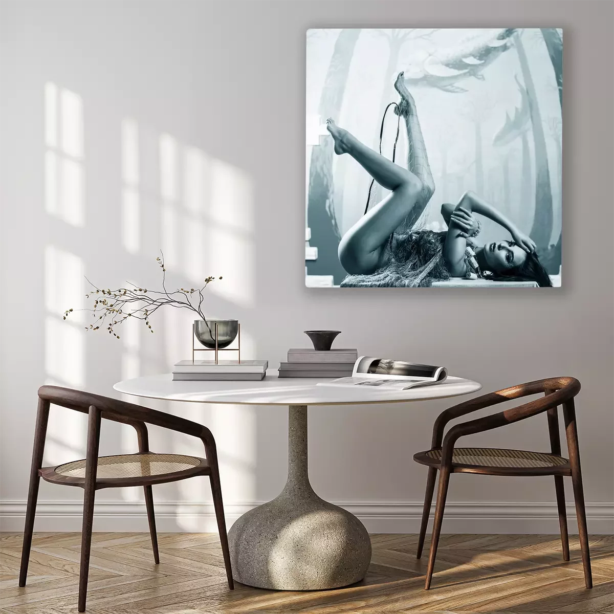 De print wordt aangebracht op hoogwaardig canvas dat op een schildersweefgetouw (spieraam) wordt gespannen. Omdat de print de zijranden bedekt, hoeft het ontwerp niet met een extra kader te worden omlijst. Wij raden ook composities aan die uit meerdere foto's bestaan en zo een coherente compositie vormen.