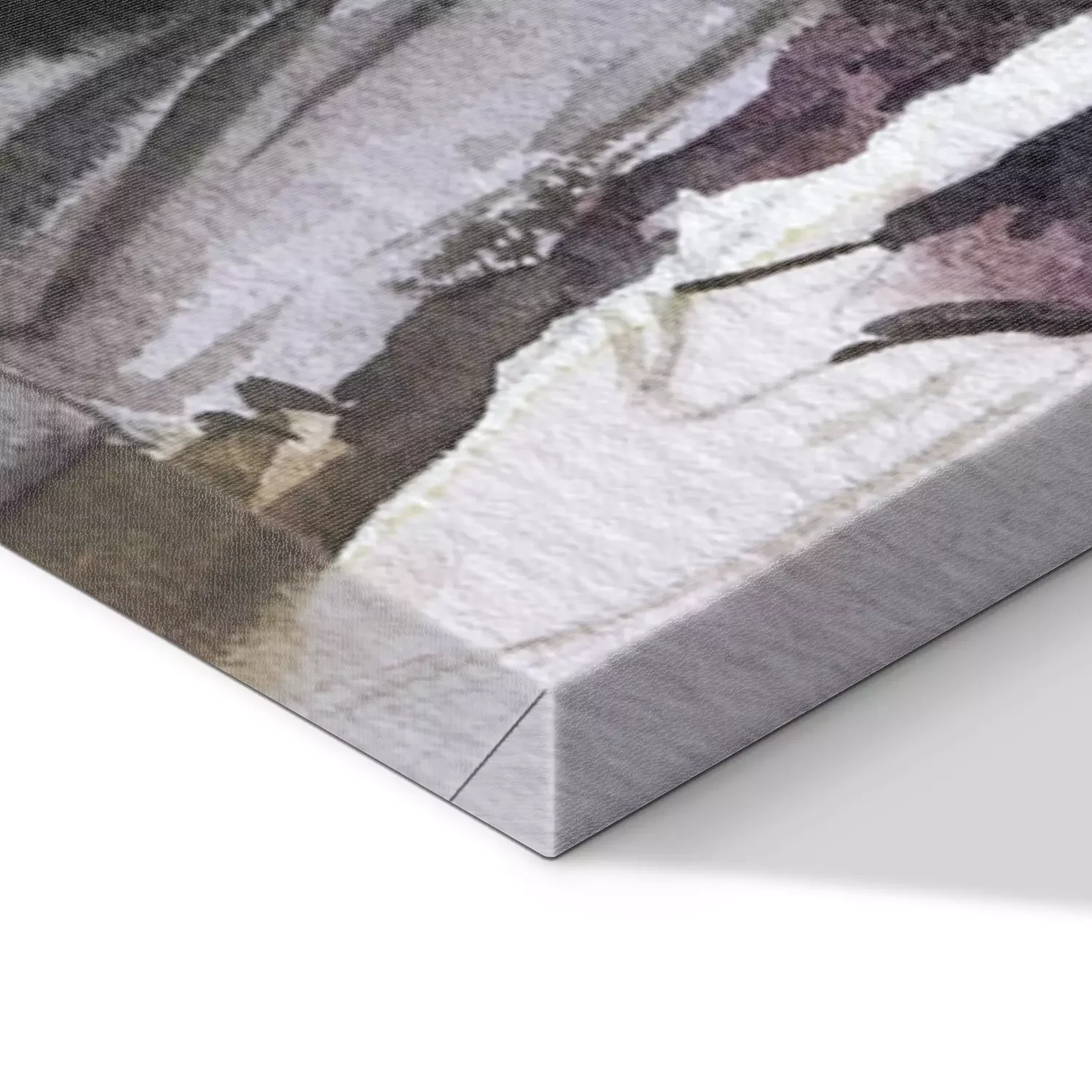 De print wordt aangebracht op hoogwaardig canvas dat op een schildersweefgetouw (spieraam) wordt gespannen. Omdat de print de zijranden bedekt, hoeft het ontwerp niet met een extra kader te worden omlijst. Wij raden ook composities aan die uit meerdere foto's bestaan en zo een coherente compositie vormen.