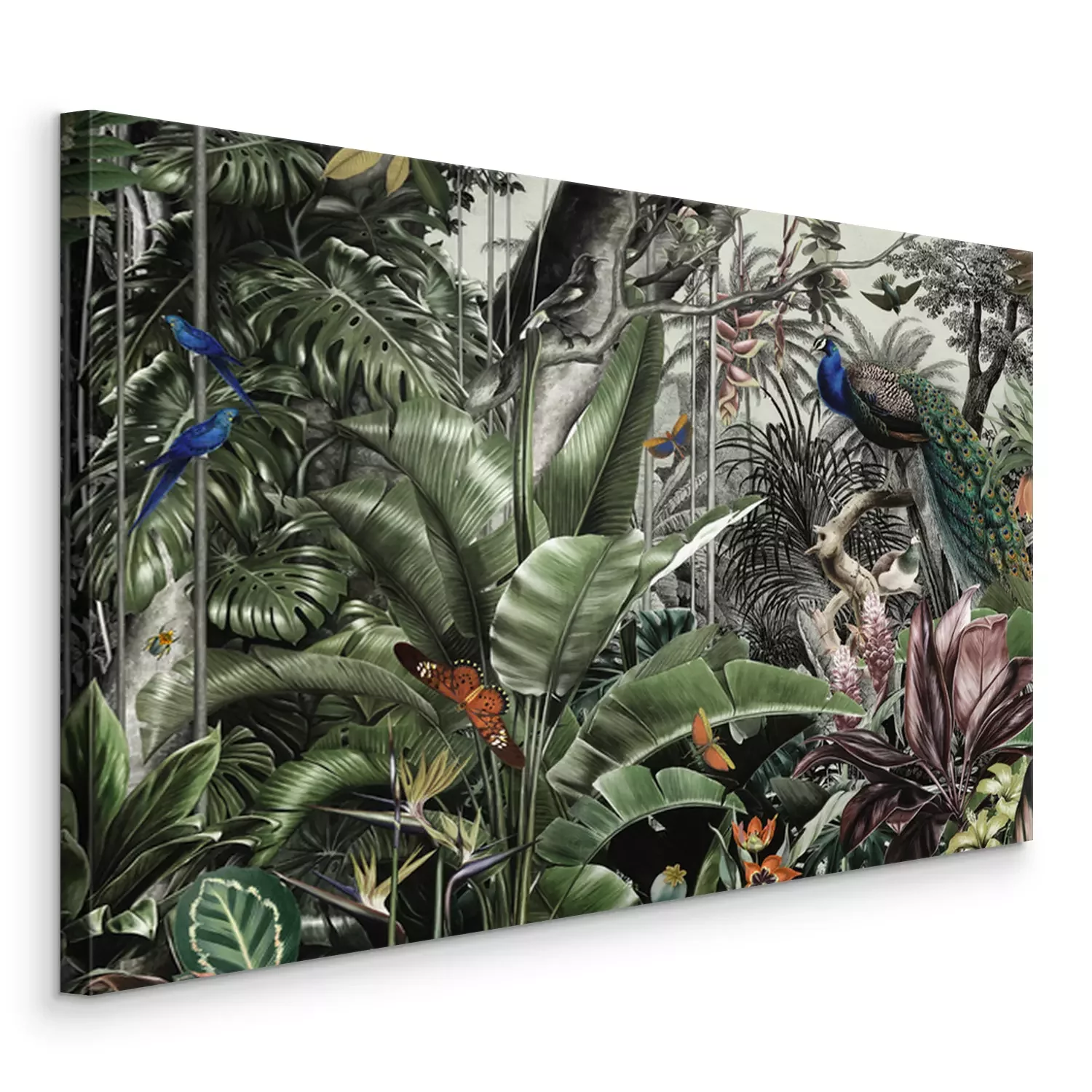 Canvas: wallpaper jungle and tropical forest flamngo and tropical birds, old drawing vintage peacock