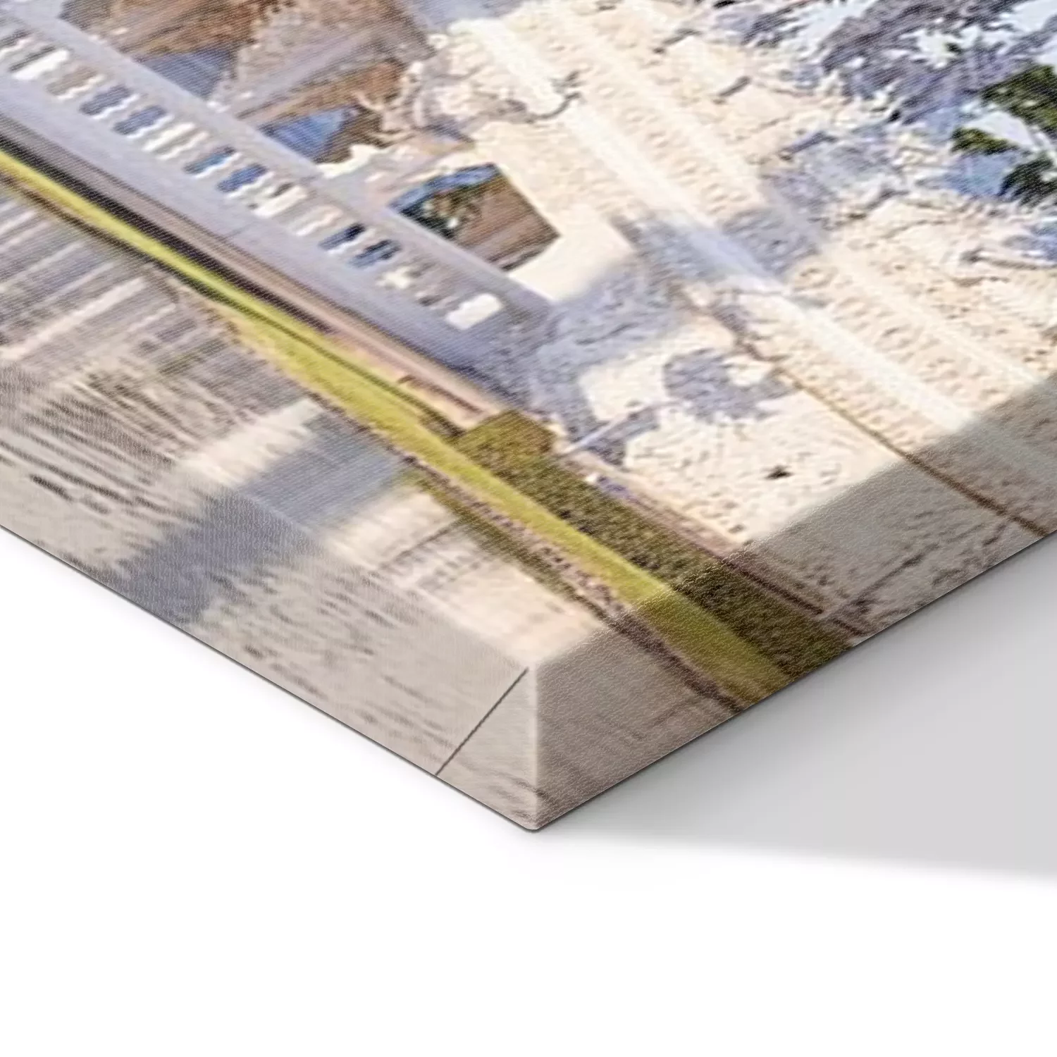 De print wordt aangebracht op hoogwaardig canvas dat op een schildersweefgetouw (spieraam) wordt gespannen. Omdat de print de zijranden bedekt, hoeft het ontwerp niet met een extra kader te worden omlijst. Wij raden ook composities aan die uit meerdere foto's bestaan en zo een coherente compositie vormen.
