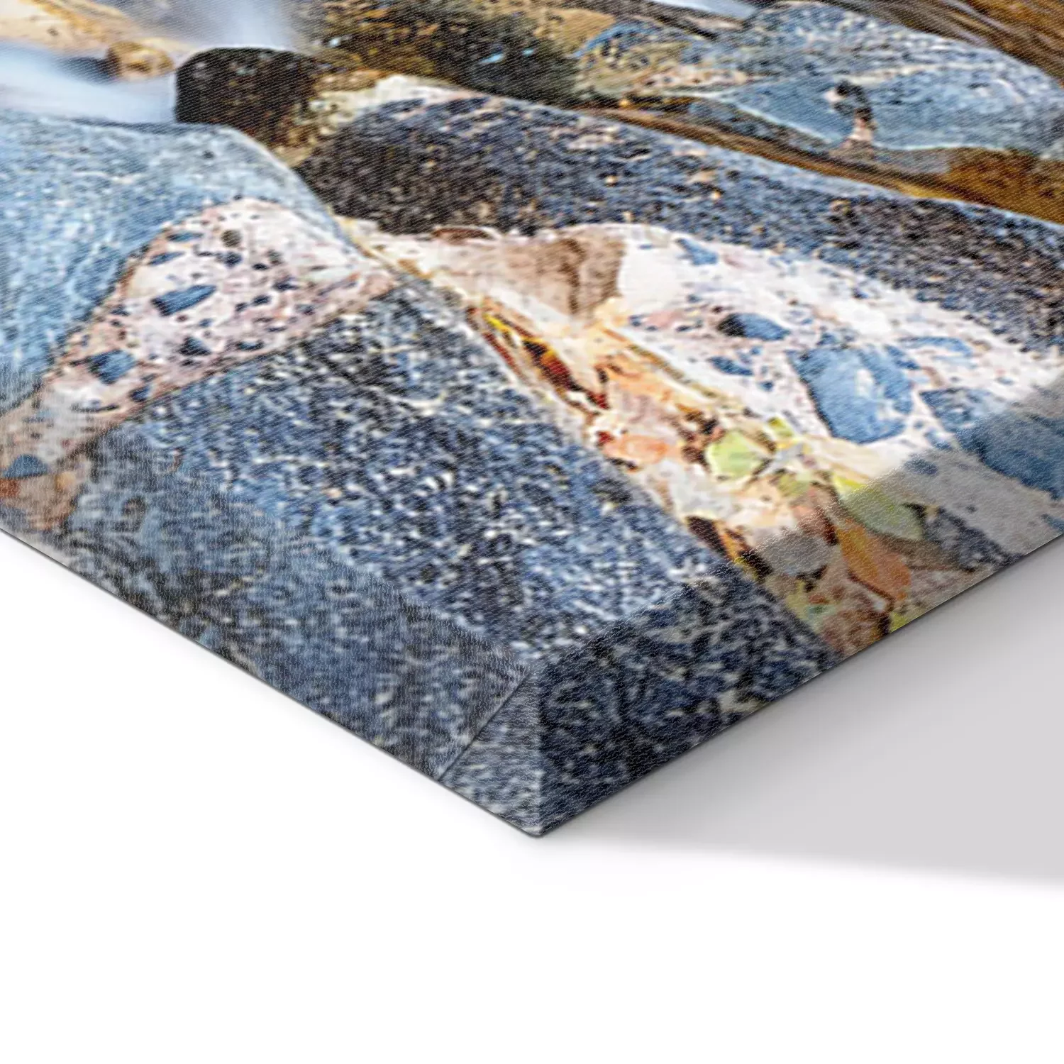 De print wordt aangebracht op hoogwaardig canvas dat op een schildersweefgetouw (spieraam) wordt gespannen. Omdat de print de zijranden bedekt, hoeft het ontwerp niet met een extra kader te worden omlijst. Wij raden ook composities aan die uit meerdere foto's bestaan en zo een coherente compositie vormen.