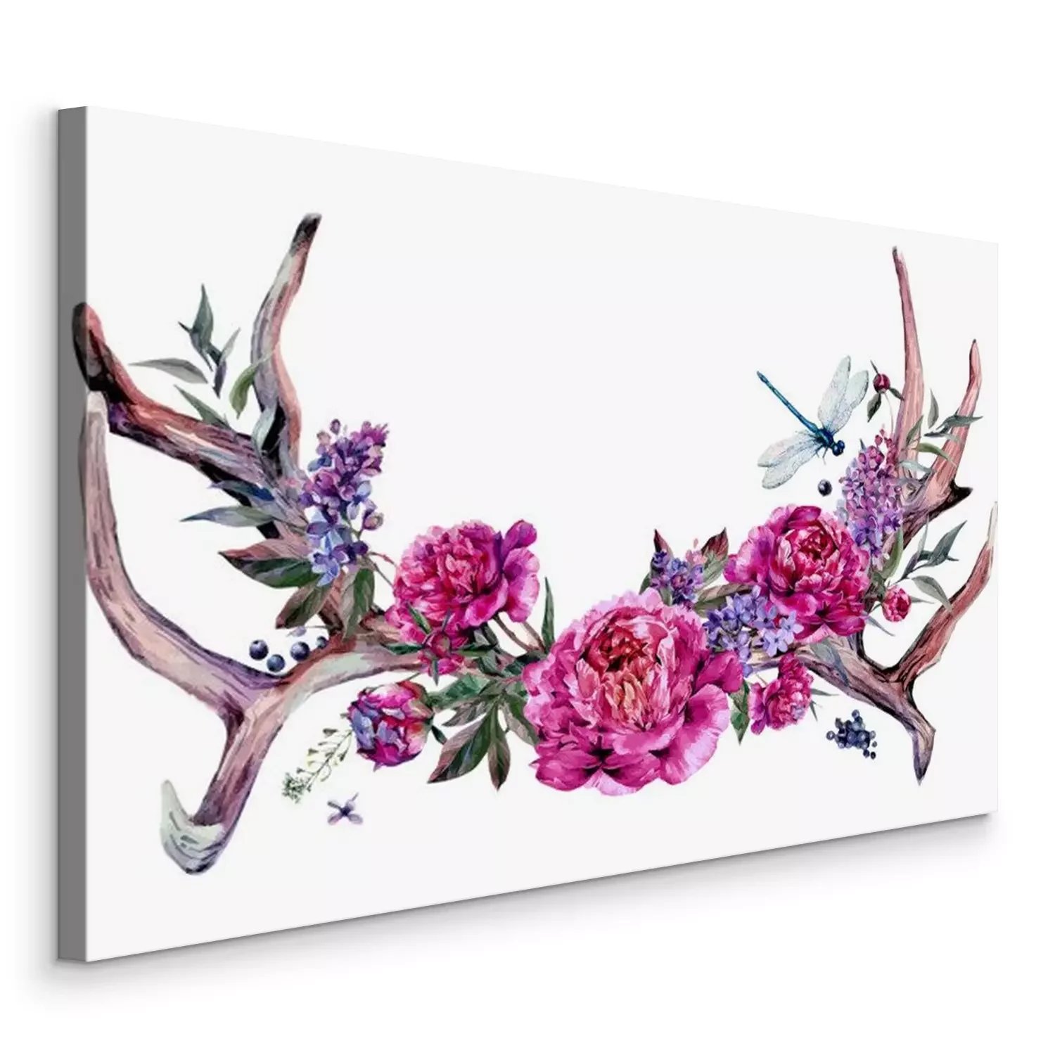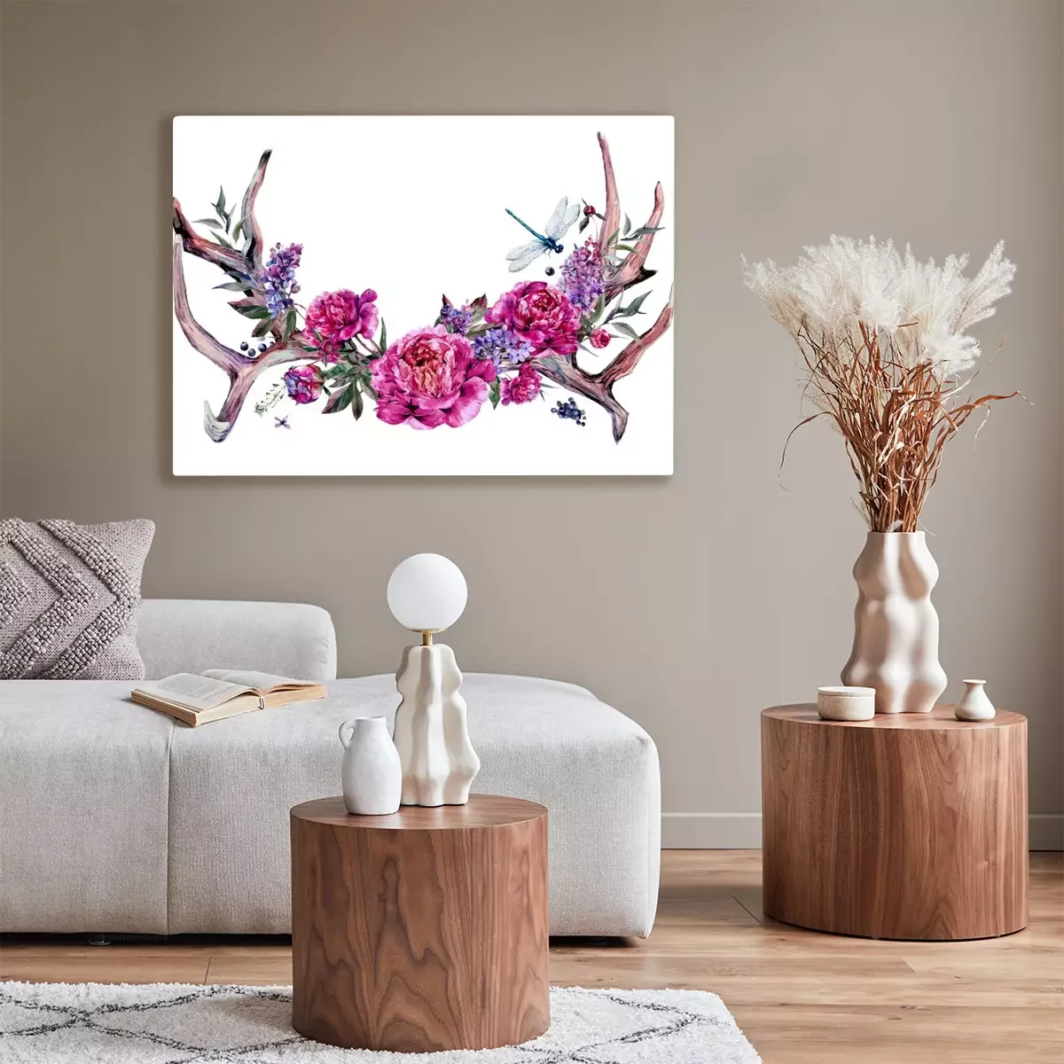 Canvas: Watercolor Antlers and Flowers. Boho Decoration.