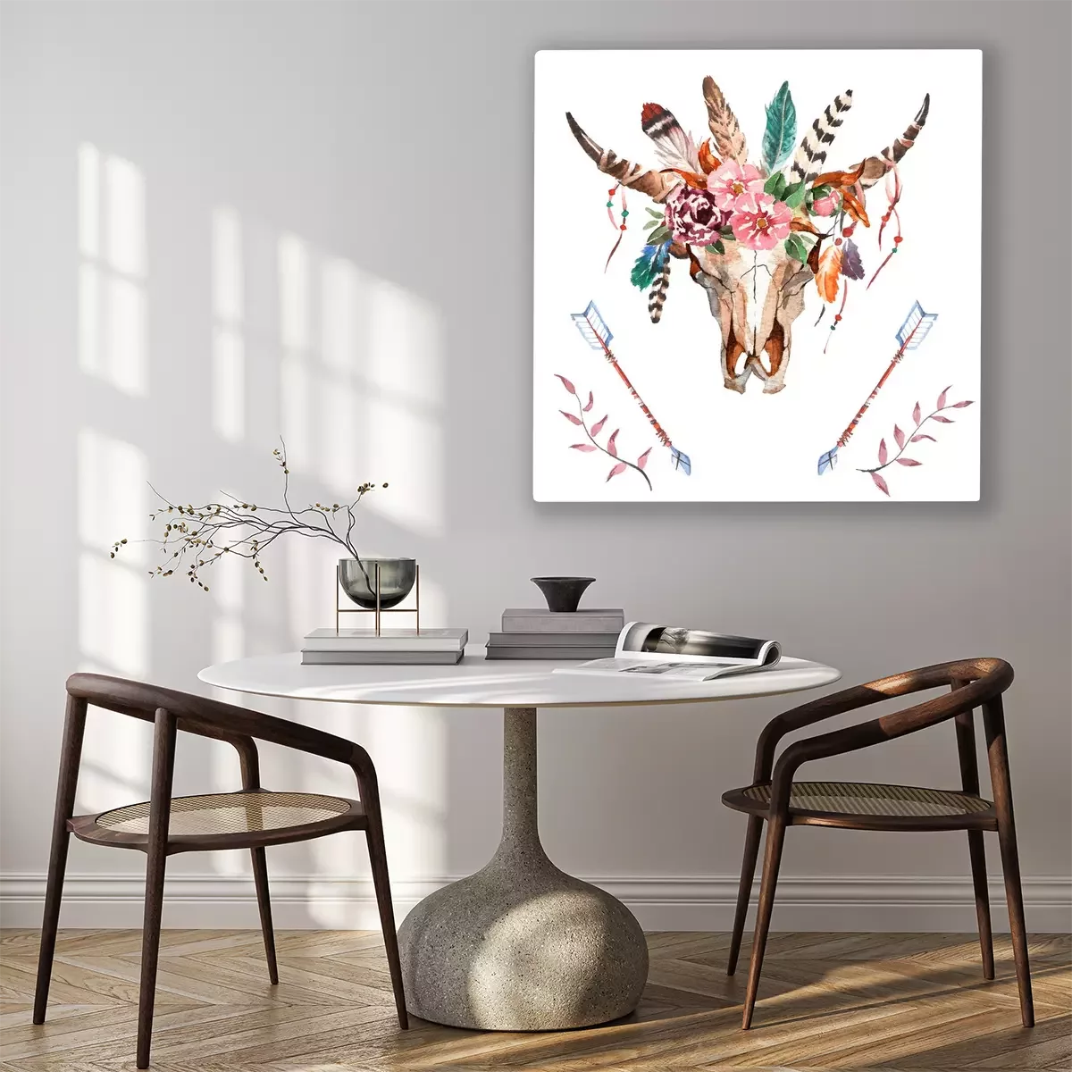 Canvas: Watercolor isolated bull's head with flowers and feathers on white background. Boho style. Skull for wrapping, wallpaper, t-shirts, textile, posters, cards, prints