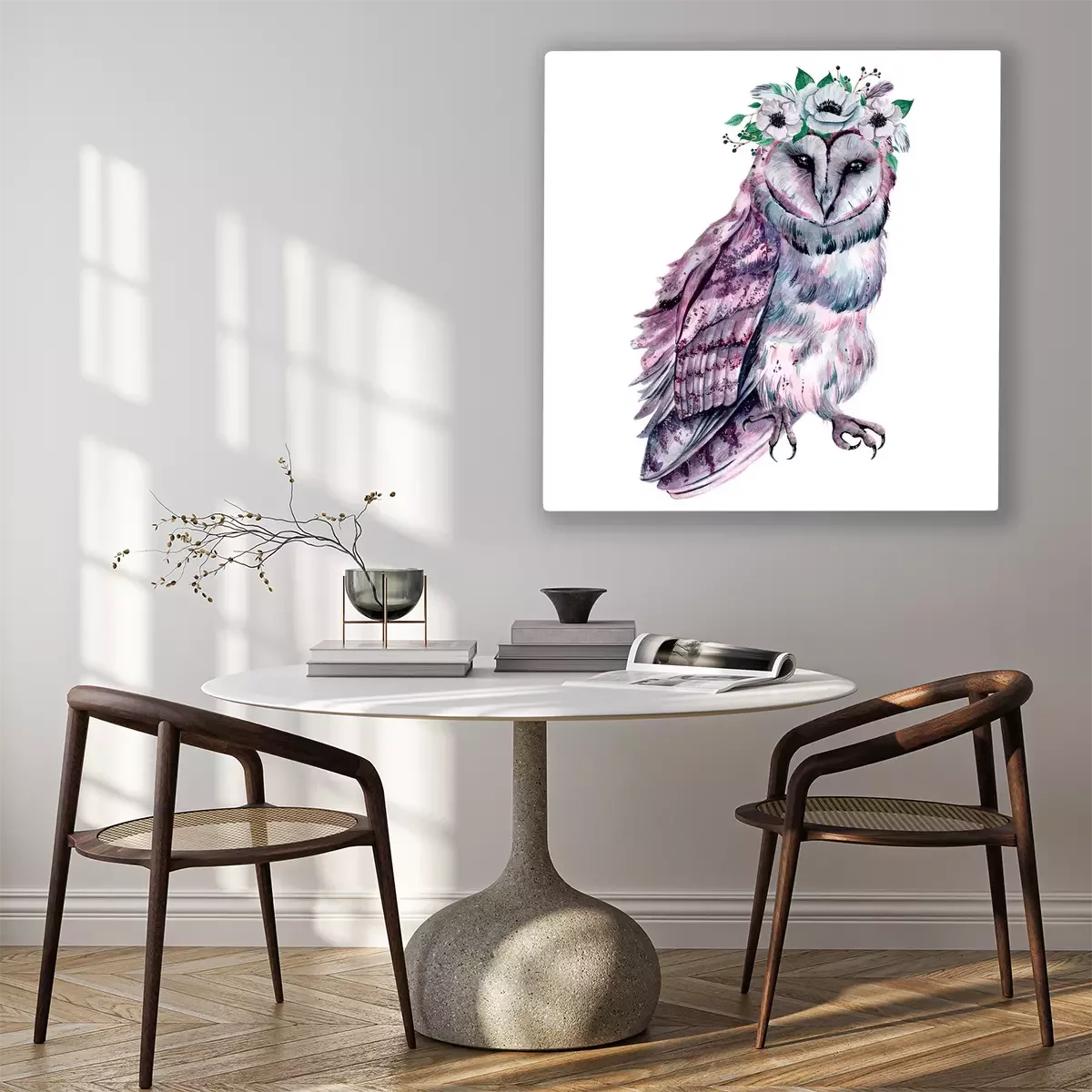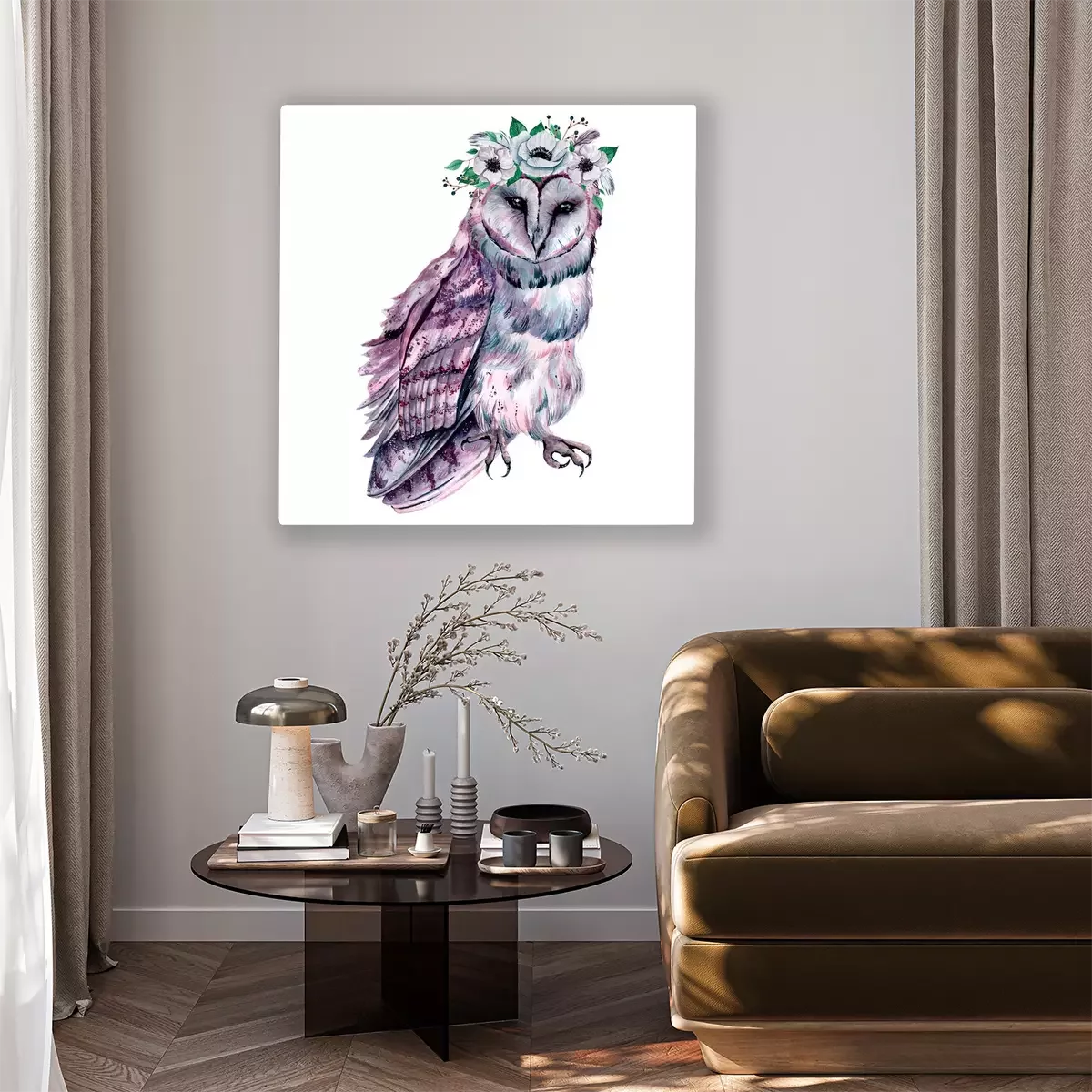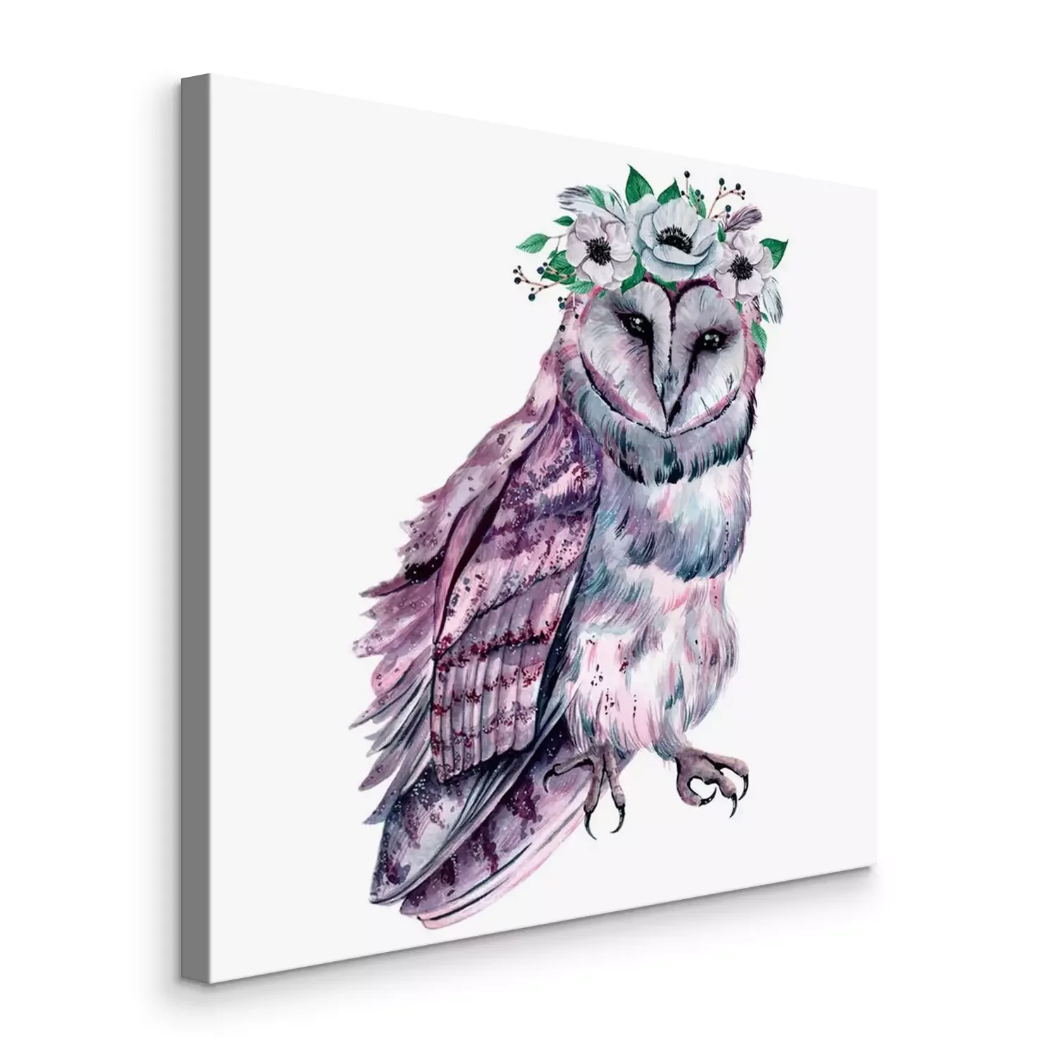 Canvas: Watercolor owl with flowers. Hand drawn illustration
