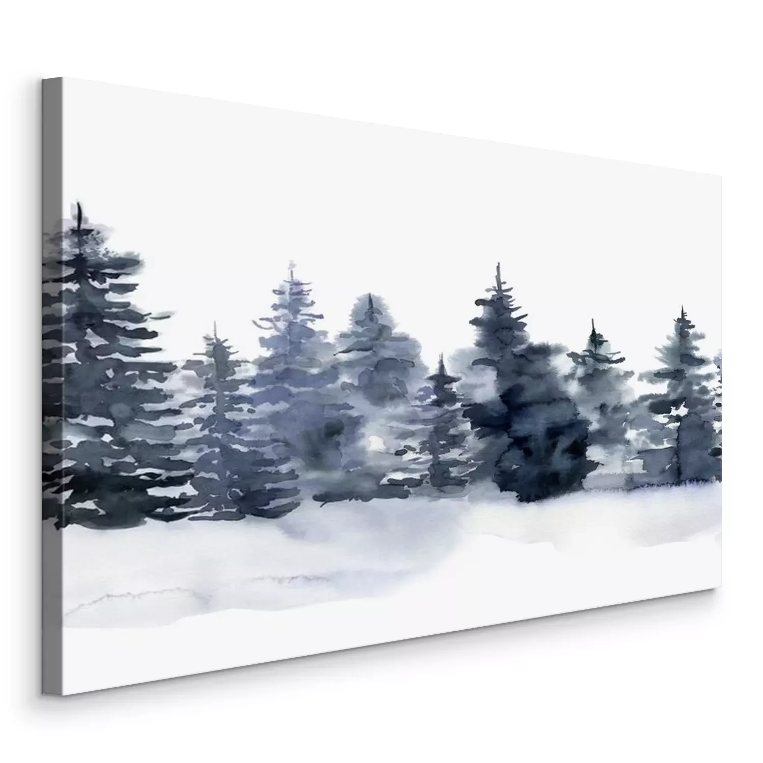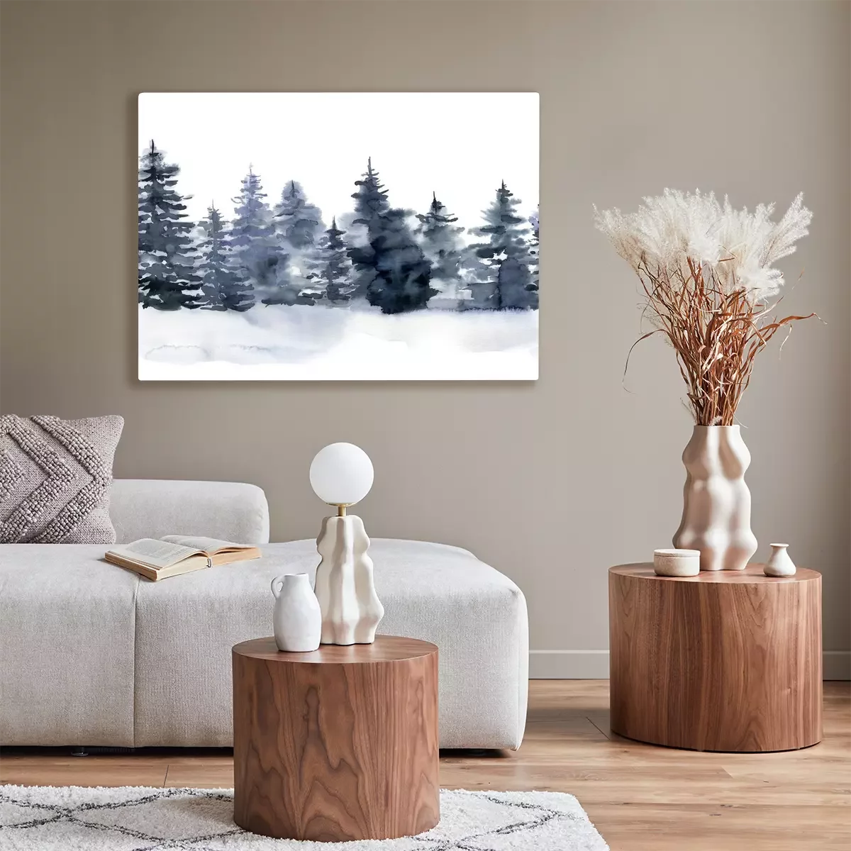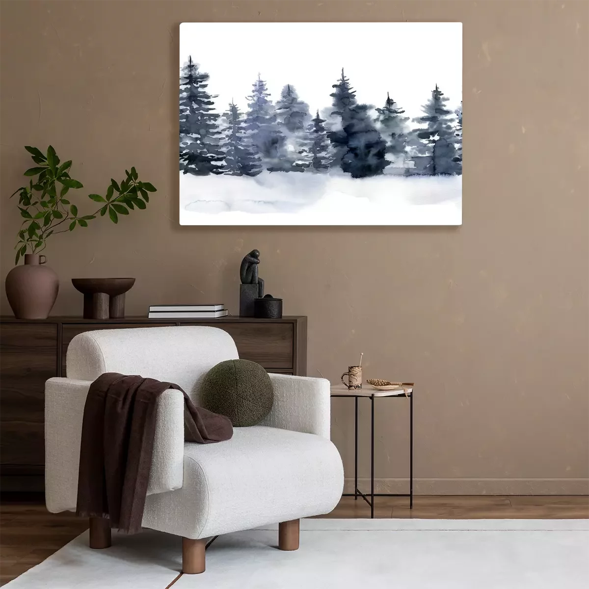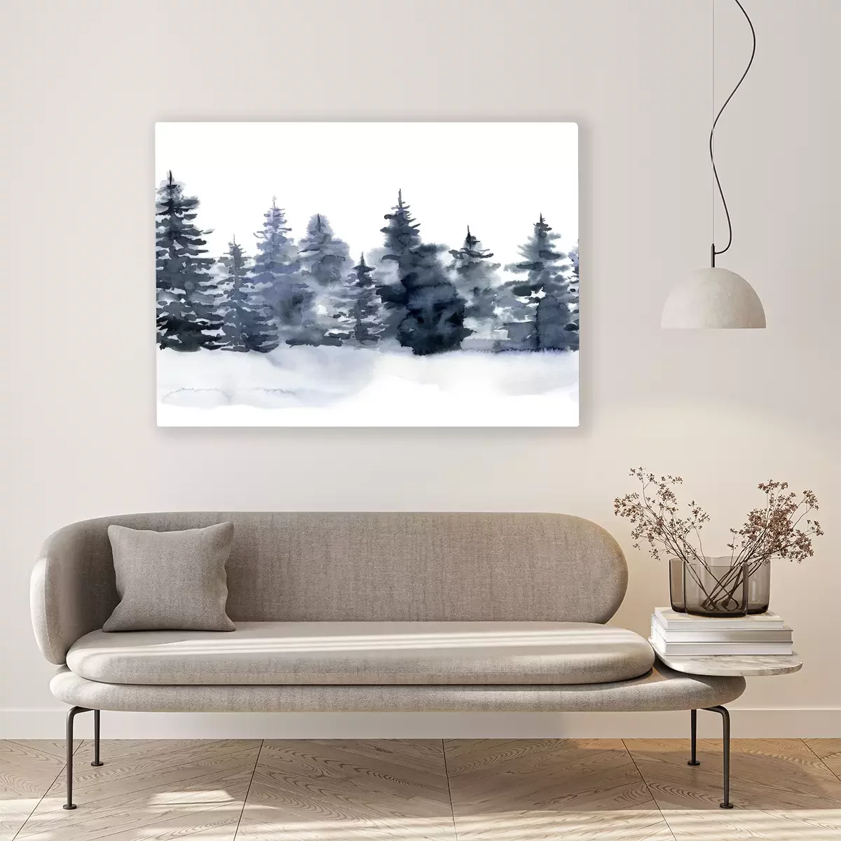 Canvas: Watercolor seamless border with winter forest. Hand painted foggy fir trees illustration isolated on white background. Holiday clip art for design, print, fabric or background. Christmas card.