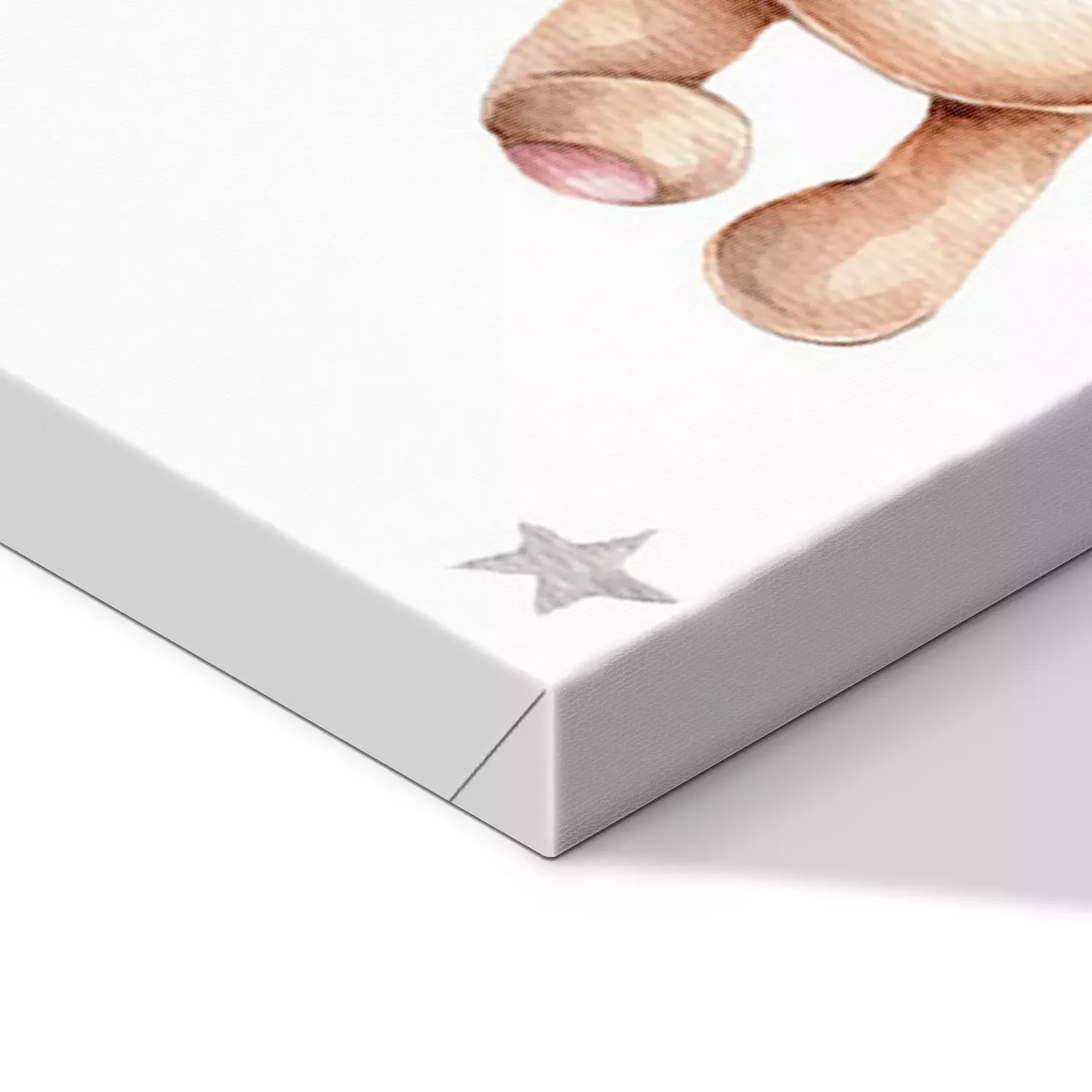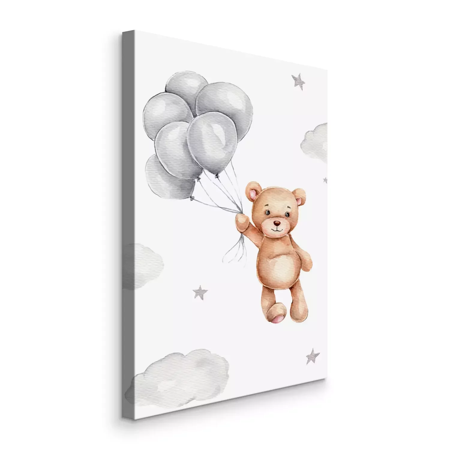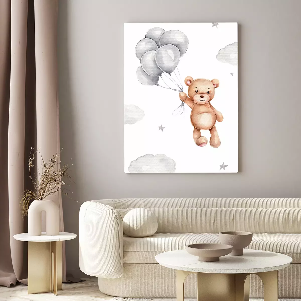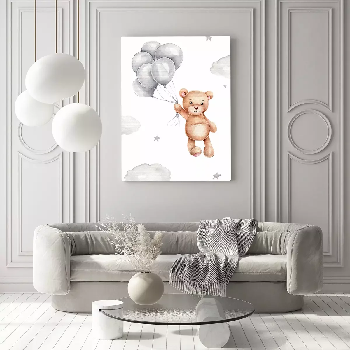 Canvas: Watercolor teddy bear and grey balloons; hand draw illustration; can be used for kid poster or card; with white isolated background