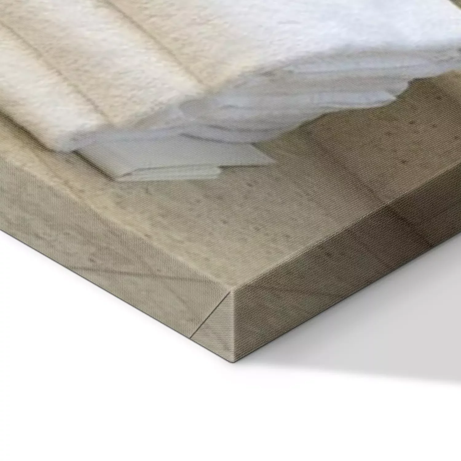 De print wordt aangebracht op hoogwaardig canvas dat op een schildersweefgetouw (spieraam) wordt gespannen. Omdat de print de zijranden bedekt, hoeft het ontwerp niet met een extra kader te worden omlijst. Wij raden ook composities aan die uit meerdere foto's bestaan en zo een coherente compositie vormen.